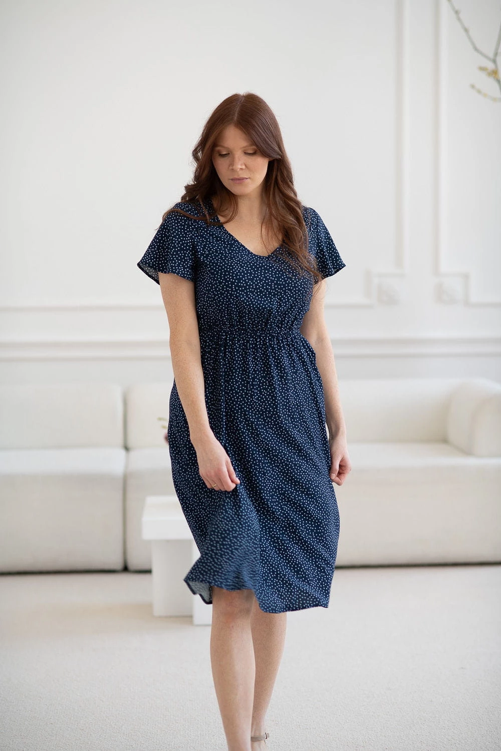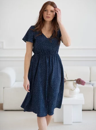 Sukienka ciążowa i do karmienia Lovely Dress Midi krótki rękaw granatowa w groszki