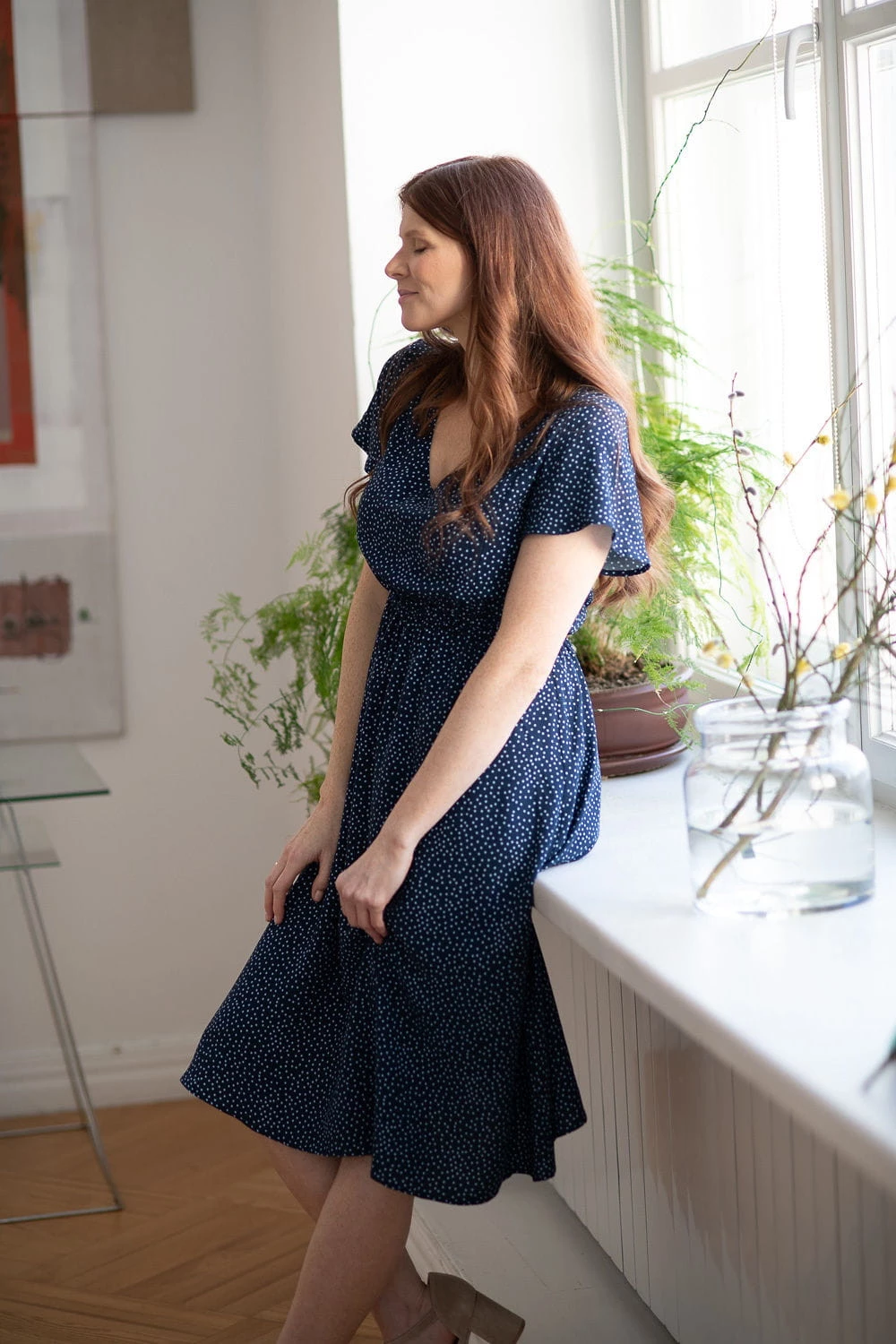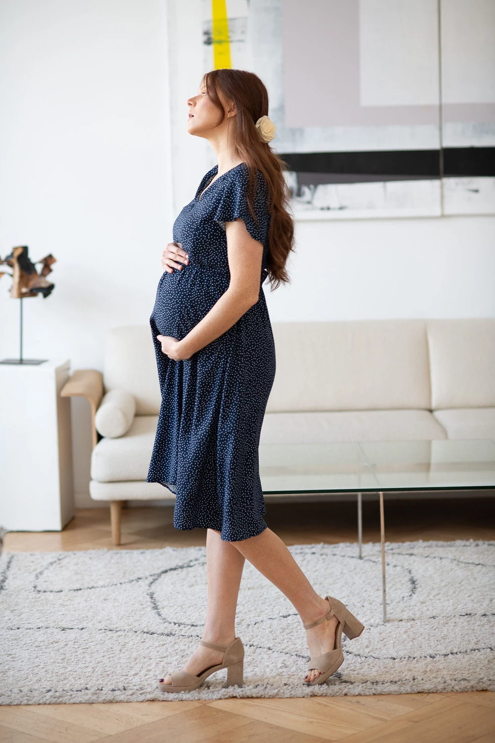 Lovely Dress to doskonały wybór na uroczystości rodzinne – sprawdzi się jako elegancka sukienka na chrzciny do karmienia, ale równie dobrze zaprezentuje się w casualowej stylizacji z trampkami, balerinami lub sandałami. To także piękna sukienka do sesji ciążowej, otulająca brzuszek i podkreślająca kobiecą sylwetkę.