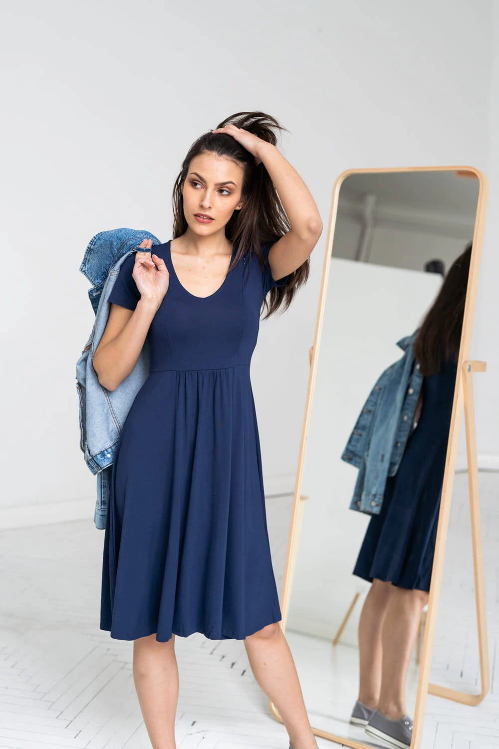 Doskonała inwestycja na lata, rozkloszowana granatowa sukienka do karmienia piersi to symbol kobiecości nie może go braknąć w Twojej garderobie zarówno ciążowej jak sukience dla mam która ułatwi okres karmienia piersią.