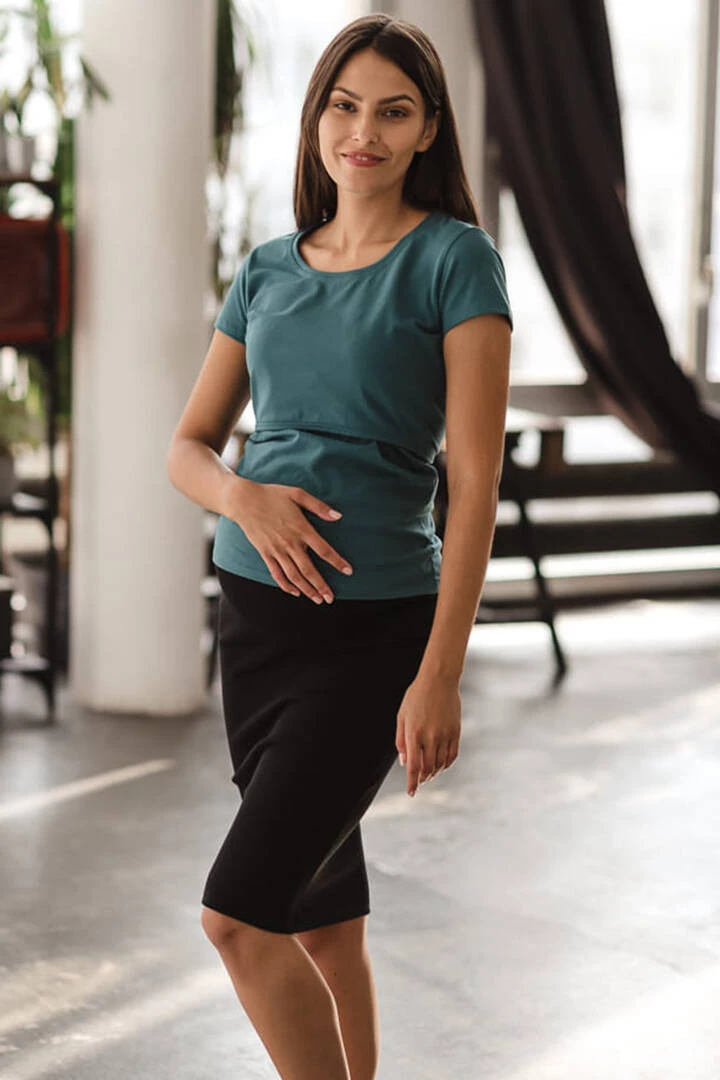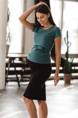 Ołówkowy krój czarnej spódnicy ciążowej czyni ją wszechstronną podstawą dla wielu stylizacji. Dopasowane spódnice ciążowe są idealne na co dzień, można je zestawiać zarówno z trampkami, balerinami, jak i szpilkami, w zależności od okazji. Miękka dzianina nie ogranicza ruchów, zapewniając swobodę podczas noszenia. Spódnicę można nosić naciągniętą na brzuszek lub, w cieplejsze dni, pod brzuszkiem jako spódnicę w długości midi.