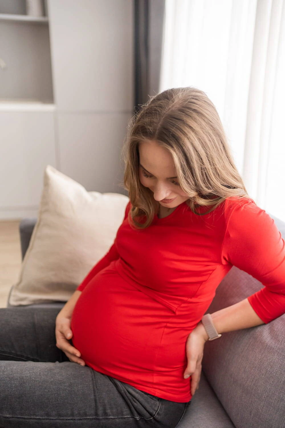 Kobieca bluzka ciążowa w w niebanalnym czerwonym kolorze, to propozycja z naszej kolekcji odzieży ciążowej obok której żadna modna Pani nie może przejść obojętnie!