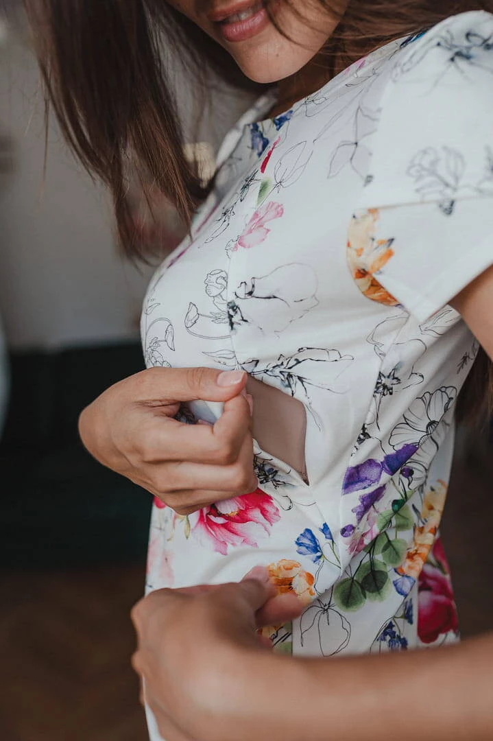 Wybierz jakość i wygodę. Wybierz sukienkę do karmienia Milky Dress w kolorowe kwiaty z krótkim rękawem. Sprawdź naszą kolekcję już dziś i zanurz się w świat modnej i funkcjonalnej odzieży dla karmiących mam!