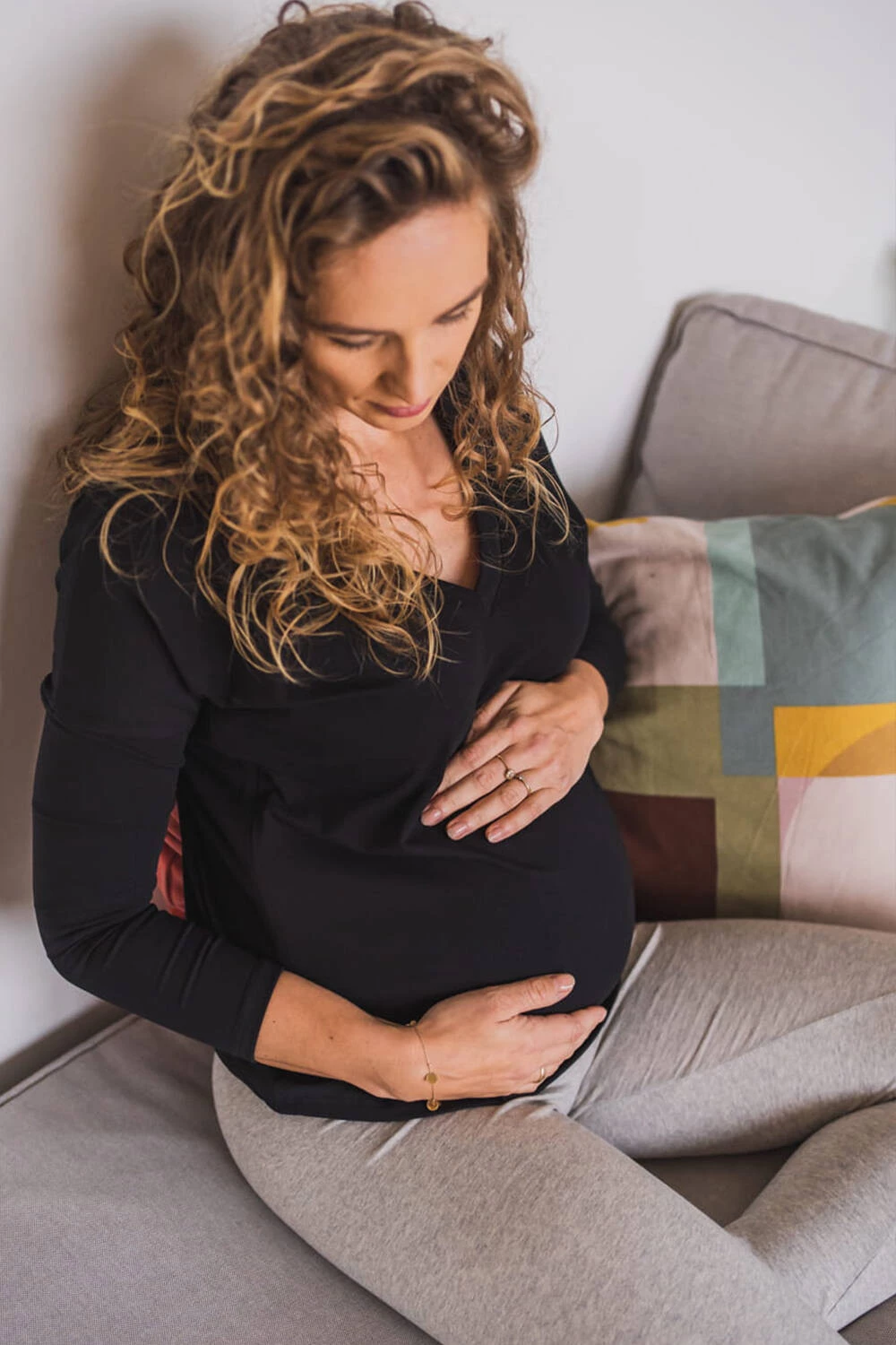 - Elastyczna dzianina dostosuje się do zmiany kształtu ciała w czasie ciąży.