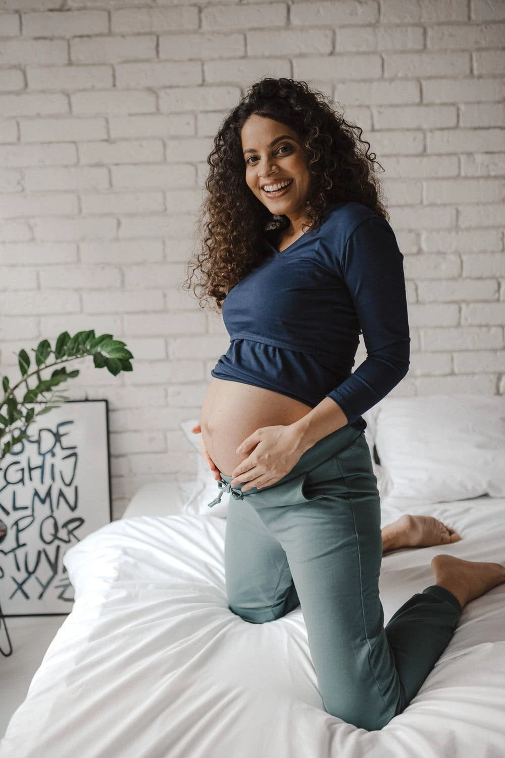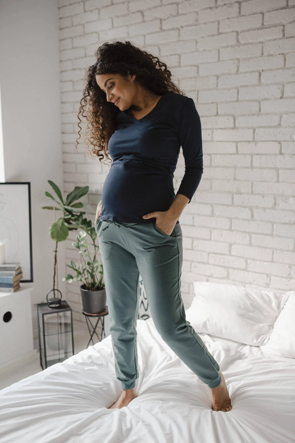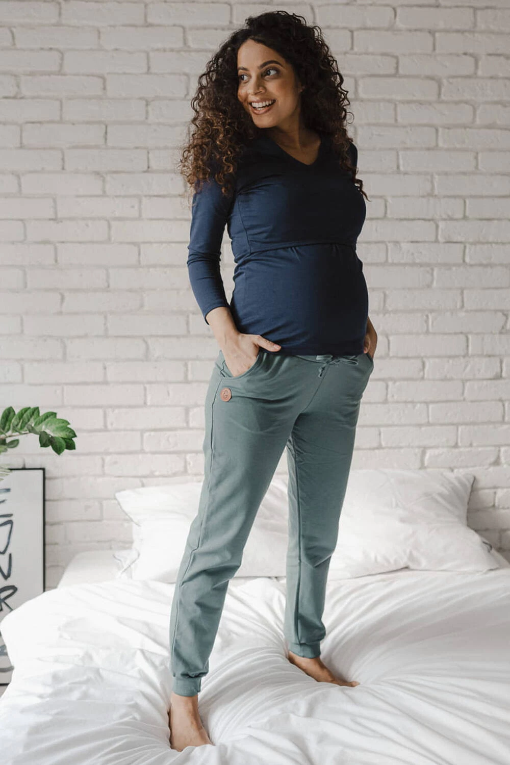 Jeśli oczekujesz dziecka i pragniesz nadal prezentować się kobieco i atrakcyjnie, ale też czuć się wygodnie - postaw na ubrania ciążowe najwyższej jakości. Odzież ciążowa zapewni Ci komfort i wsparcie dla rosnącego brzuszka, co staje się nieodzowne w tym wyjątkowym okresie. Idealne spodnie dresowe w odcieniu zieleni to proste rozwiązanie, zwłaszcza w ciepłe dni, gdy można je zestawić z delikatną bawełnianą koszulką. Komfortowe spodnie ciążowe staną się również niezastąpione w zimne dni, gdy połączysz je z ciepłą bluzą ciążową do karmienia z tej samej kolekcji. Praktyczne spodnie ciążowe stanowią kluczowy element w Twojej szafie podczas ciąży i po porodzie.