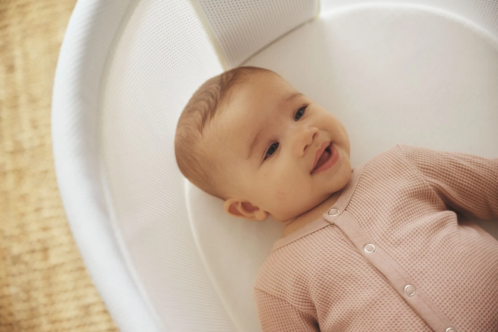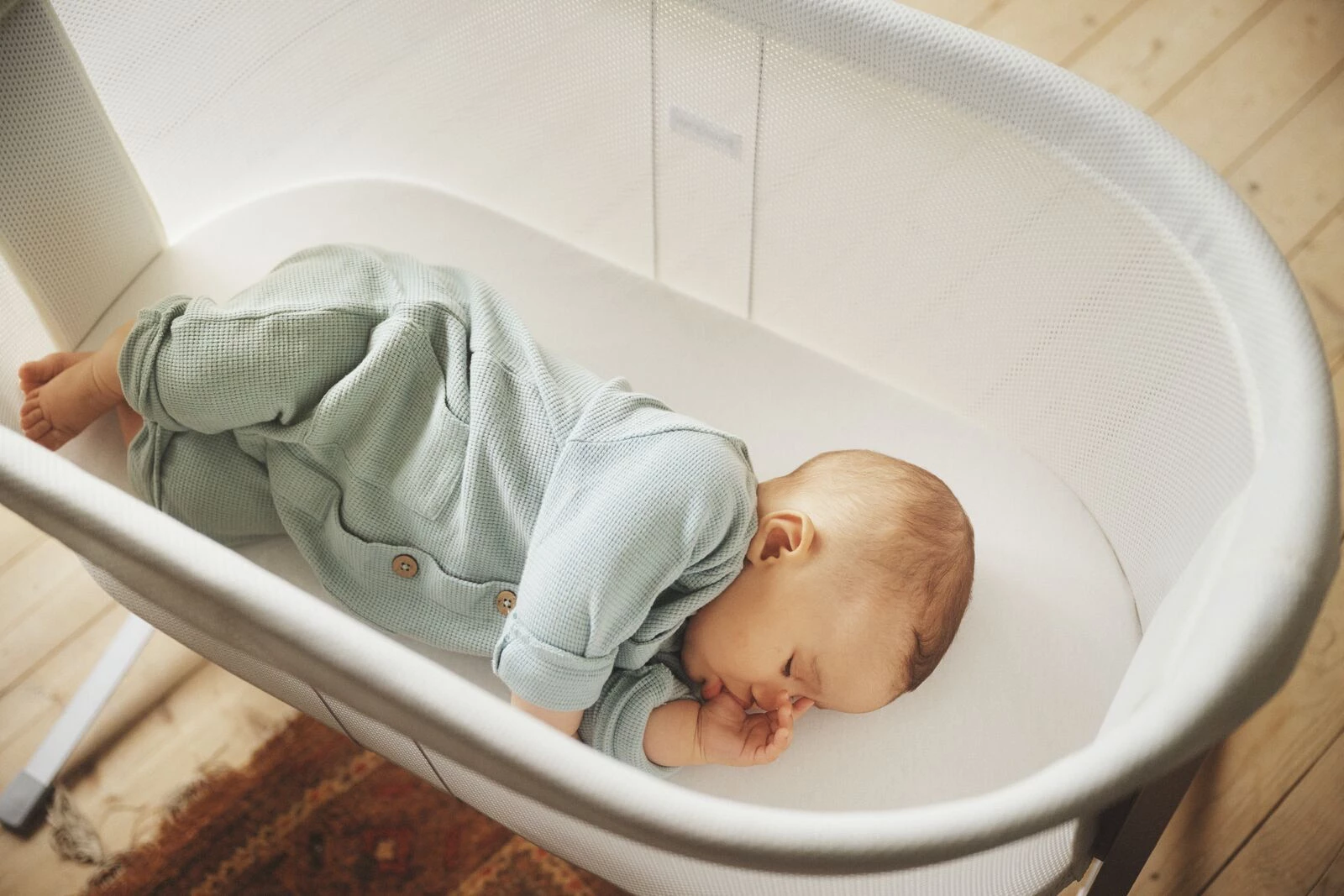 Kołyska wykonana jest z miękkiej i przewiewnej tkaniny mesh, która pozwala dziecku swobodnie oddychać, nawet jeśli twarz dziecka znajdzie się blisko boków kołyski. Dodatkowo siateczka ułatwia opiekunowi obserwację dziecka. Nie trzeba kupować ochraniaczy bocznych, ponieważ kołyska jest wykonana w całości z miękkiego materiału i nie posiada żadnych elementów, które mogłyby zranić delikatną skórę dziecka.