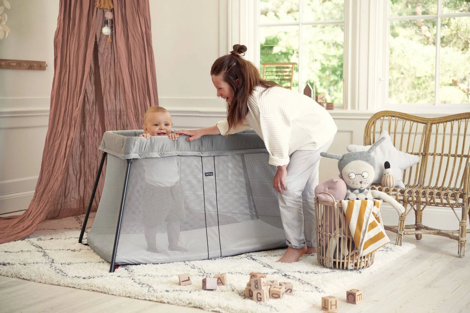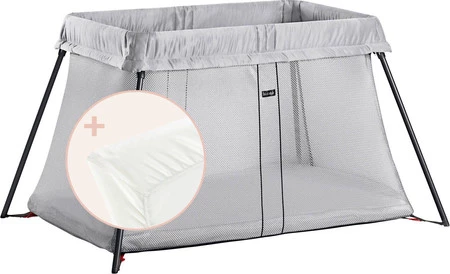 Wygodne i lekkie łóżeczko turystyczne BABYBJORN w zestawie z prześcieradłem do łóżeczka turystycznego LIGHT