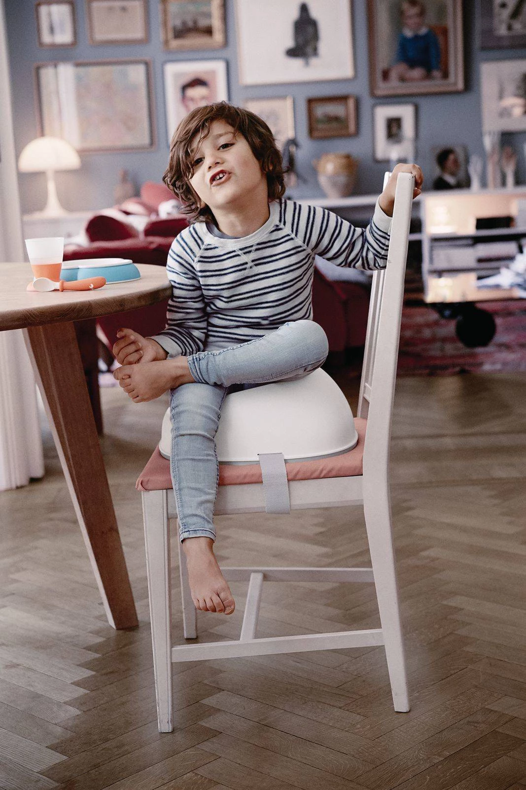 Czy Twoje dziecko wyrosło już ze swojego krzesełka do karmienia? Czy chciałoby siedzieć przy stole na takim samym krześle, jak Ty? Nakładka na krzesło umożliwia i pomaga dziecku usiąść przy stole bez konieczności siedzenia na kolanach dorosłej osoby lub przesuwania się na poduszkach. Twoje dziecko, używając nakładki, siedzi bezpiecznie i komfortowo. Może skupić się na posiłkach i włączać się w to, co dzieje się wokół stołu. Odpowiednie dla dzieci od 3 roku życia.