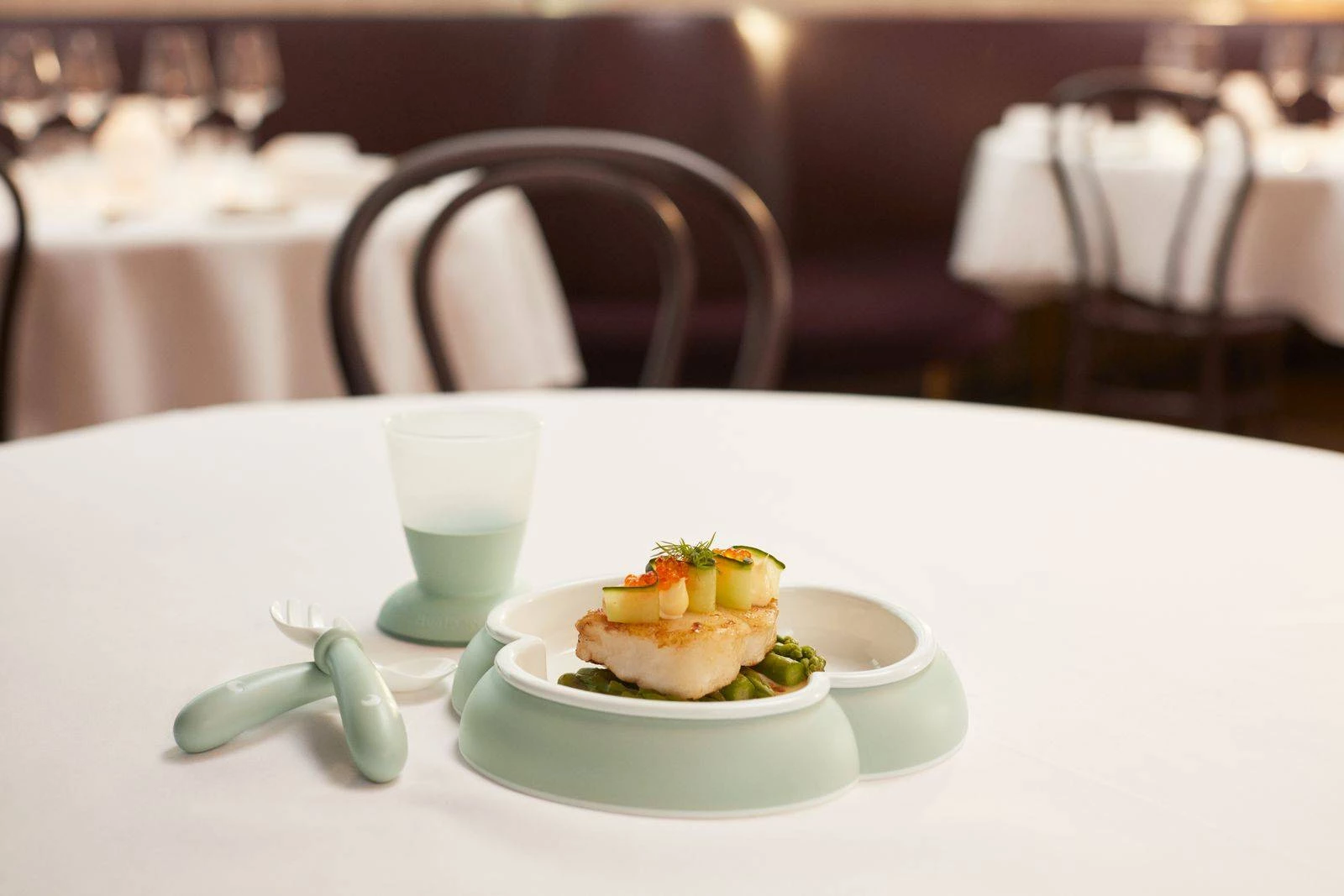- Talerzyk - kształt koniczynki i wyprofilowane krawędzie talerzyka ułatwiają dziecku nabieranie pokarmu. Talerzyk zaprojektowano tak, by trudno było chwycić za jego krawędzie i go przewrócić. Gumowe wykończenie od spodu utrzymuje naczynie na swoim miejscu.