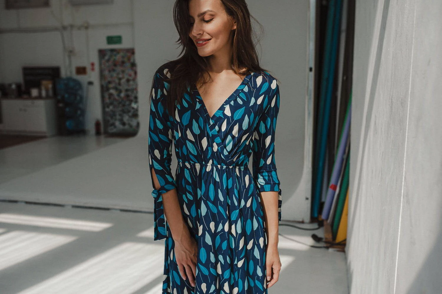 Sukienka ciążowa i do karmienia, która ma dwie możliwości noszenia! Elegancka sukienka ciążowa wykonana z miękkiej dzianiny w pięknym wzorze. Zapewnia wygodne karmienie piersią dzięki kopertowemu dekoltowi. Zaprojektowana z elastycznej dzianiny, dopasowuje się do kształtu ciała w ciąży i po porodzie. Rękawy ozdobione eleganckim wiązaniem. Kopertowa konstrukcja umożliwia noszenie sukienki z dekoltem z przodu lub z tyłu, co daje dwie różne stylizacje! Wyprodukowana w Polsce z najwyższą starannością! Idealna zarówno na wyjątkowe okazje, jak i na codzień. Sukienka ciążowa i do karmienia "Two Ways Midi" to uniwersalna opcja dla przyszłych mam, która dostosowuje się do zmieniających się kształtów ciała. Można ją nosić z dekoltem z przodu, umożliwiając jednocześnie karmienie piersią, lub z dekoltem z tyłu. Po okresie karmienia nadal można nosić ją jako zwykłą sukienkę :) Możliwość różnorodnych stylizacji sprawia, że nadaje się na różne okazje, w tym na uroczystości rodzinne, takie jak chrzciny. Pasuje również do codziennych stylizacji z trampkami lub balerinami, a także jest idealna do sesji zdjęciowej ciążowej, podkreślając piękny brzuszek. Sukienka jest zaprojektowana z myślą o wysokiej jakości, zgodnie z zasadami slow fashion, co gwarantuje możliwość noszenia jej przez wiele lat. Wykonana z tkanin spełniających rygorystyczne standardy Oeko-Tex Standard 100, zapewniając tym samym komfort i bezpieczeństwo zarówno dla przyszłych mam, jak i karmiących. Wybór odpowiedniego rozmiaru sukienki ciążowej i do karmienia "Two Ways Midi" powinien być zgodny z aktualnym rozmiarem noszonej odzieży. W przypadku wątpliwości między dwoma rozmiarami zaleca się wybór mniejszego.