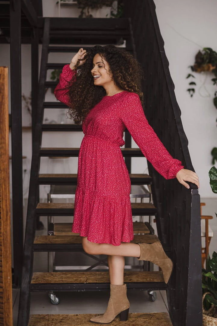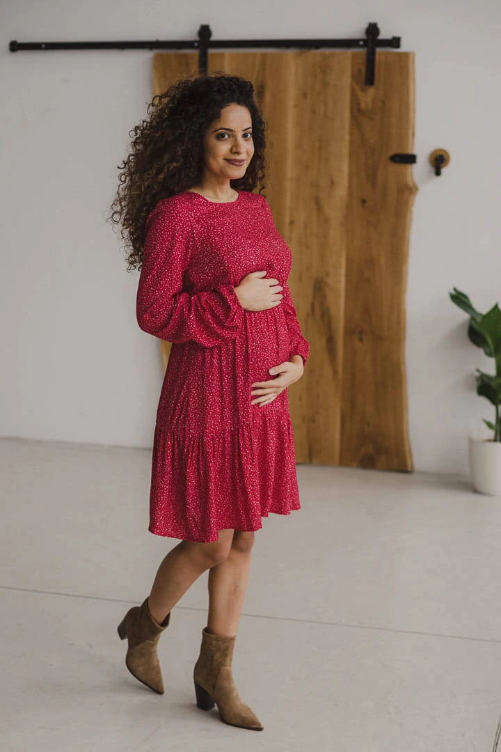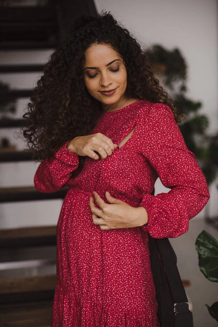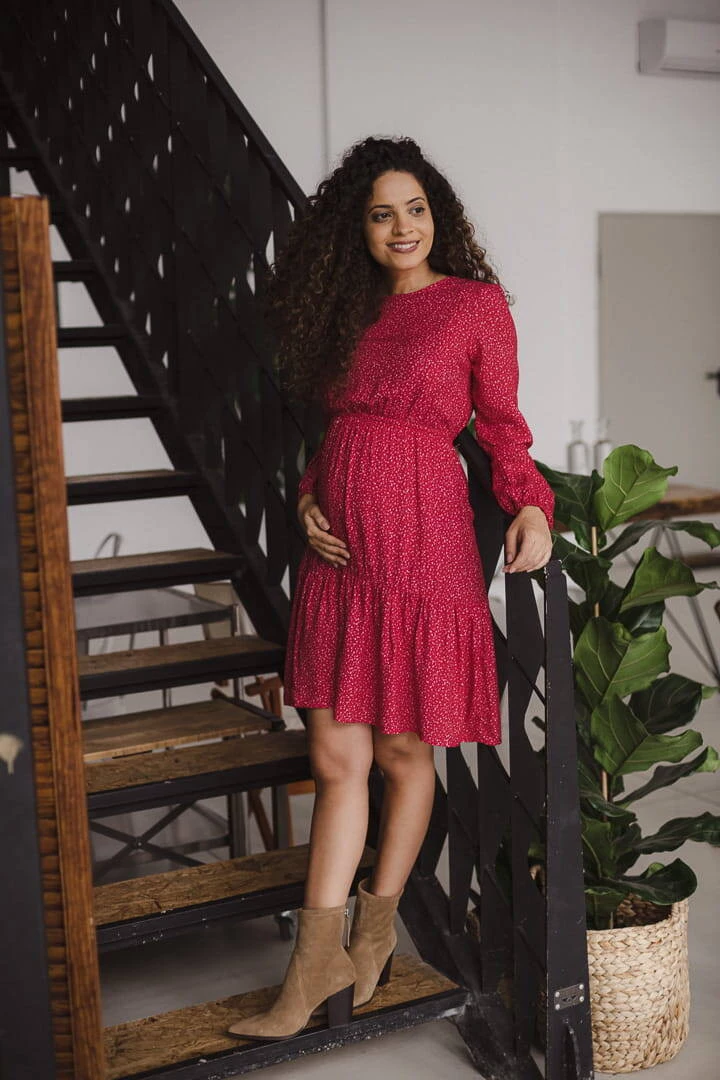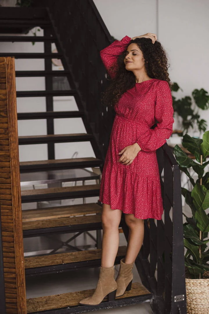 Sukienka od marki Milk & Love z długim rękawem w delikatny print na malinowym tle, wykończona falbanką. Całość o długości midi. Idealna sukienka przeznaczona do noszenia w okresie ciąży. Z powodu jej wyjątkowo funkcjonalnego fasonu i kolorów ta niebanalna sukienka ciążowa, sprawdzi się również kiedy już skończysz ciążową przygodę. Luźna sukienka dla kobiet w ciąży posiada elastyczną delikatną gumkę pod biustem, co sprawia, że idealnie dopasowuje się zarówno do brzuszka w ciąży, jak i po porodzie. Komfort przyszłej mamy w tym modelu zapewnia wysokiej jakości 100% tkanina wiskozowa w delikatny biały print. Sukienki na czas ciąży mają wszyte ukryte zamki, które po zakończeniu okresu karmienia można schować do środka, aby dalej korzystać z sukienki w standardowy sposób. Malinowa Lovely Dress to idealny model sukienki dla przyszłych mam dostępny w naszym sklepie internetowym również w innych modnych kolorach.