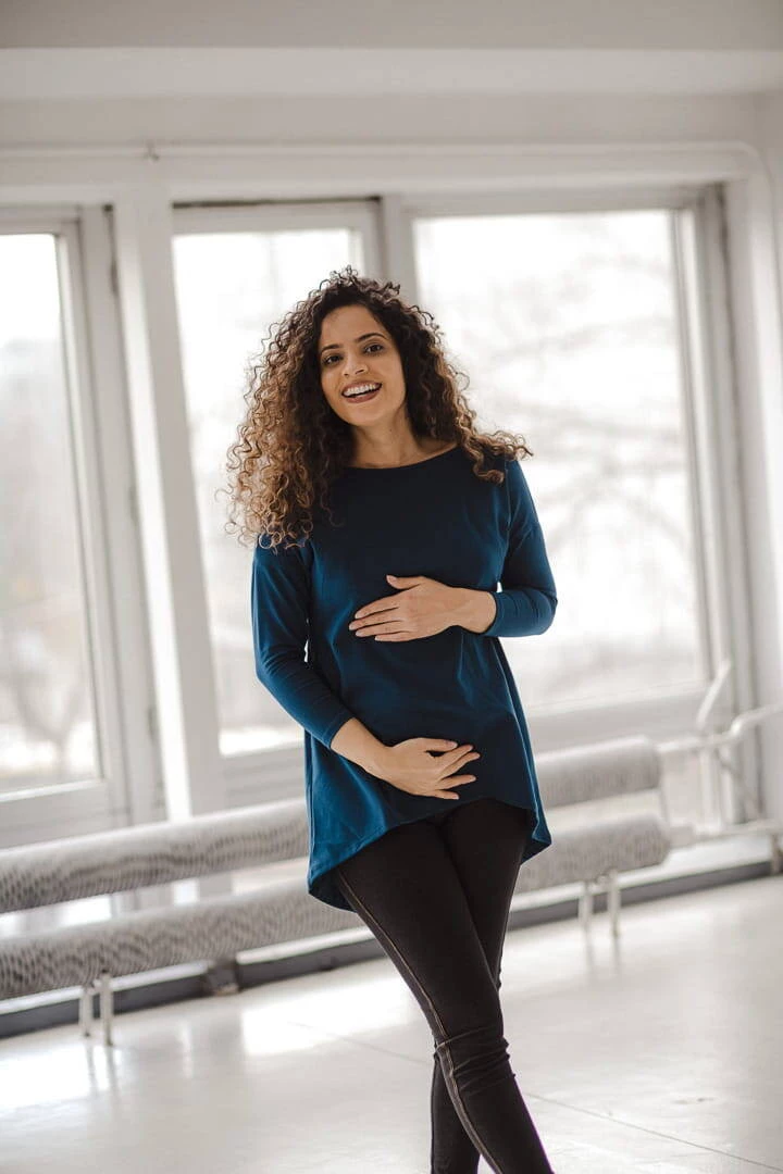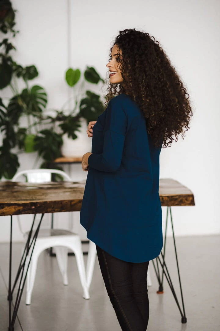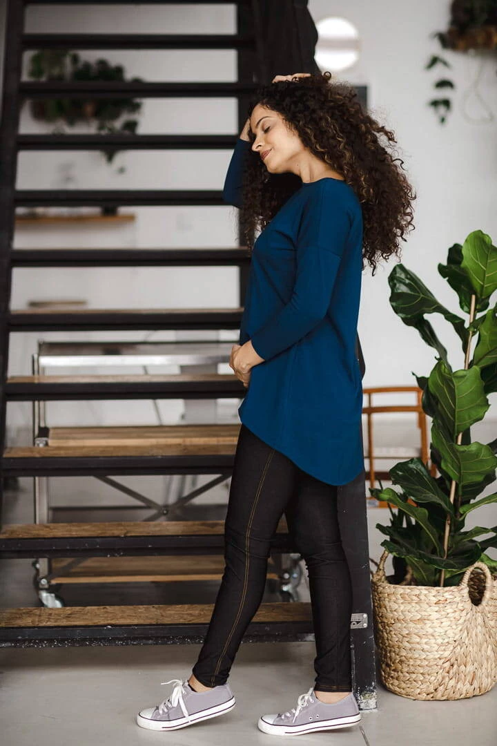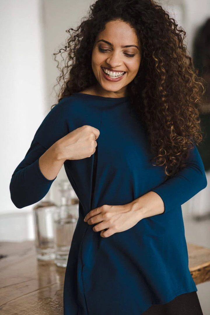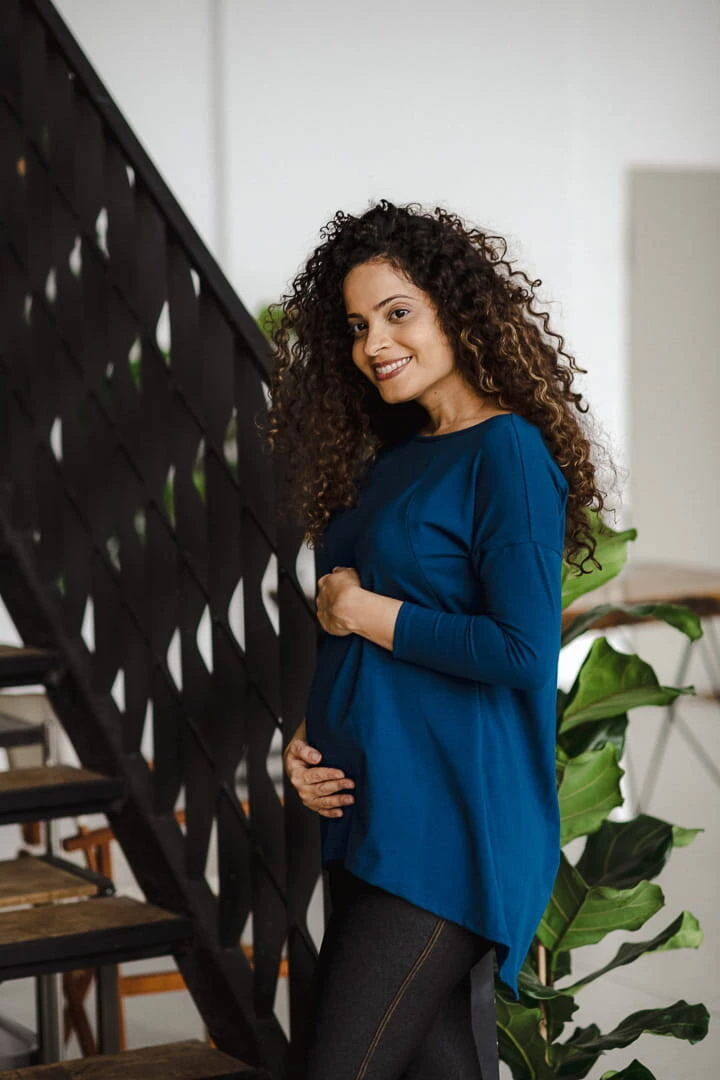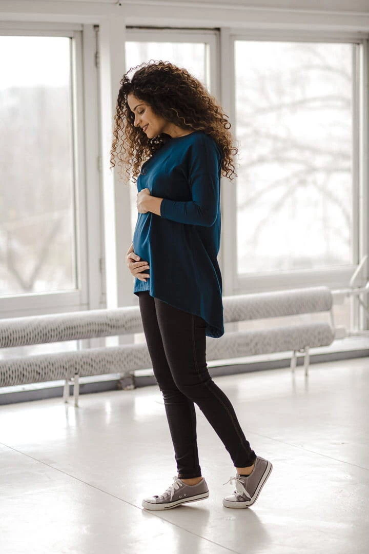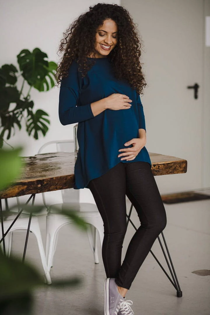Poznaj naszą idealną bluzkę damską ciążową, która później stanie się Twoją ulubioną bluzką do karmienia. Śliczny kolor posejdon to niepowtarzalny odcień niebieskiego, który doskonale dopasuje się do Twojej garderoby ciążowej. Luźny krój i elastyczny materiał bluzki ciążowej dla matek karmiących, doskonale dopasowuje się do rosnącego brzuszka, zapewniając nie tylko modny oversizowy wygląd, ale także wyjątkowy komfort przyszłej mamie. Dzięki wytrzymałym, krytym zamkom umożliwiającym komfortowe i dyskretne karmienie piersią, ta idealna bluzka ciążowa to kreacja na każdą sytuację. Stylowe bluzki ciążowe/ tuniki możesz nosić swobodnie do legginsów i spódnic ciążowych. Ta bluzka ciążowa dla kobiet w ciąży, została wykonana z najwyższej jakości, oddychających dzianin, które przeszły rygorystyczne testy Oeko-Tex Standard 100, zapewni Ci miękkość i przyjemność noszenia, ale też nie uczulą Twojego dziecka. Bluzka dla ciężarnych z kolekcji Mommy nawet po wielu praniach zachowuje piękny, głęboki kolor, co sprawia, że jest to inwestycja na lata. Nasze wygodne bluzki ciążowe i do karmienia zostały w całości uszyte w Polsce, co dodaje im wyjątkowego charakteru. Przekonaj się, że nasze ubrania ciążowe i do karmienia, to idealne rozwiązanie, zaprojektowane zgodnie z ideą slow fashion, abyś mogła cieszyć się nimi przez wiele lat. Odkryj bluzkę damską ciążową i do karmienia Mommy w intrygującym kolorze posejdon już teraz!
