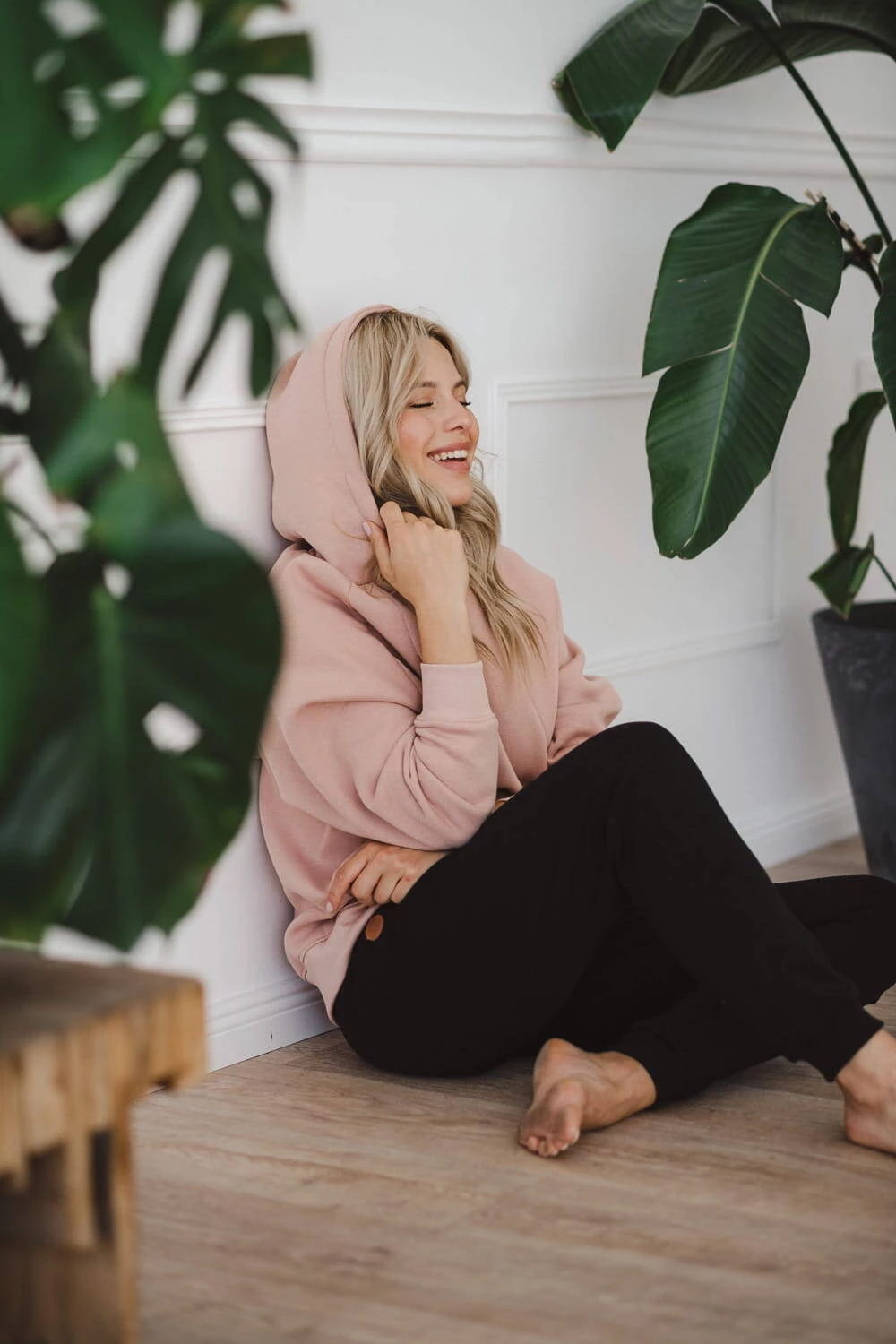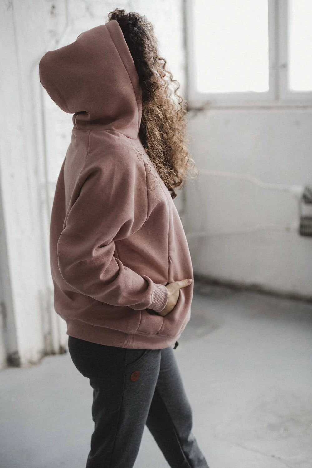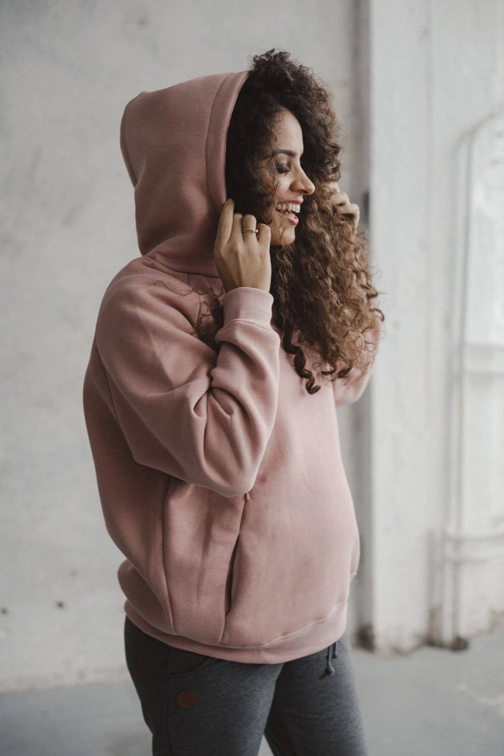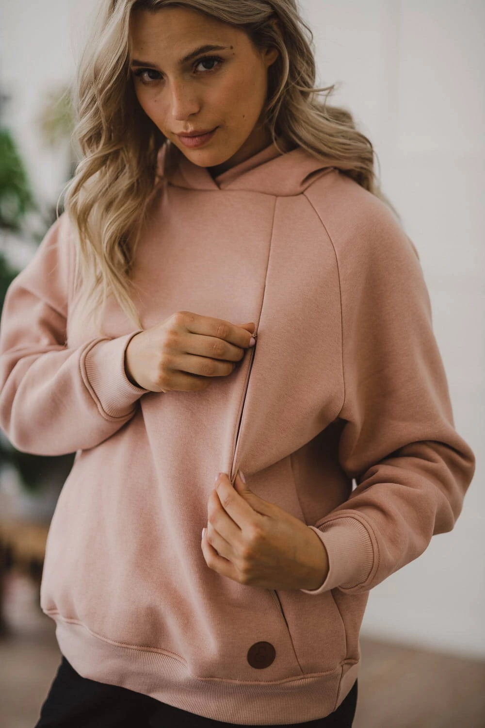 Motherhood - wygodna bluza ciążowa i do karmienia w kolorze delikatnego różu. Bluza ciążowa z kapturem dla przyszłych mam wykonana z grubej dzianiny dresowej z miękkim meszkiem od wewnątrz - doskonała na chłodniejsze dni. bluza posiada wszyte solidne zamki umożliwiające dyskretne, wygodne karmienie piersią w dowolnej sytuacji, które są umieszczone na dole dzięki czemu zapewniają większą prywatność w trakcie karmienia. Prezentowana bluza ciążowa ma luźny fason, który z łatwością pomieści nawet wydatny brzuszek ciążowy. Piękny odcień różu bluzy do karmienia piersią dodaje uroku również w okresie ciąży. Funkcjonalna bluza została wykonana z wysokiej jakości, oddychających tkanin, które przeszły rygorystyczne testy Oeko-Tex Standard 100, co sprawia, że bluzy są przyjemne w dotyku zarówno dla mamy, jak i dziecka. Cały proces produkcji odbywa się w Polsce. Oversizowe stylizacje ciążowe ułatwiają dyskretne karmienie piersią, a po całym okresie dzięki świetnie ukrytym zamkom, bluza do karmienia piersią może nadal Ci służyć jako codzienna sportowa bluza damska.