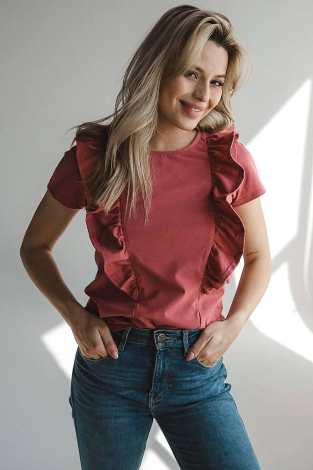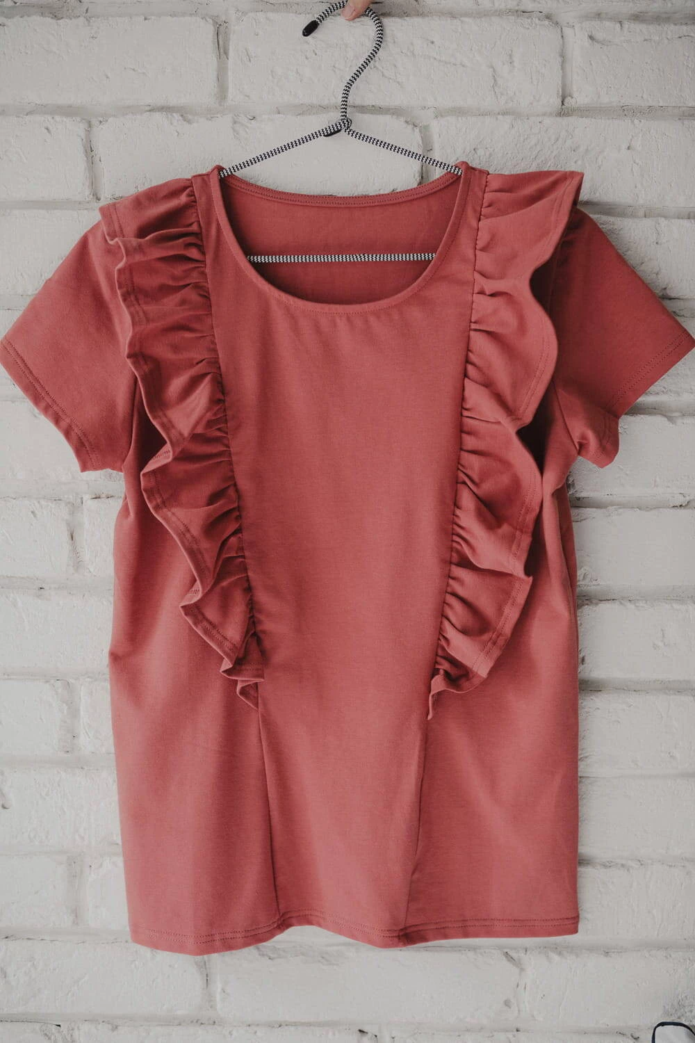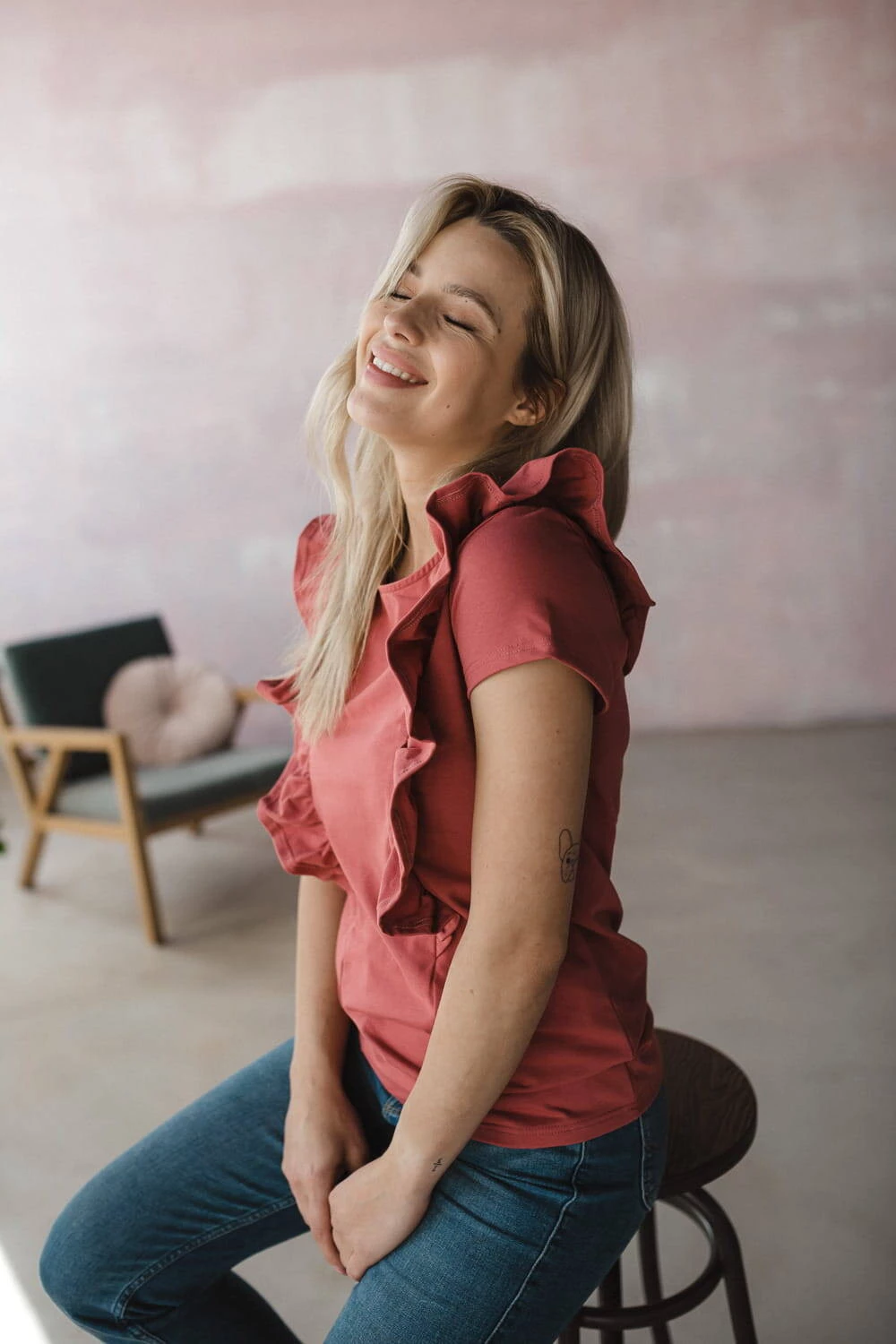 W tej ofercie oferujemy bluzkę w kolorze Dusty cedar z ozdobną falbanką dla świeżo upieczonych mam które została starannie uszyta w Polsce przez renomowaną markę Milk & Love, której fasony ciążowe i do karmienia są cenione od lat przez kobiety w okresie ciąży i po porodzie, gdy karmią swoje maleństwo. Stylowe bluzki dla karmiących kobiet zaprojektowane z ideą slow fashion gwarantują, że nasze topy ciążowe i do karmienia sprawdzą się również na później, ponieważ zamki przez które karmisz po przygodzie ciążowej są bardzo dobrze schowane w tym wypadku za uroczymi falbankami.