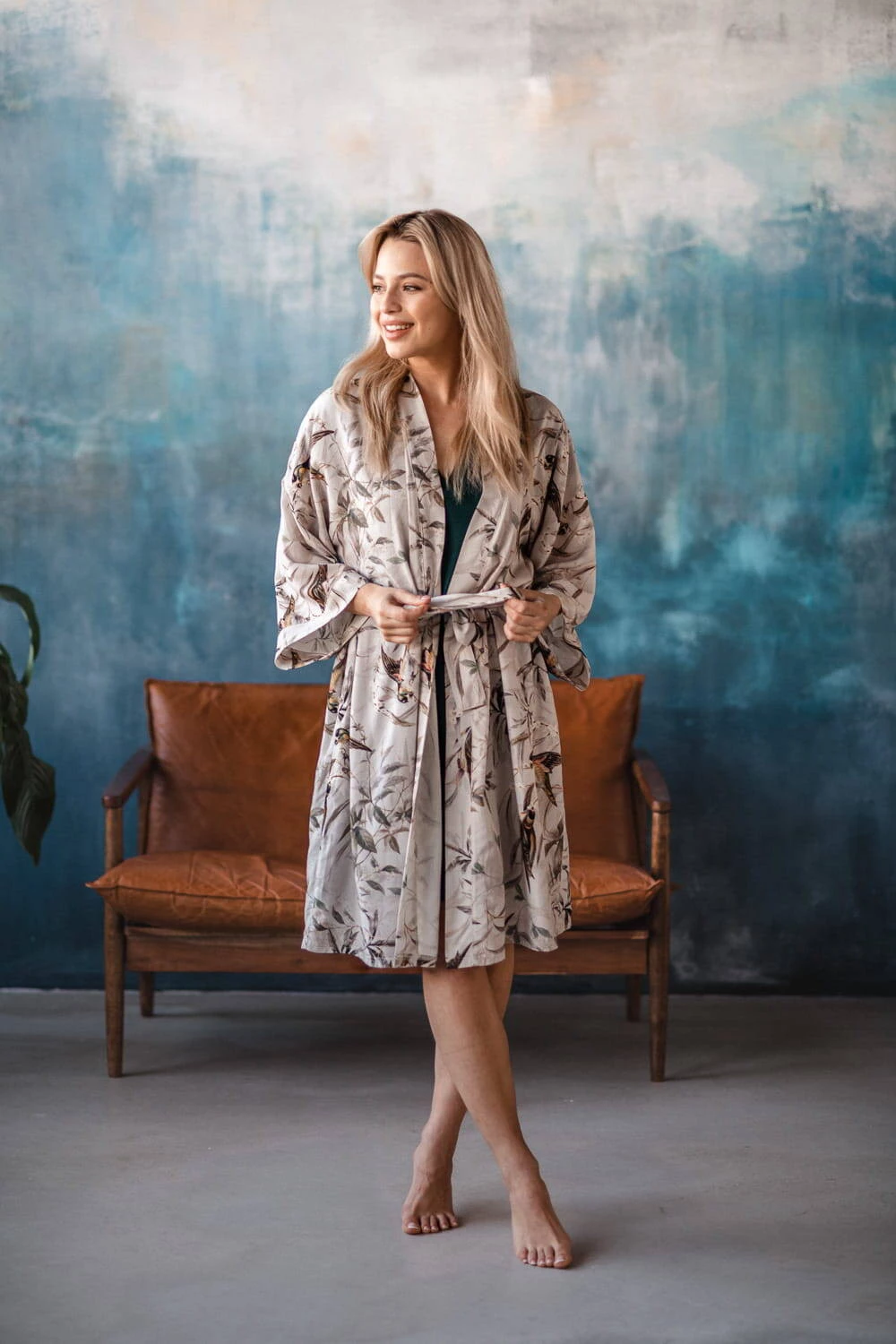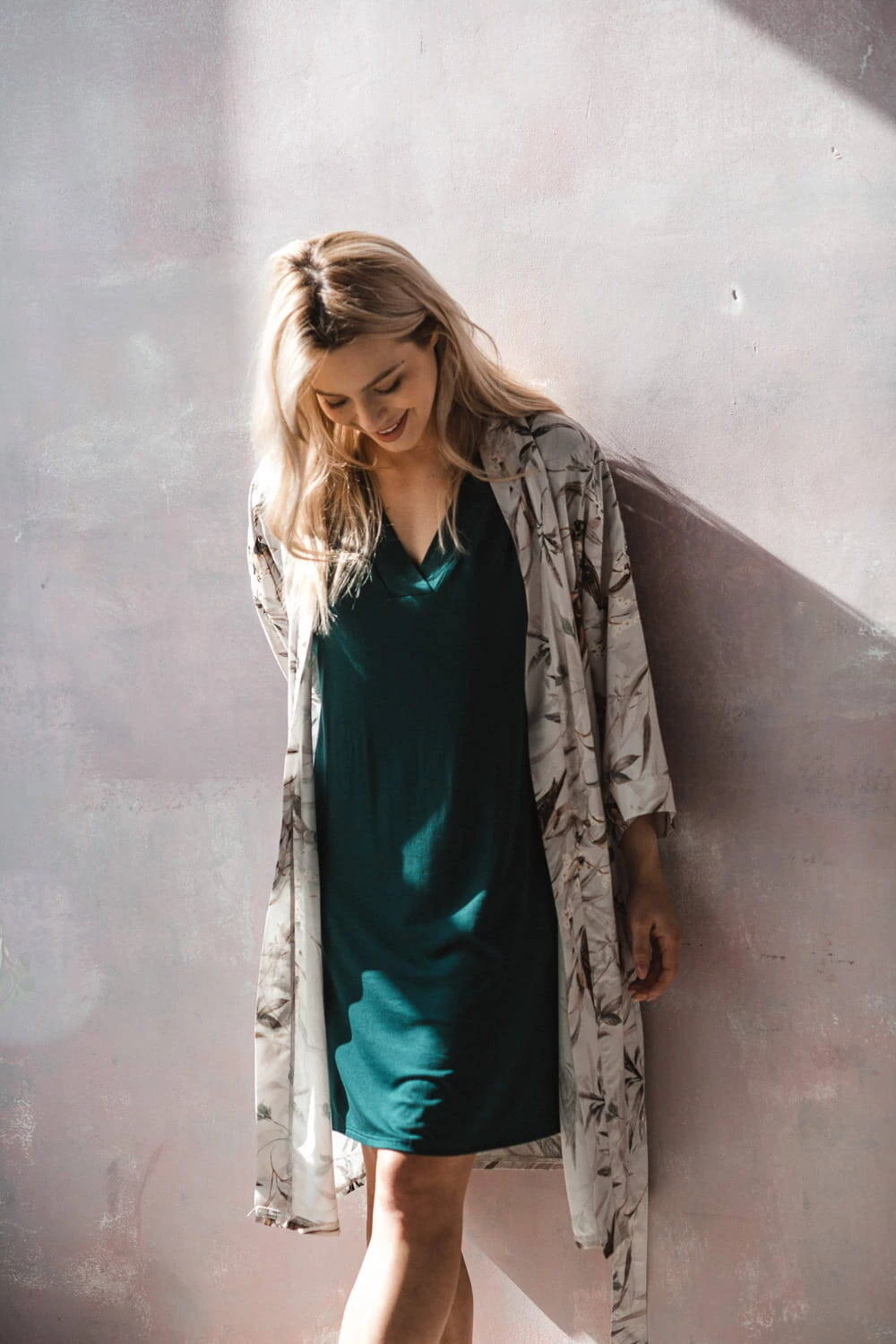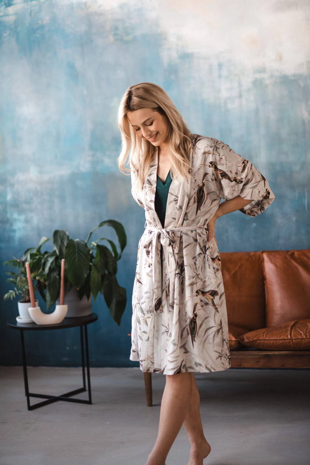 Cudownie miękki i ultrakobiecy, wygodny szlafrok z tkaniny bambusowej, który pokochasz od pierwszego założenia. Niezwykle miękka tkanina bambusowa otuli Twoje ciało w ciąży i po porodzie. Przepiękny, kobiecy print doda Ci energii i pobudzi zmysły. Cienki szlafrok do szpitala, o kroju kimono został zaprojektowany tak, aby dostosowywał się do zmieniających się kształtów ciała w ciąży i po porodzie. Odpowiednio długi - idealny w okresie ciąży i na wymagający czas połogu. Rękawy w długości 7/8, aby nie przeszkadzały w codziennych czynnościach w opiece nad noworodkiem. Wykonany z najwyższej jakości, oddychającej 100% tkaniny bambusowej, która przeszła rygorystyczne testy Oeko-Tex Standard 100. Tkanina i szlafrok ciążowy do szpitala jak i na co dzień powstały w Polsce!