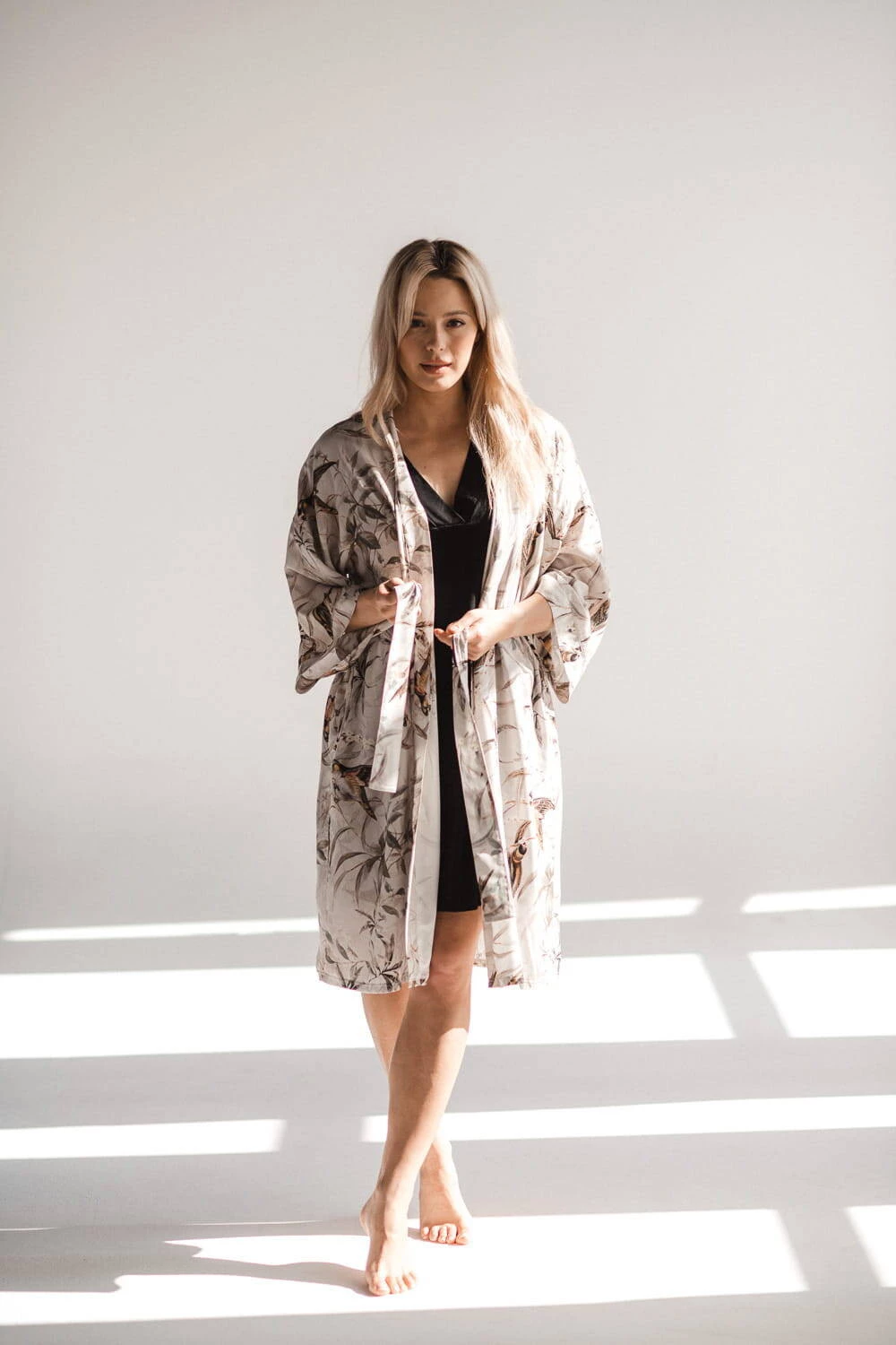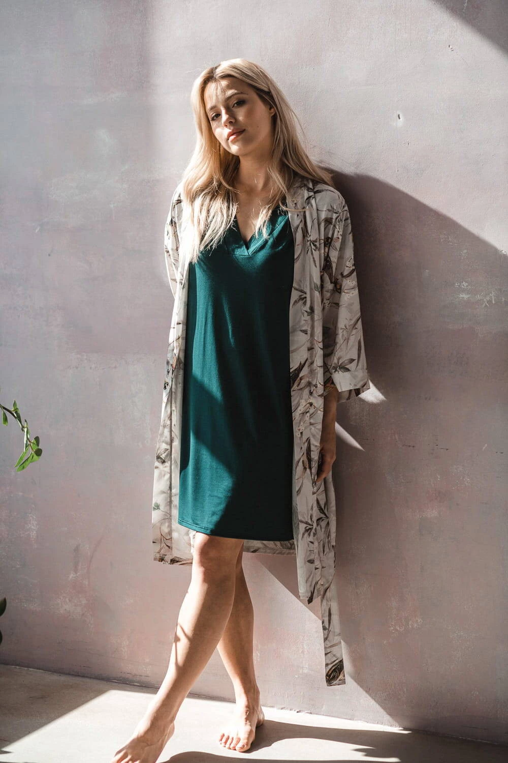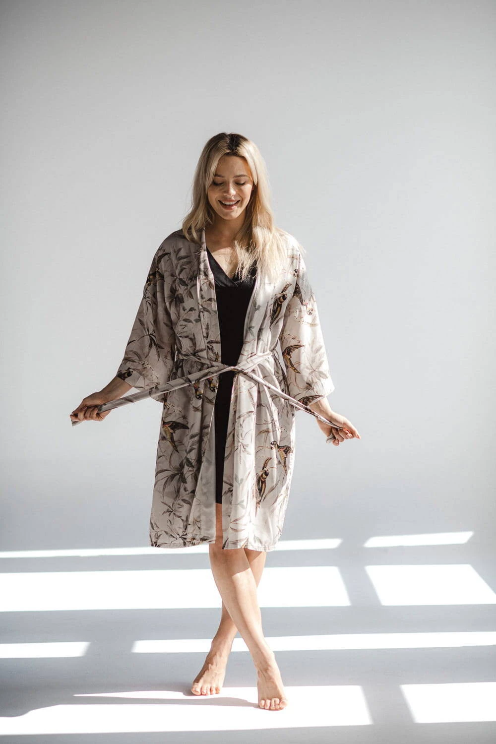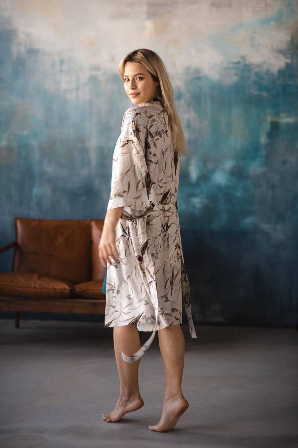 Cudownie miękki i ultrakobiecy, wygodny szlafrok z tkaniny bambusowej, który pokochasz od pierwszego założenia. Niezwykle miękka tkanina bambusowa otuli Twoje ciało w ciąży i po porodzie. Przepiękny, kobiecy print doda Ci energii i pobudzi zmysły. Cienki szlafrok do szpitala, o kroju kimono został zaprojektowany tak, aby dostosowywał się do zmieniających się kształtów ciała w ciąży i po porodzie. Odpowiednio długi - idealny w okresie ciąży i na wymagający czas połogu. Rękawy w długości 7/8, aby nie przeszkadzały w codziennych czynnościach w opiece nad noworodkiem. Wykonany z najwyższej jakości, oddychającej 100% tkaniny bambusowej, która przeszła rygorystyczne testy Oeko-Tex Standard 100. Tkanina i szlafrok ciążowy do szpitala jak i na co dzień powstały w Polsce!