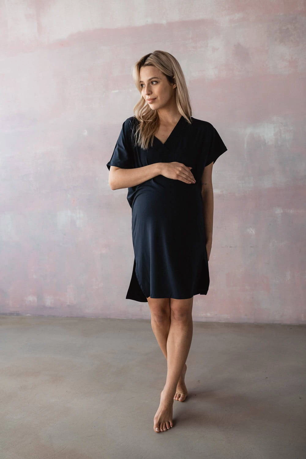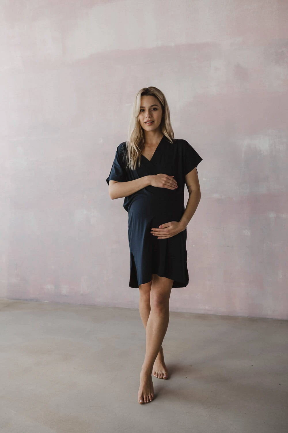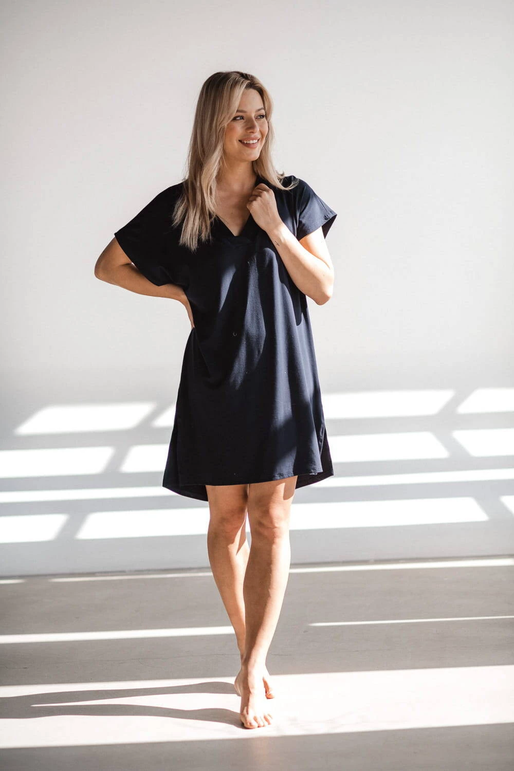 Oversize'owy krój granatowej koszuli zadowoli każdą przyszłą mamę, koszula ciążowa to wygodna bielizna nocna która zapewnia nie tylko miejsce na rosnący brzuszek ciążowy, ale także gwarantuje, że będziesz wyglądać świetnie po porodzie, niezależnie od zmieniającej się sylwetki. Wykonana z najwyższej jakości bambusowej wiskozy, koszula ciążowa Moon przeszła wszystkie testy, aby zapewnić Ci maksymalny komfort i bezpieczeństwo.