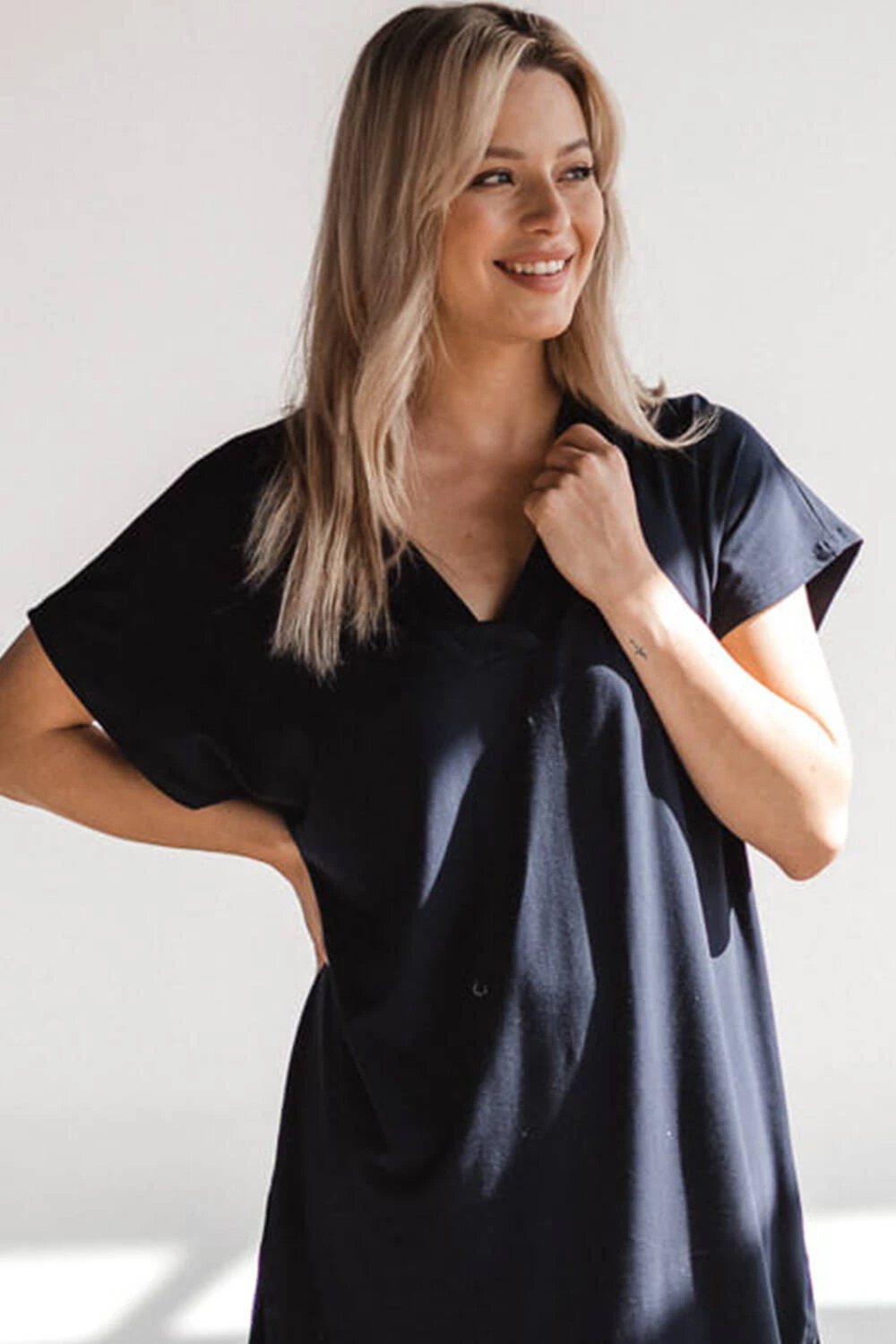 Postaw na luksus i wygodę dzięki naszej granatowej koszuli nocnej Moon z kolekcji bambusowej dla kobiet w ciąży i młodych mam. Ta kobieca koszula nocna jest niezwykle miękka i delikatna w dotyku. Bambusowa koszulka nocna usprawnia nocne karmienia noworodka co jest bardzo ważne zwłaszcza w początkowym etapie rodzicielstwa. Postaw na koszulę z krótkim rękawem, która otuli Cię delikatnością już od pierwszego dotknięcia. Jej klasyczny krój z dekoltem w kształcie litery V emanuje elegancją i kobiecością, pozwalając Ci poczuć się pewnie i pięknie nawet w trakcie karmienia maleństwa.