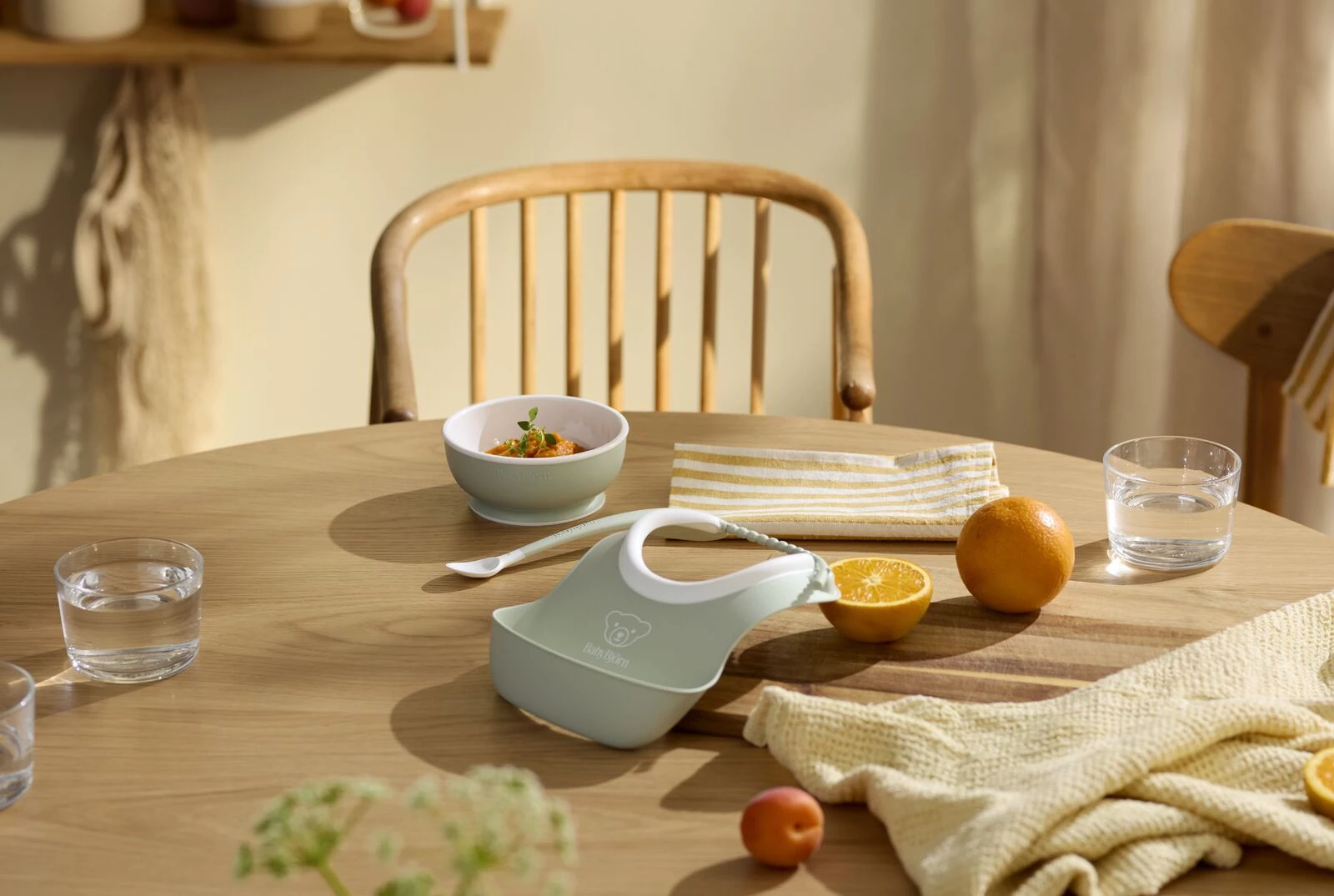 Miseczka oraz łyżeczka do karmienia mogą być używane od około szóstego miesiąca życia. Śliniaczek dla niemowląt jest już od około czwartego miesiąca życia.