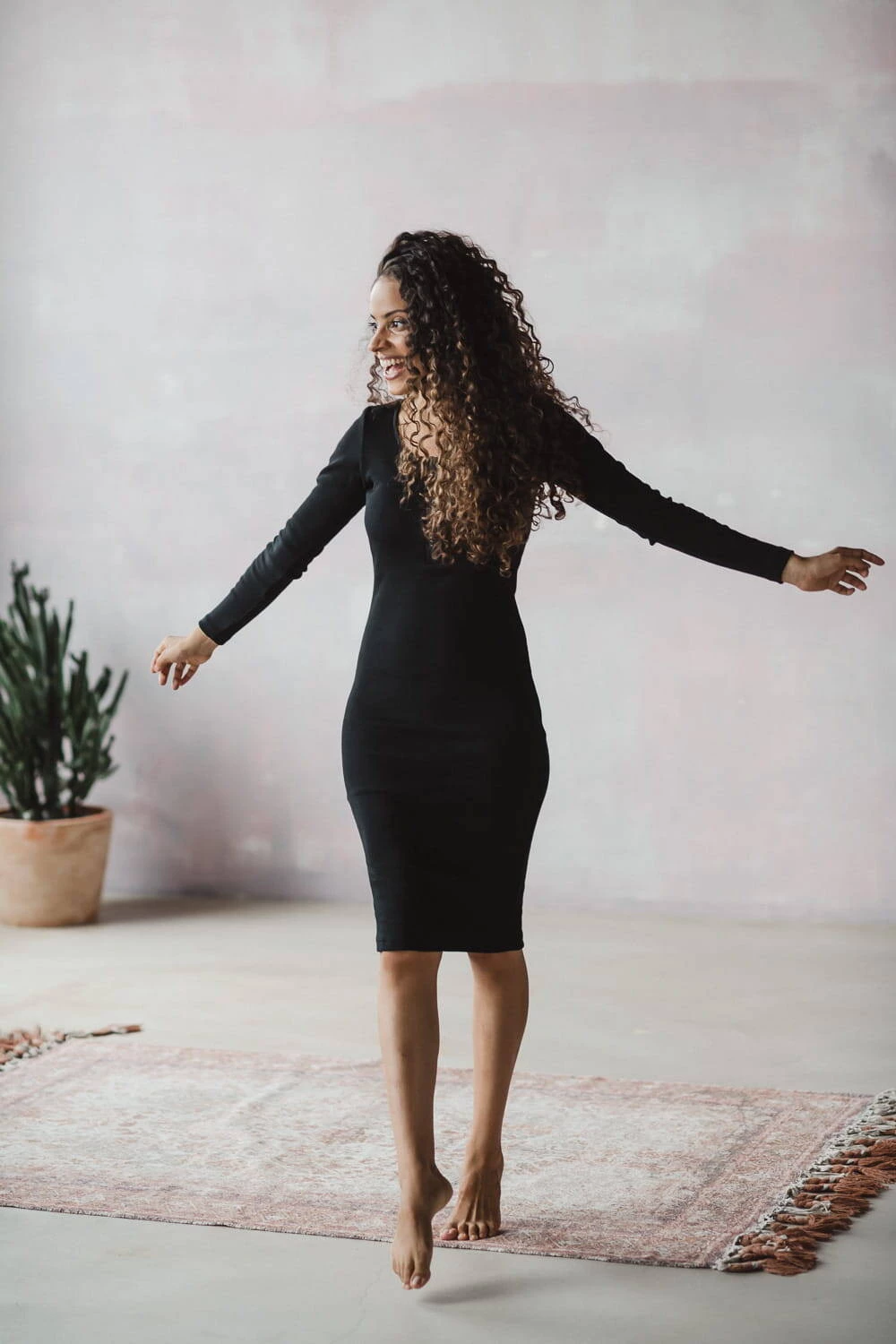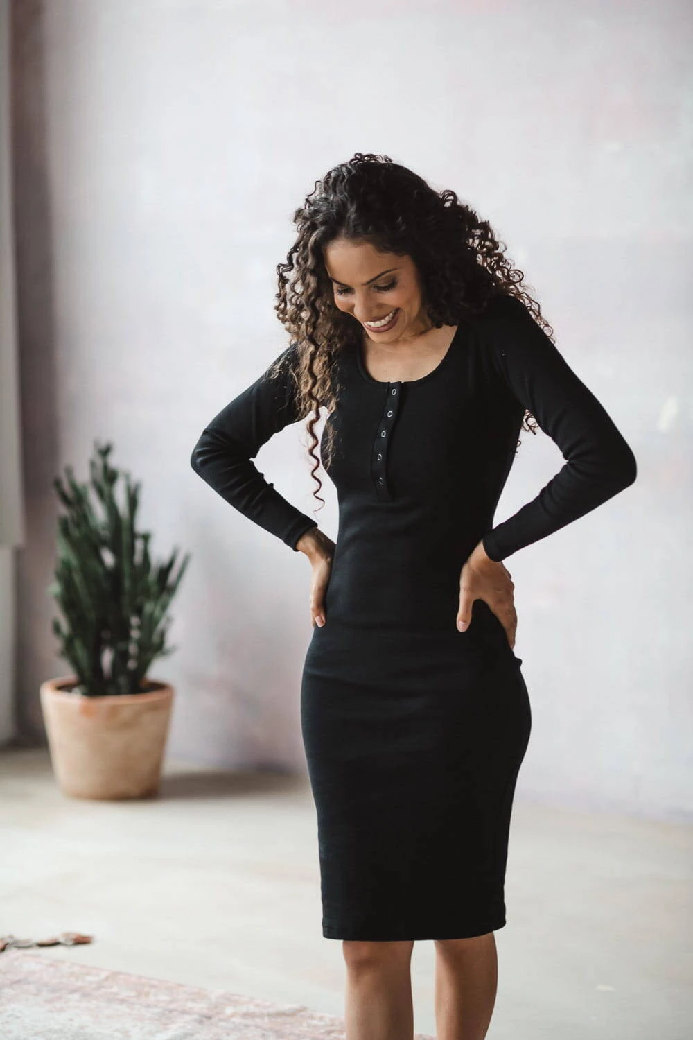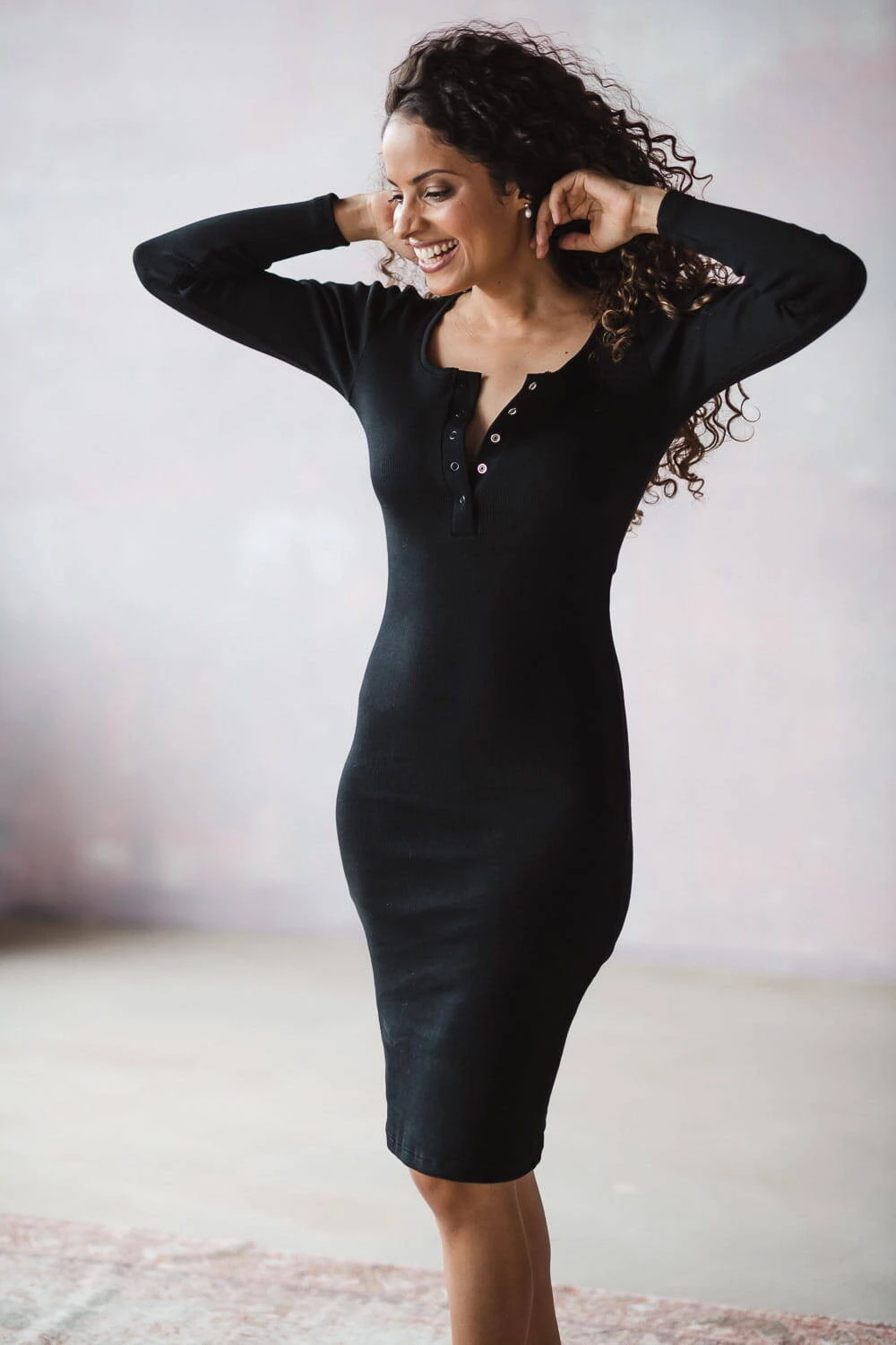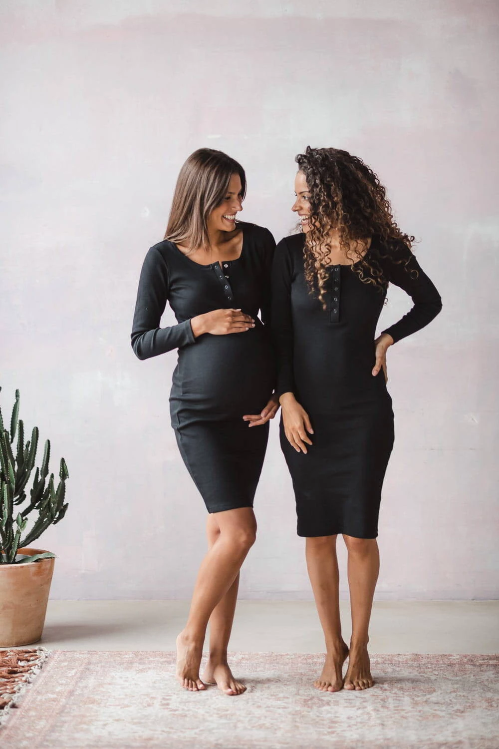 Sukienka do karmienia piersią z kolekcji odzieży ciążowej oferowanej przez Formommy została wykonana z prążkowanej dzianiny w kolorze praktycznej czerni. To ubranie ciążowe dla świeżo upieczonych mam łączy w sobie wygodę i kobiecy styl. Dzięki zastosowaniu wysokiej jakości materiałów, które zachowują swój pierwotny kształt i zapewniają komfort noszenia, nasze sukienki ciążowe i sukienki dla karmiących mam, będą towarzyszyć Ci przez długi czas. Ta sukienka dla mam typu basic charakteryzuje się dopasowanym krojem i złotymi napami umieszczonymi przy dekolcie, co ułatwia swobodne i dyskretne karmienie piersią. Wygodne sukienki dla ciężarnych, które można nosić również po ciąży, są idealne zarówno na pierwsze, jak i dalsze miesiące po porodzie.