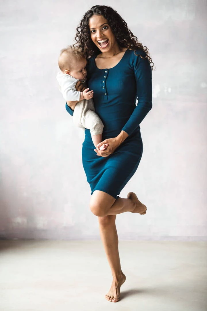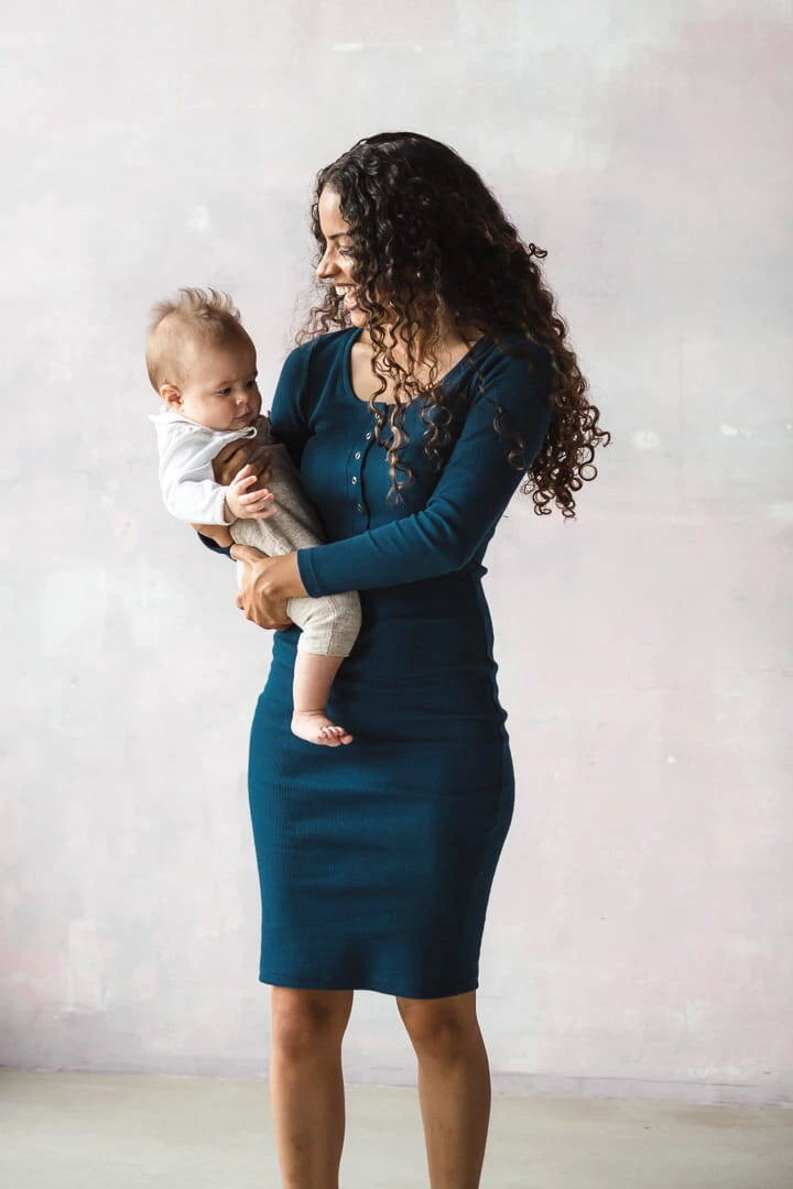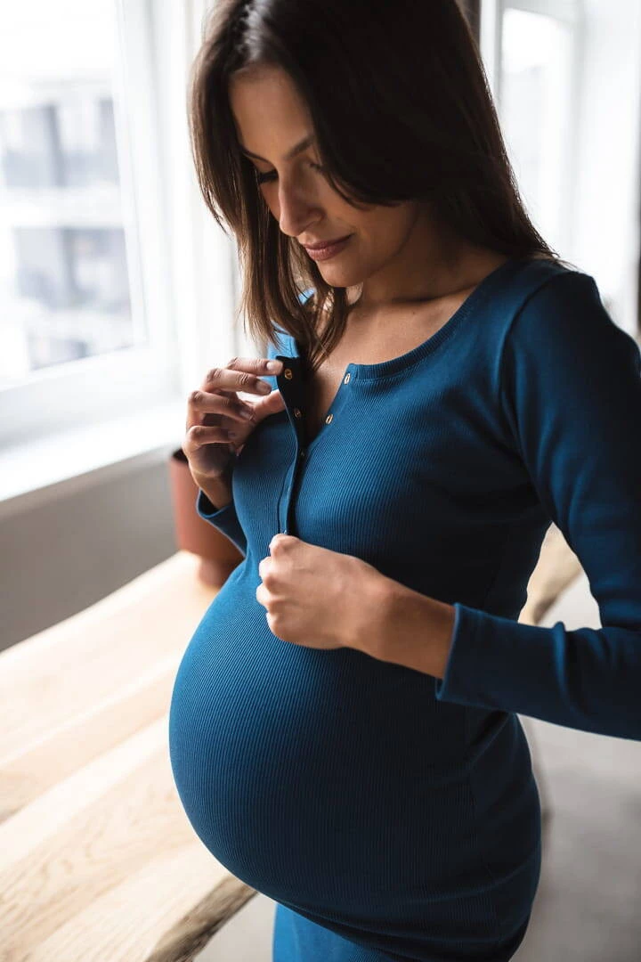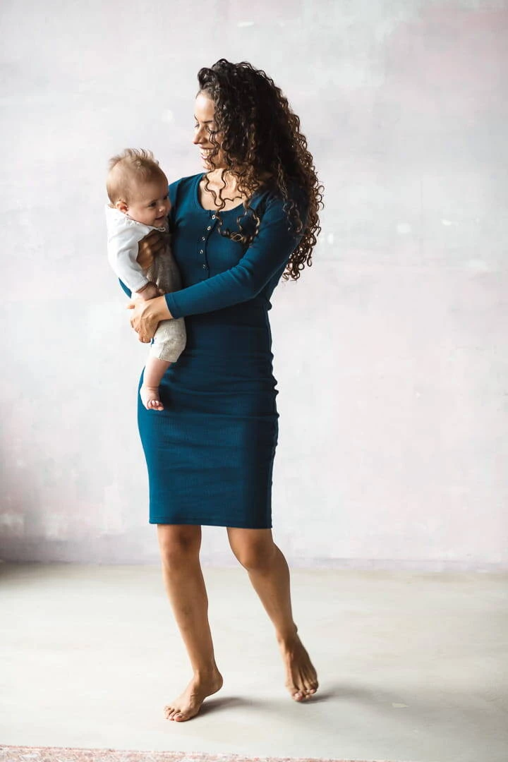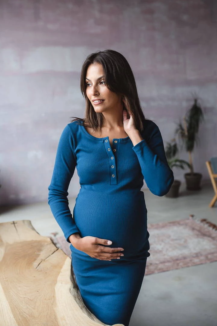 Sukienka ciążowa i do karmienia z kolekcji odzieży ciążowej dostępnej w Formommy zostala wykonana z prążkowanej dzianiny w pięknym odcieniu niebieskiego koloru. To ubranie ciążowe jest niezwykle wygodne i kobiece. Dzięki wysokiej jakości materiałowi, który nie odkształca się i zapewnia komfort noszenia, nasze ubrania ciążowe i sukienka dla karmiących mam zostaną z Tobą na długi czas. Idealna sukienka ciążowa typu basic posiada dopasowany krój, oraz napy przy dekolcie, co ułatwia swobodne i dyskretne karmienie piersią. Wygodne sukienki dla ciężarnych/sukienki do karmienia piersią są doskonałe od I trymestru, możesz również nosić je po ciąży jak tradycyjne proste sukienki.
