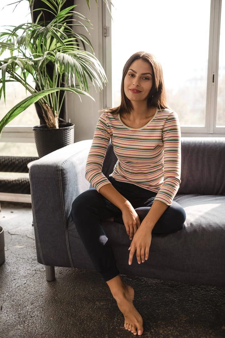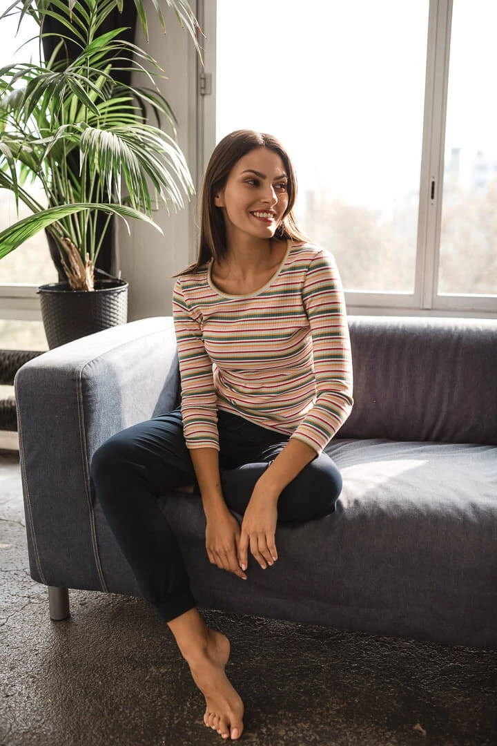 Modna i komfortowa bluzka ciążowa z rękawem 7/8 w paski to idealny outfit na każdą okazję od I trymestru ciąży. Z obu boków brzuszka bluzki damskie ciążowe posiadają wszyty panel który dopasuje się do ciążowego brzucha i zmian w ciele. Górą bluzki ciążowej dla kobiet w ciąży został wszyty specjalny panel odchylany do góry, dzięki któremu łatwo i szybko nakarmisz noworodka. Idealne bluzki ciążowe i do karmienia zapewniają Ci wygodę oraz komfort w okresie ciąży i później kiedy karmisz piersią. Komfort przyszłej mamy jest bardzo ważny, dlatego warto inwestować w odzież która go zapewnia. Postaw na kolorowe bluzki dla ciężarnych zobacz jak wygodne mogą być bluzki ciążowe, kiedy ciało wraca do swoich kształtów po ciąży.