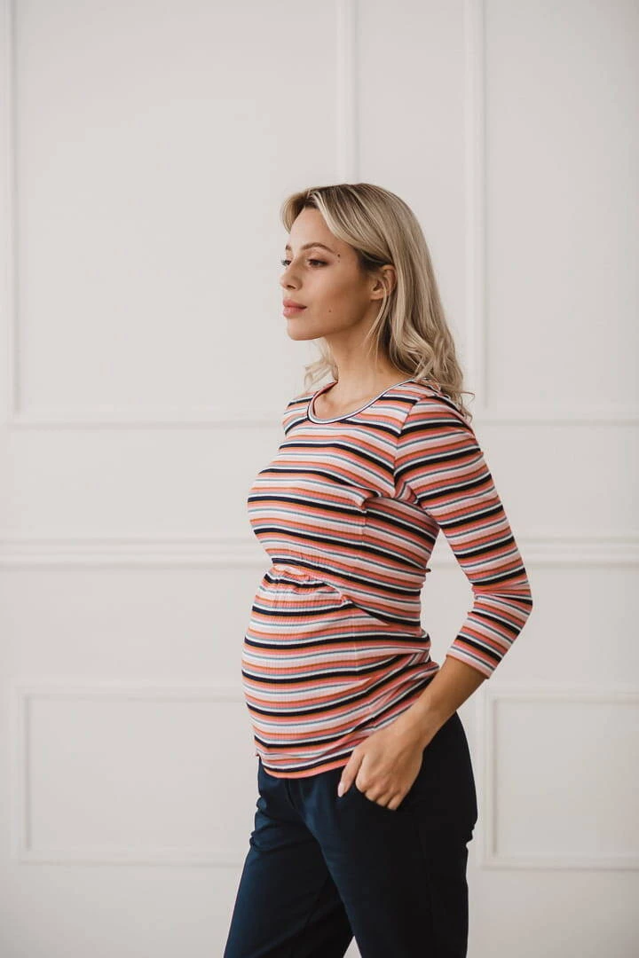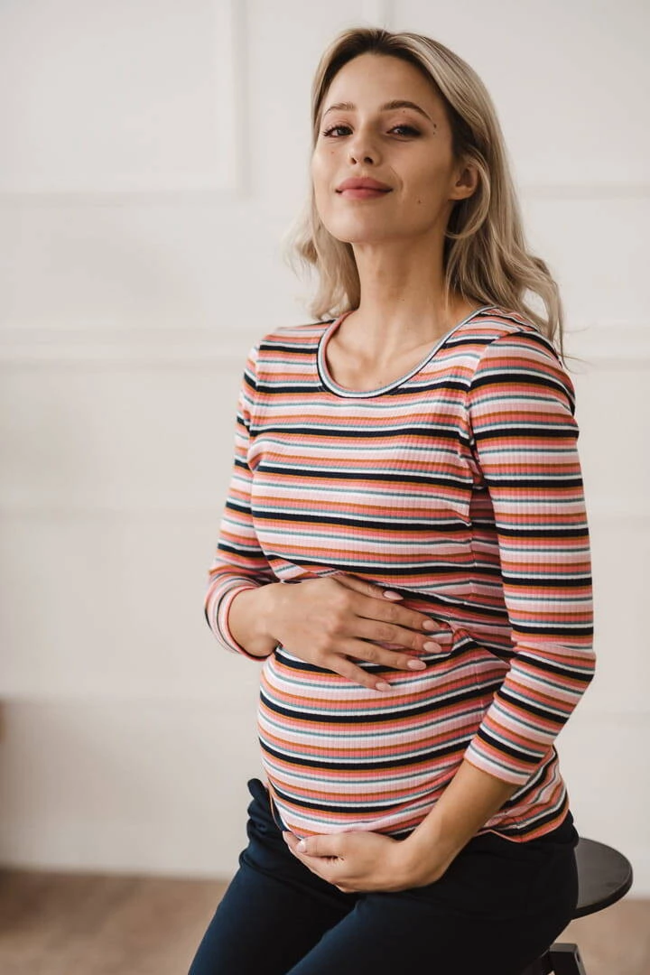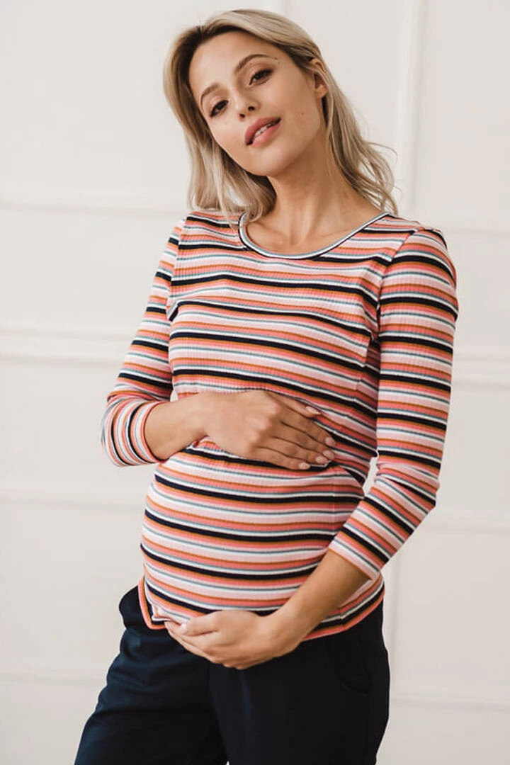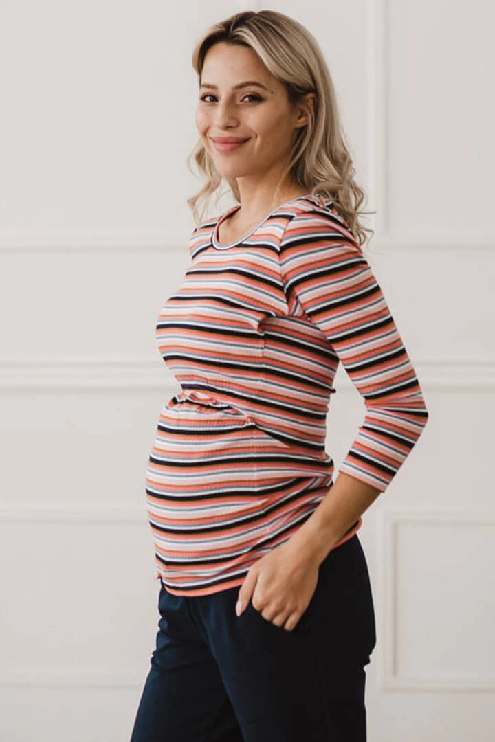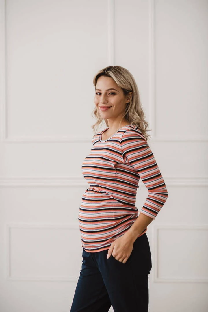 Uniwersalna bluzka ciążowa z rękawem 7/8 w paski to idealny outfit na każdą okazję od początku ciąży . Z obu boków brzuszka bluzki damskie ciążowe posiadają zaszewki które dopasują się do rosnącego brzuszka i zmieniającego ciała. Górą idealnej bluzki ciążowej został wszyty specjalny panel odchylany do góry, dzięki któremu łatwo i szybko nakarmisz noworodka. Bluzki ciążowe i do karmienia zapewniają Ci wygodę oraz komfort w okresie ciąży i później kiedy karmisz piersią. Komfort przyszłej mamy jest bardzo ważny, dlatego warto inwestować w odzież która go zapewnia. Postaw na kolorowe bluzki dla ciężarnych zobacz jak wygodne mogą być bluzki ciążowe, kiedy ciało wraca do figury sprzed ciążowej przygody.