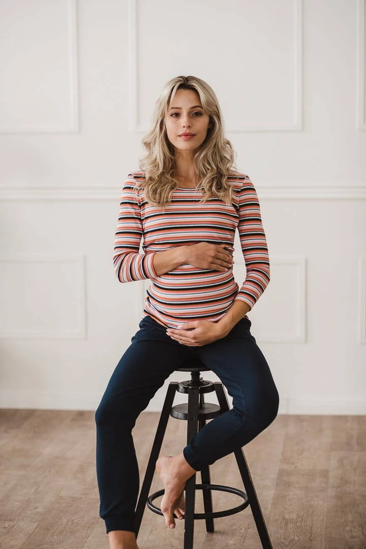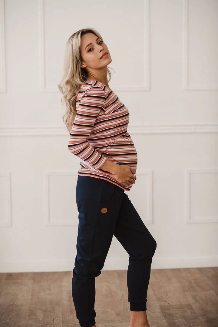 W Twojej ciążowej szafie nie może zabraknąć ubrania, jakim są stylowe bluzki ciążowe doskonałe na każdą okazję. Bluzka damska ciążowa w granatowe paski to funkcjonalny i ładny wybór dla każdej kobiety, który może Ci towarzyszyć od początku ciąży w każdej sytuacji. Do pracy, czy na spacer bluzki ciążowe dla matek karmiących w wygodny prążek to ponadczasowe klasyczne rozwiązanie które osłoni Twój brzuszek i zapewni Ci komfort oraz wygodę jakiej teraz potrzebujesz.