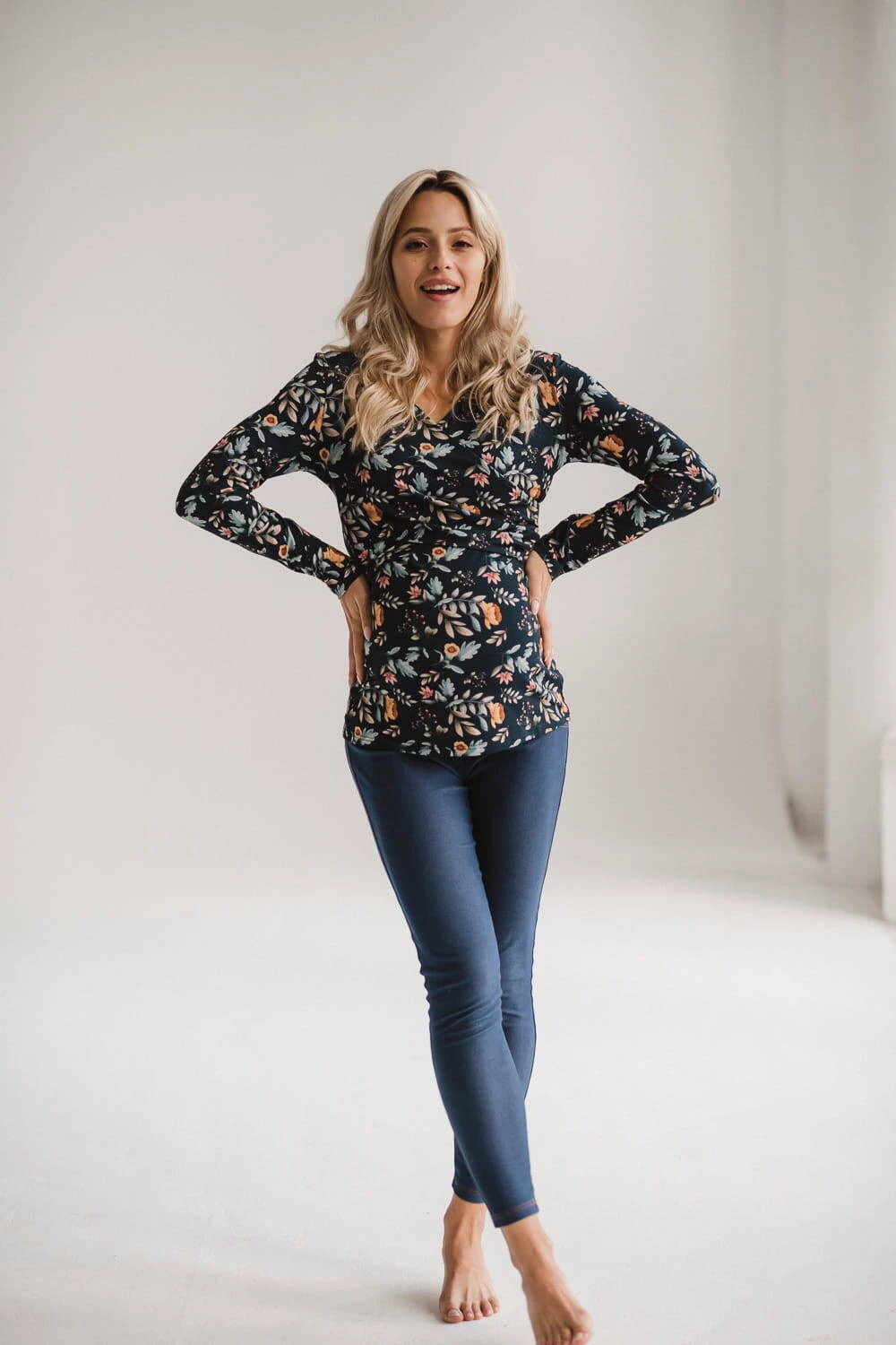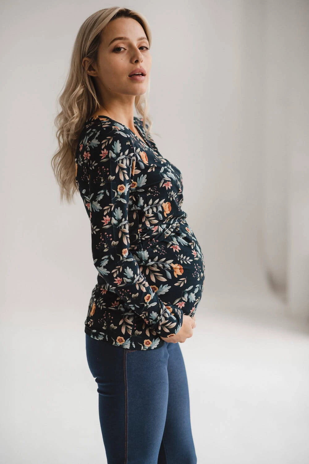 Bluzka dla przyszłych mam z długim rękawem w kwiatowy wzór to unikalny element garderoby, który łączy funkcjonalność, wygodę i modny styl. Kwiatowe motywy na granatowym tle nadają bluzce świeżości i stylowej elegancji. Ta praktyczna bluzka ciążowa została starannie zaprojektowana z myślą o kobietach oczekujących dziecka oraz mamach karmiących, dostarczając im komfortu na każdym etapie ciąży i po niej. Elastyczna dzianina i dopasowany krój doskonale podkreślają rosnący brzuszek ciążowy, jednocześnie zapewniając swobodę ruchu. Wybierz idealne rozwiązanie, jakim jest stylowa bluzka ciążowa, która pozostanie z Tobą na dłużej! Wygodne damskie bluzki ciążowe dla matek karmiących to bestseller, który nie powinien zabraknąć w Twojej garderobie ciążowej!