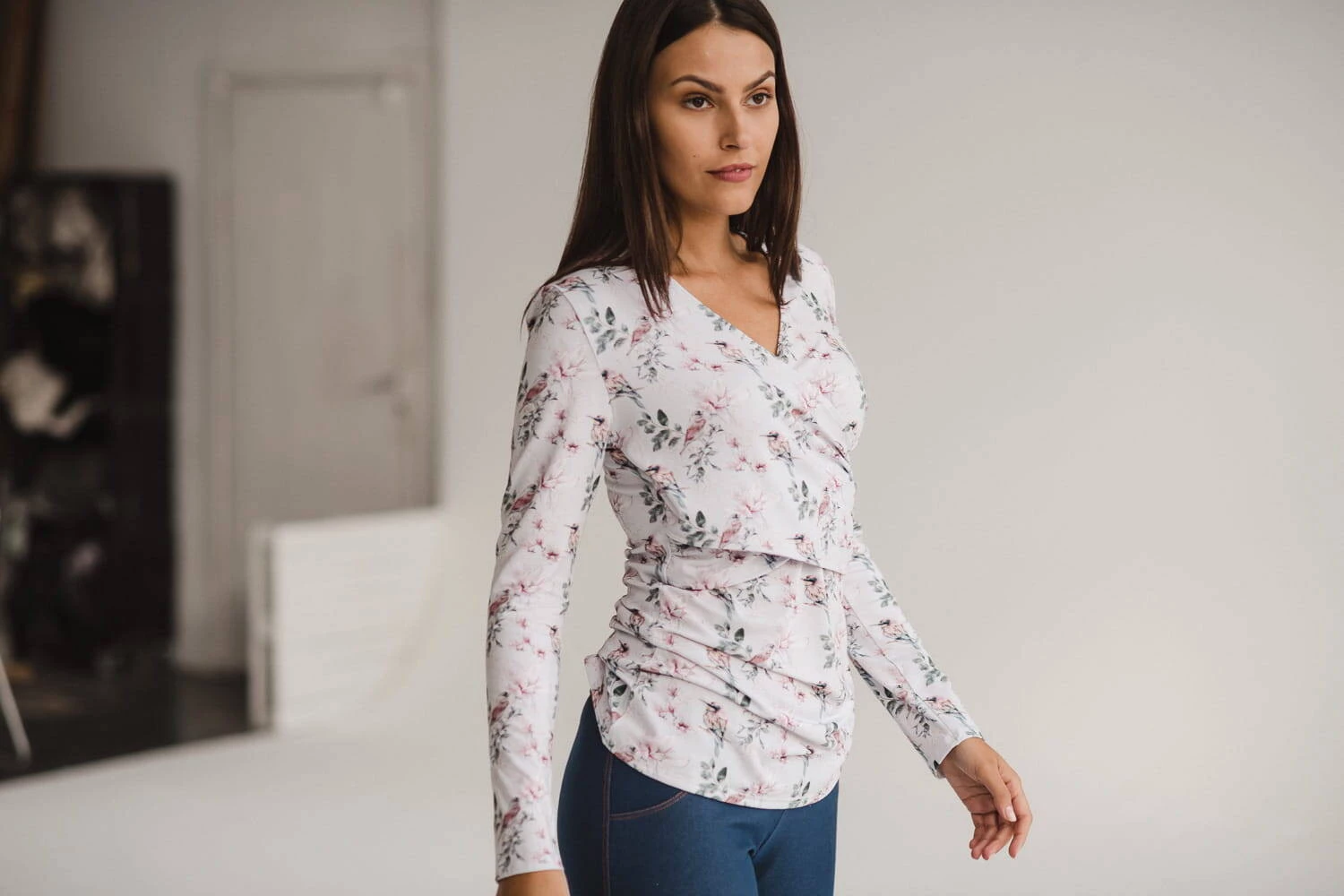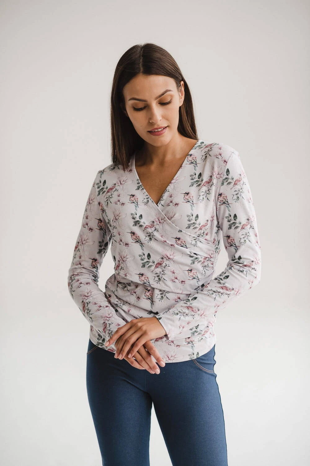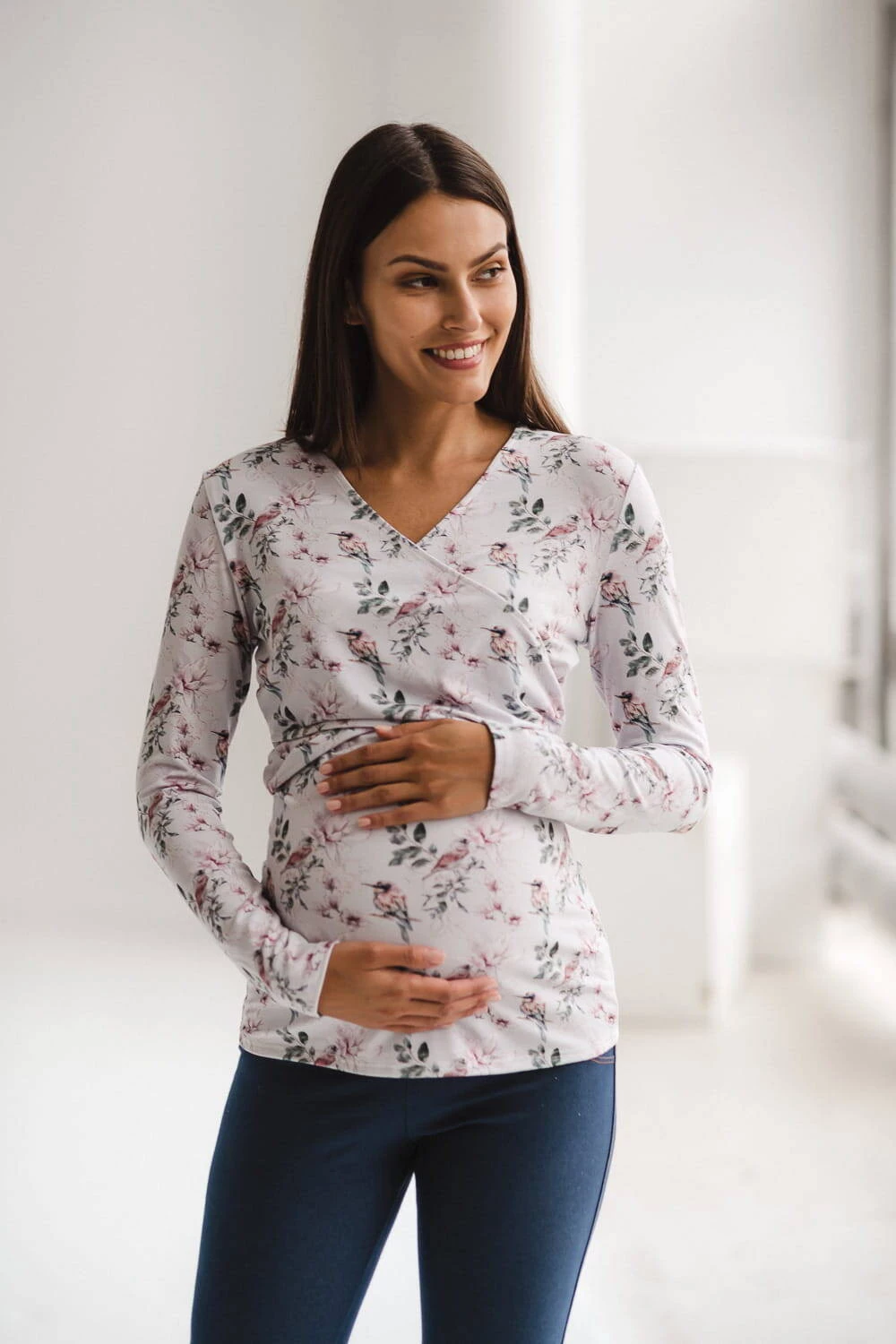 Bluzka ciążowa z długim rękawem w delikatne kwiaty to wyjątkowy element garderoby dla przyszłych mam, łączący funkcjonalność, wygodę i modny look. Magnolie na białym tle prezentują się niezwykle świeżo i stylowo. Ta praktyczna bluzka damska ciążowa została zaprojektowana z myślą o kobietach oczekujących dziecka i mamach karmiących, oferując im komfort na każdym etapie ciąży i po. Elastyczna dzianina i dopasowany krój sprawiają, że bluzka doskonale podkreśla rosnący brzuszek ciążowy, jednocześnie zapewniając swobodę ruchu. Postaw na idealne rozwiązanie jakim jest odzież ciążowa która może zostać z Tobą na dłużej! Wygodne bluzki ciążowe dla matek karmiących to hit sprzedażowy którego nie może zabraknąć w Twojej garderobie ciążowej!