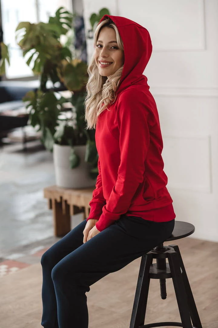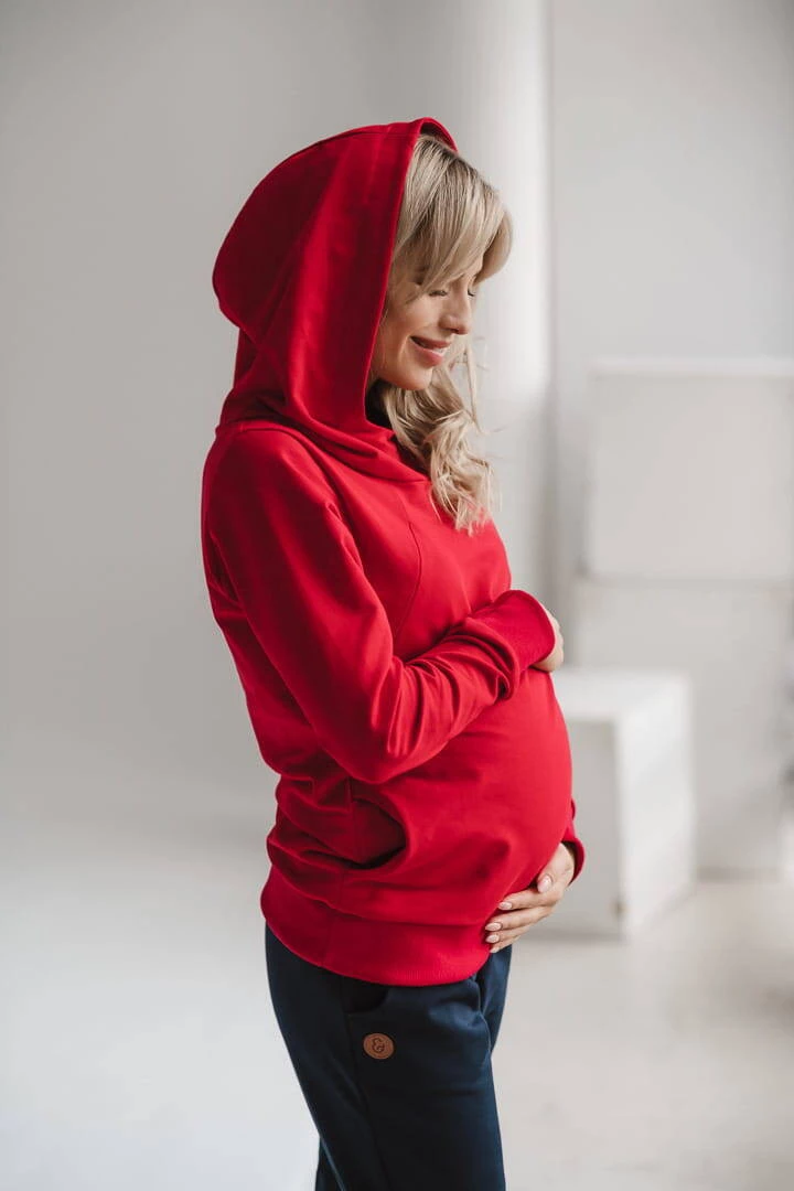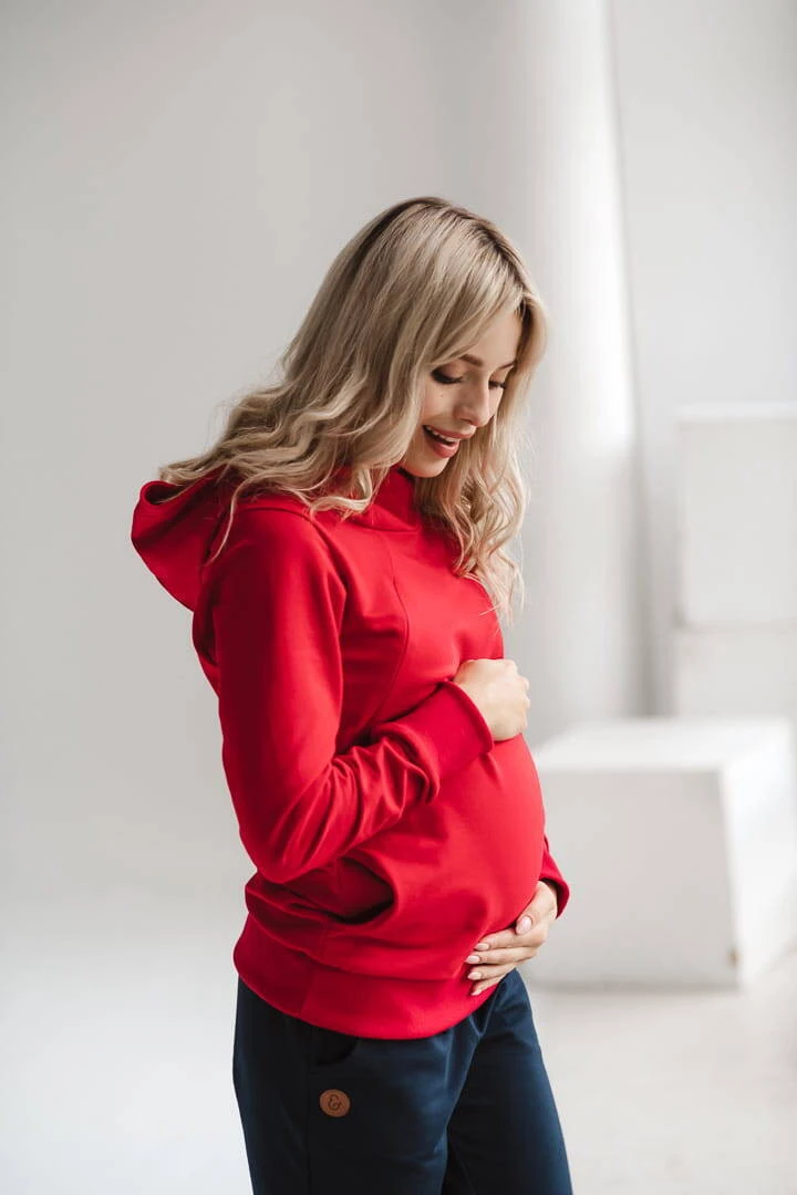 Prezentowana bluza ciążowa została uszyta przez polską markę Milk & Love, która cieszy się zaufaniem kobiet w ciąży i karmiących mam od wielu lat. Atrakcyjna czerwona kobieca tkanina nie uczula, ani nie alergizuje mamy i dziecka w czasie karmienia. Postaw na wygodne i dyskretne karmienie piersią oraz fajny wygląd! Najwyższej jakości bluzy ciążowe z kolekcji Milk Please to różne rozmiary i kolory na pewno znajdziecie tu taką którą pokochacie, i która zostanie z wami na długi czas również po ciąży. Okres ciąży to wyjątkowy czas w życiu kobiety, dlatego warto zainwestować w bluzę ciążową do karmienia piersią która zadba o wasz komfort termiczny w chłodne dni, pozwoli na swobodę ruchów oraz dba o bezpieczeństwo Waszej pociechy. Kobieca bluza sportowa dzięki doskonałemu krojowi nie uciska brzuszka. Bluza do karmienia piersią dzięki zabudowanym ukrytym zamkom pozwoli Ci się cieszyć się z użytkowania naszej sportowej bluzy z kapturem przez wiele lat.