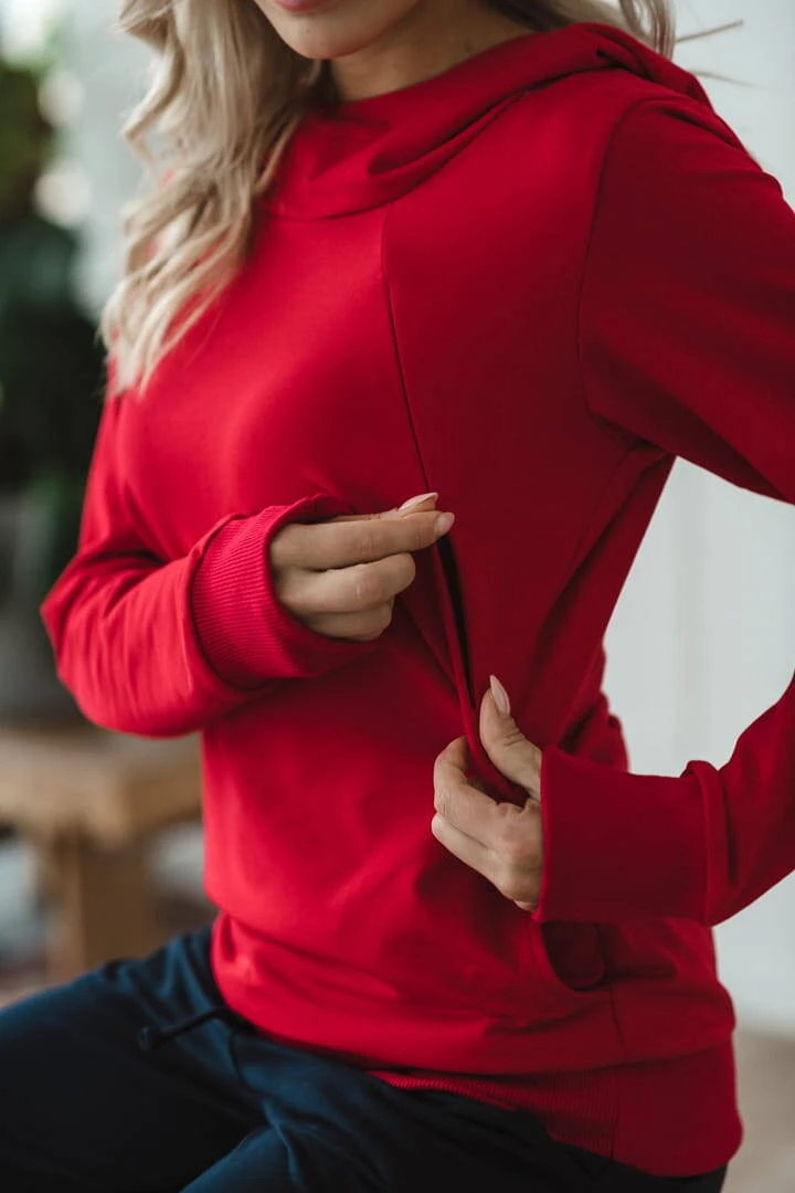 Bluza ciążowa do karmienia piersią w kolorze pięknej czerwieni to stylowy outfit który zostanie z Tobą na długi czas. Jeśli inwestujesz w wygodne karmienie piersią czerwona bluza do karmienia piersią to najlepszy wybór! Atrakcyjny wygląd i funkcjonalność dzięki zamkom również w chłodne dni. Idealna odzież ciążowa na jesienny spacer oraz komfortowe karmienie niezależnie od sytuacji w której dziecko jest głodne. Postaw na wygodny outfit i zainwestuj w sportową bluzę do karmienia, która zostanie z Tobą również po ciąży, ponieważ nasza bluza do karmienia nawet po wielokrotnym praniu pozostaje w niezmienionym kształcie i kolorze.