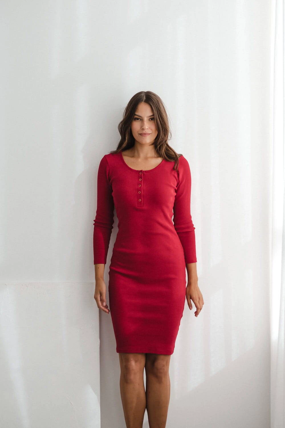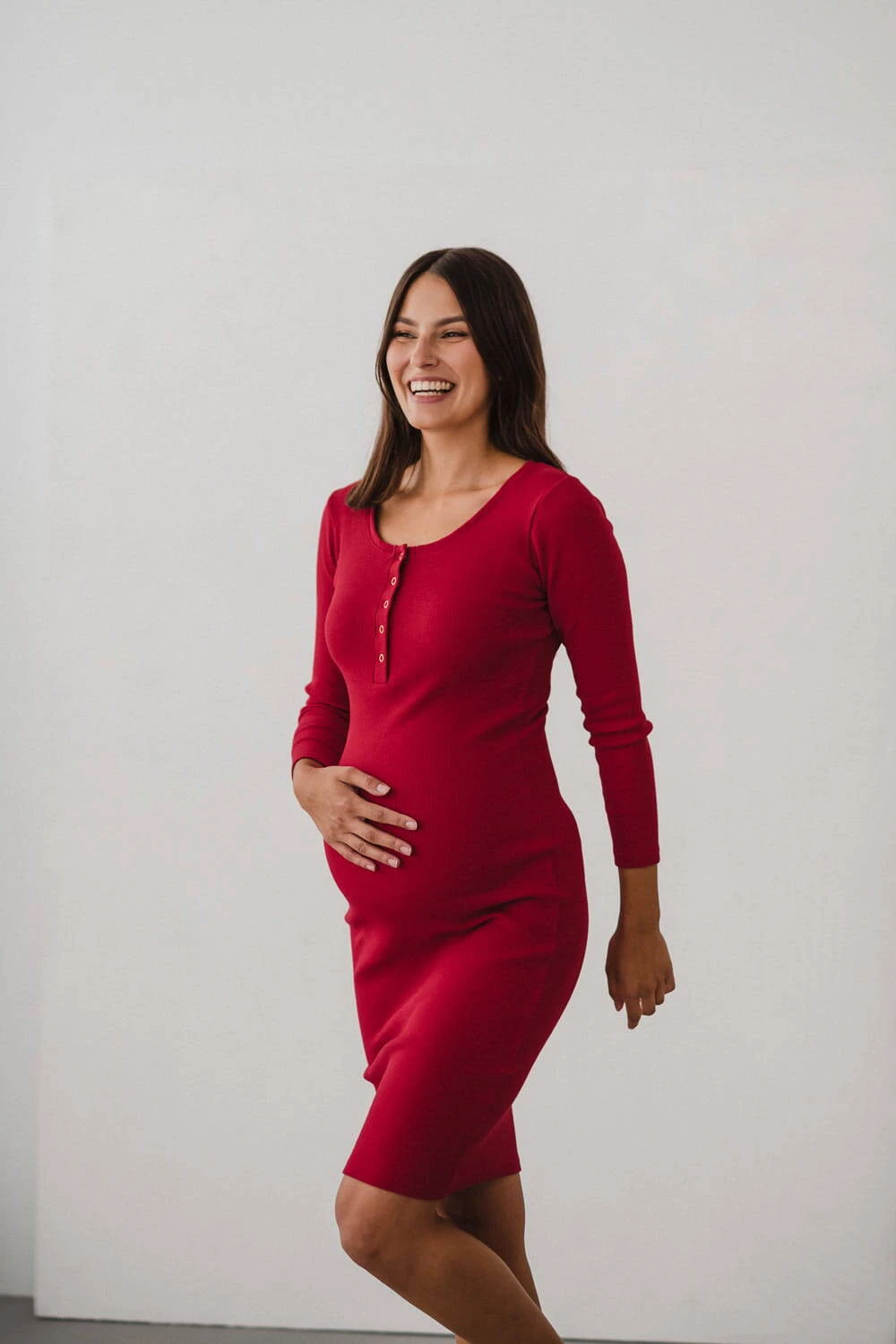 Sukienka ciążowa i do karmienia z kolekcji odzieży ciążowej dostępnej w Formommy, zostala wykonana z prążkowanej dzianiny w kolorze pięknej czerwieni. To ubranie ciążowe jest niezwykle wygodne i kobiece. Dzięki wysokiej jakości materiałowi, który nie odkształca się i zapewnia komfort noszenia, nasze ubrania ciążowe w tym również czerwona sukienka dla karmiących mam, zostaną z Tobą na długi czas. Idealna sukienka ciążowa typu basic posiada dopasowany krój, oraz napy przy dekolcie, co ułatwia swobodne i dyskretne karmienie piersią. Wygodne sukienki dla ciężarnych/sukienki do karmienia piersią są doskonałe od I trymestru, możesz również nosić je po ciąży jak tradycyjne proste sukienki.