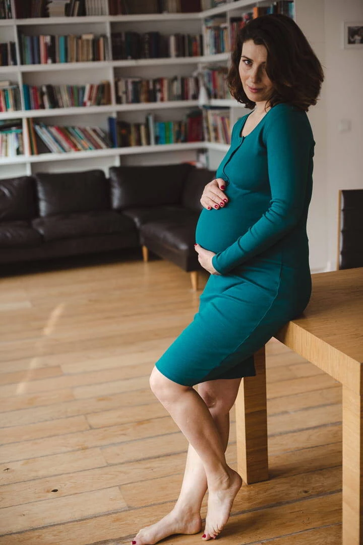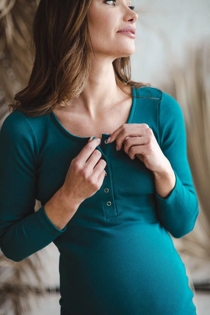 Sukienka ciążowa i do karmienia z kolekcji odzieży ciążowej dostępnej w Formommy, zostala wykonana z prążkowanej dzianiny w kolorze turkusu. To ubranie ciążowe jest niezwykle wygodne i kobiece. Dzięki wysokiej jakości materiałowi, który nie odkształca się i zapewnia komfort noszenia, nasze ubrania ciążowe i sukienka dla karmiących mam zostaną z Tobą na długi czas. Idealna sukienka ciążowa typu basic posiada dopasowany krój, oraz napy przy dekolcie, co ułatwia swobodne i dyskretne karmienie piersią. Wygodne sukienki dla ciężarnych/sukienki do karmienia piersią są doskonałe od I trymestru, możesz również nosić je po ciąży jak tradycyjne proste sukienki.