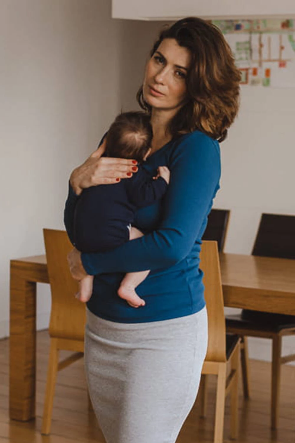 Bluzka ciążowa i do karmienia w wyjątkowym odcieniu granatu, została wykonana z prążkowanej dzianiny, zapewnia niezwykły komfort. Dzięki wysokiej jakości materiałowi, który utrzymuje swój kształt i gwarantuje wygodę użytkowania, ta damska bluzka ciążowa będzie towarzyszyć Ci przez długi czas. Doskonała jako bluzka ciążowa i zwykła w typie basic, posiada dopasowany krój oraz zapięcia na napy przy dekolcie, ułatwiające swobodne karmienie maluszka. Te wygodne bluzki ciążowe świetnie sprawdzają się już od pierwszego trymestru, a po ciąży mogą być noszone jako zwyczajne bluzki. Fasony bluzek ciążowych Tummy doskonale nadają się na co dzień i na specjalne okazje. Stylowe bluzki ciążowe wykonano z bawełnianej dzianiny, która przeszła rygorystyczne testy bezpieczeństwa dla kobiet w ciąży i dzieci. Elastyczny materiał utrzymuje swoją miękkość i intensywność koloru nawet po wielu praniach. Nasze bluzki ciążowe dla matek karmiących to idealne rozwiązanie na długi czas, dlatego nie powinno ich zabraknąć w Twojej garderobie ciążowej.