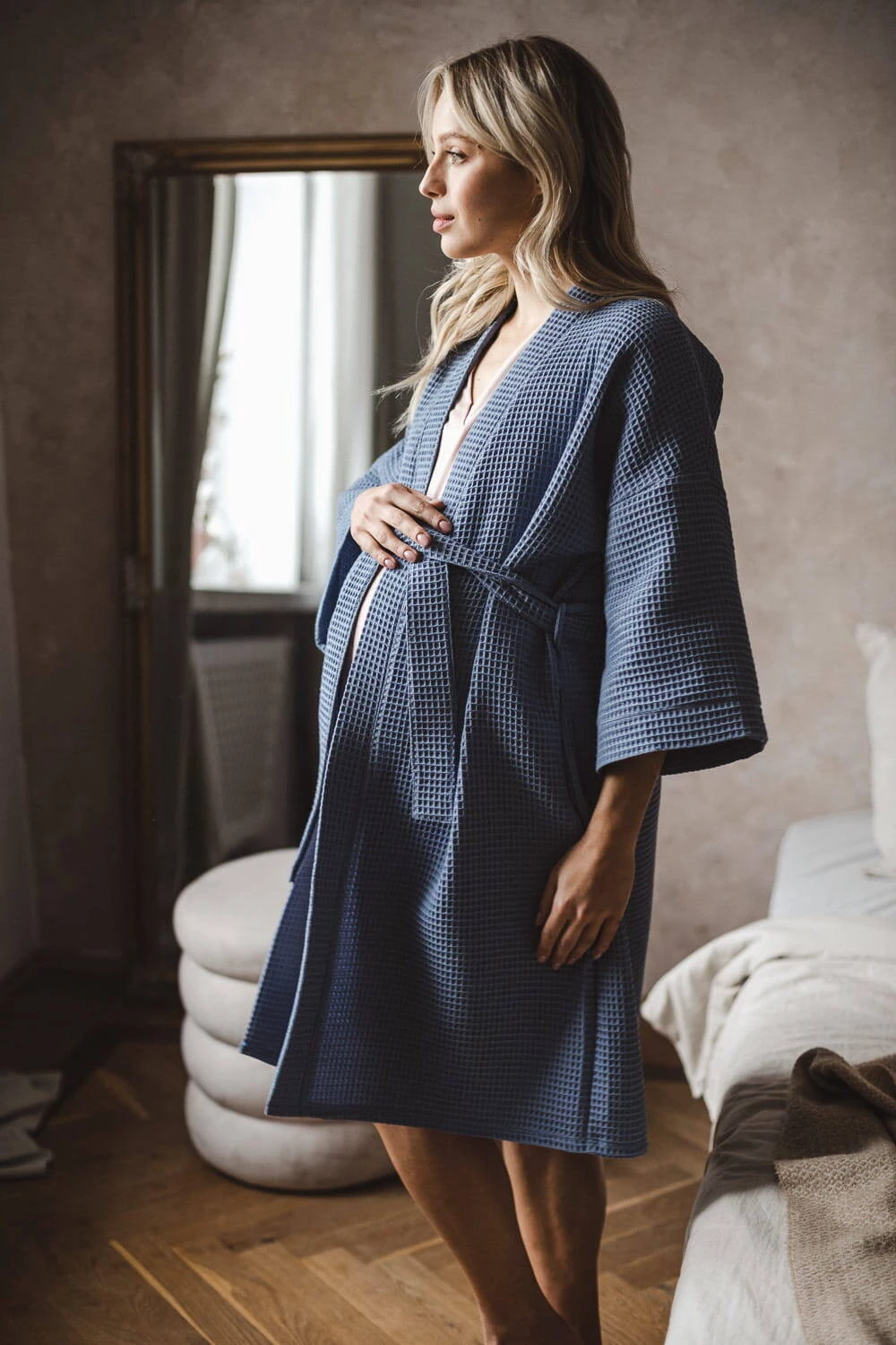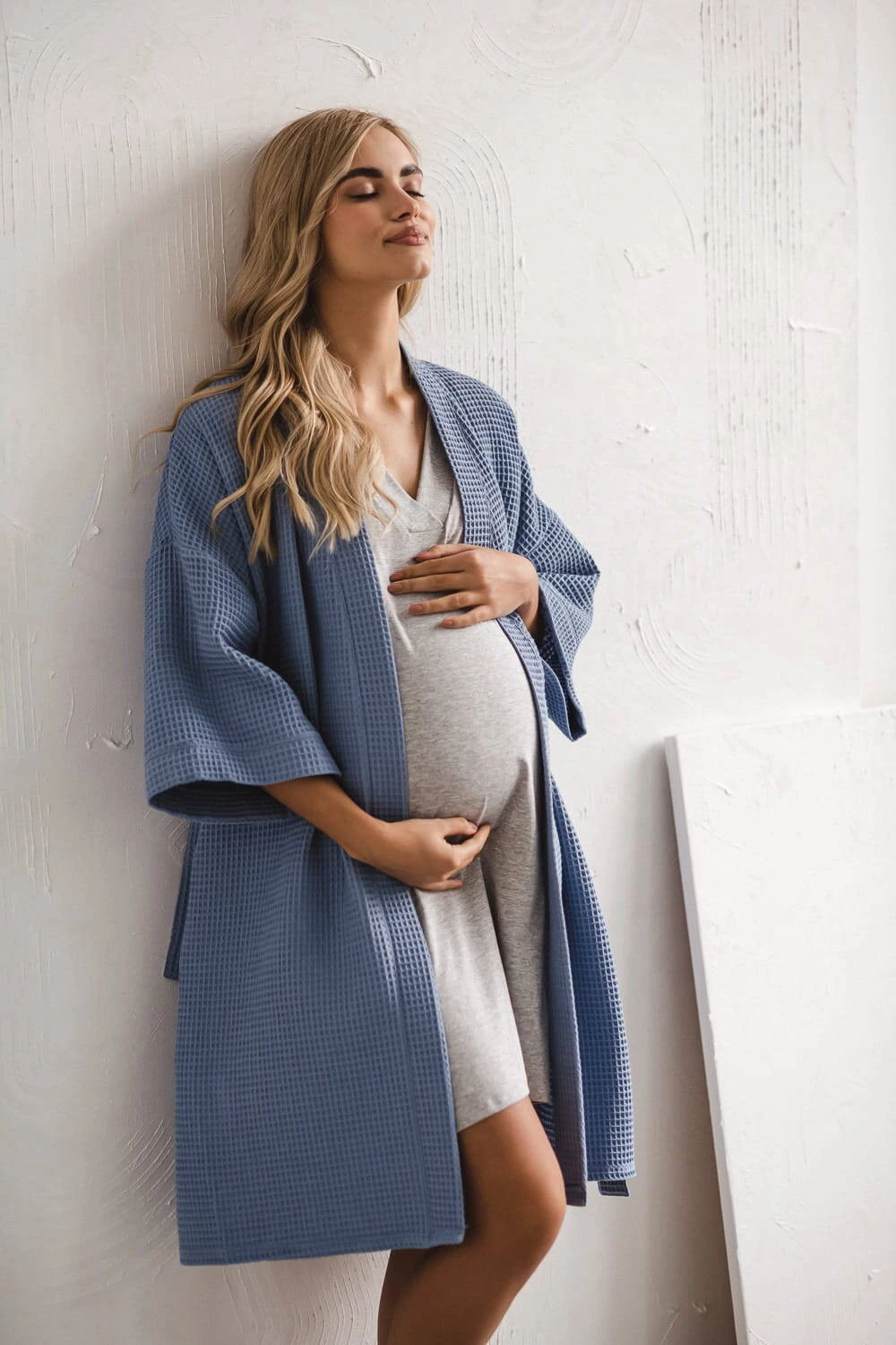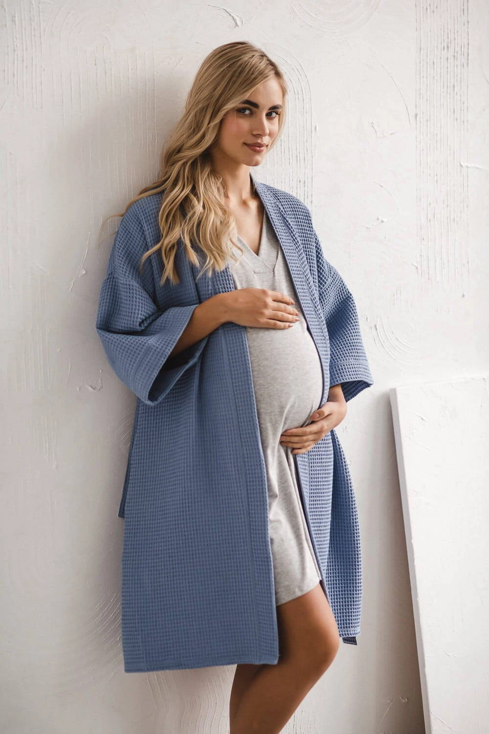 Wyprawka przyszłej mamy musi zawierać szlafrok na okres ciąży i po kiedy bardzo potrzebujesz komfortu. Nasz bawełniany szlafrok z rękawami kimono 7/8 jest odpowiednio długi, dlatego idealny na okres połogu, a jego rękawy nie będą przeszkadzać w codziennych czynnościach związanych z opieką nad noworodkiem. Szlafrok do szpitala wykonany jest z najwyższej jakości, oddychającej 100% bawełny, która przeszła rygorystyczne testy zgodnie z normami Oeko-Tex Standard 100. Ten wygodny i stylowy szlafrok ciążowy został uszyty w Polsce, oferując najwyższą jakość wykonania. To niebieskie bawełniane kimono w wafelkowy deseń zostało stworzone z myślą o przyszłych matkach - jest nieco dłuższe, żebyś mogła komfortowo owinąć nim swój ciążowy brzuszek, a po porodzie swobodnie przechadzać się po szpitalnych korytarzach lub wygodnie karmić swoje dziecko w połogu. Bawełniany szlafrok ciążowy wyposażony jest w praktyczne kieszenie na drobiazgi oraz pasek do regulacji szerokości. Szlafrok damski ciążowy otuli Cię po kąpieli możesz go założyć zarówno na piżamę ciążową jaki na koszulę damską do karmienia. Cienki szlafrok nie ogrzeje Cię w chłodne dni, a nasz wyjątkowy wygodny szlafrok damski ciążowy to idealny model w okresie ciąży i po.