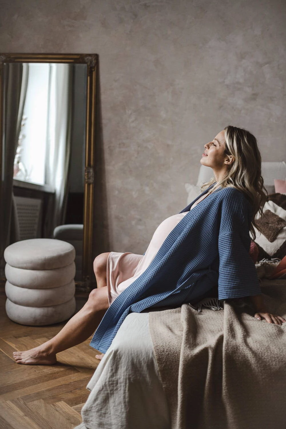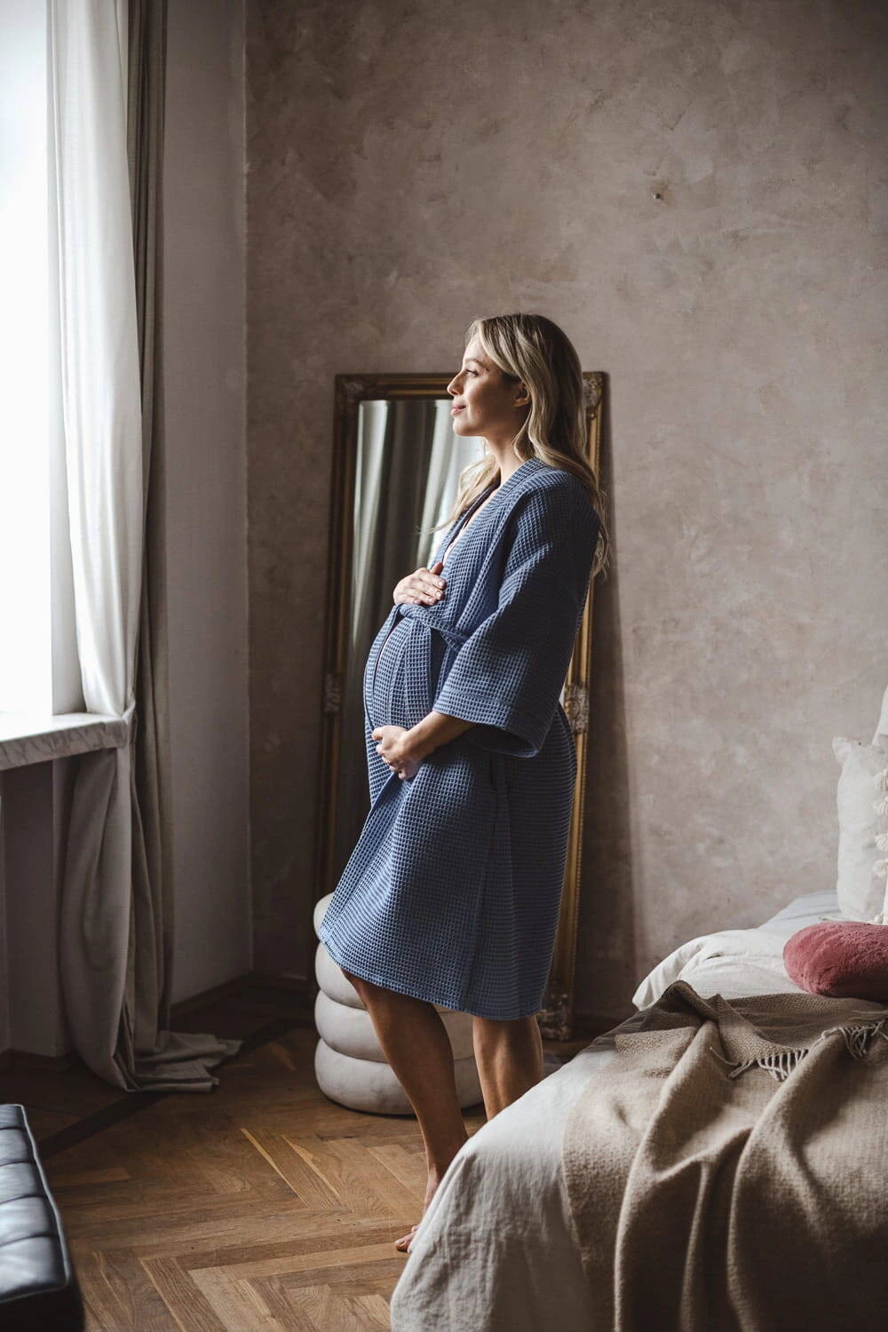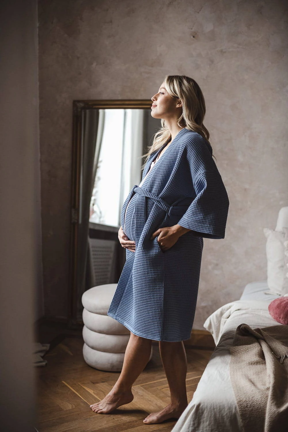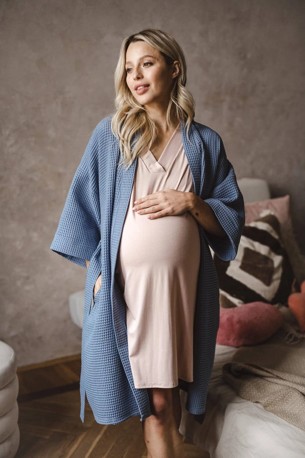 Wyprawka przyszłej mamy musi zawierać szlafrok na okres ciąży i po kiedy bardzo potrzebujesz komfortu. Nasz bawełniany szlafrok z rękawami kimono 7/8 jest odpowiednio długi, dlatego idealny na okres połogu, a jego rękawy nie będą przeszkadzać w codziennych czynnościach związanych z opieką nad noworodkiem. Szlafrok do szpitala wykonany jest z najwyższej jakości, oddychającej 100% bawełny, która przeszła rygorystyczne testy zgodnie z normami Oeko-Tex Standard 100. Ten wygodny i stylowy szlafrok ciążowy został uszyty w Polsce, oferując najwyższą jakość wykonania. To niebieskie bawełniane kimono w wafelkowy deseń zostało stworzone z myślą o przyszłych matkach - jest nieco dłuższe, żebyś mogła komfortowo owinąć nim swój ciążowy brzuszek, a po porodzie swobodnie przechadzać się po szpitalnych korytarzach lub wygodnie karmić swoje dziecko w połogu. Bawełniany szlafrok ciążowy wyposażony jest w praktyczne kieszenie na drobiazgi oraz pasek do regulacji szerokości. Szlafrok damski ciążowy otuli Cię po kąpieli możesz go założyć zarówno na piżamę ciążową jaki na koszulę damską do karmienia. Cienki szlafrok nie ogrzeje Cię w chłodne dni, a nasz wyjątkowy wygodny szlafrok damski ciążowy to idealny model w okresie ciąży i po.