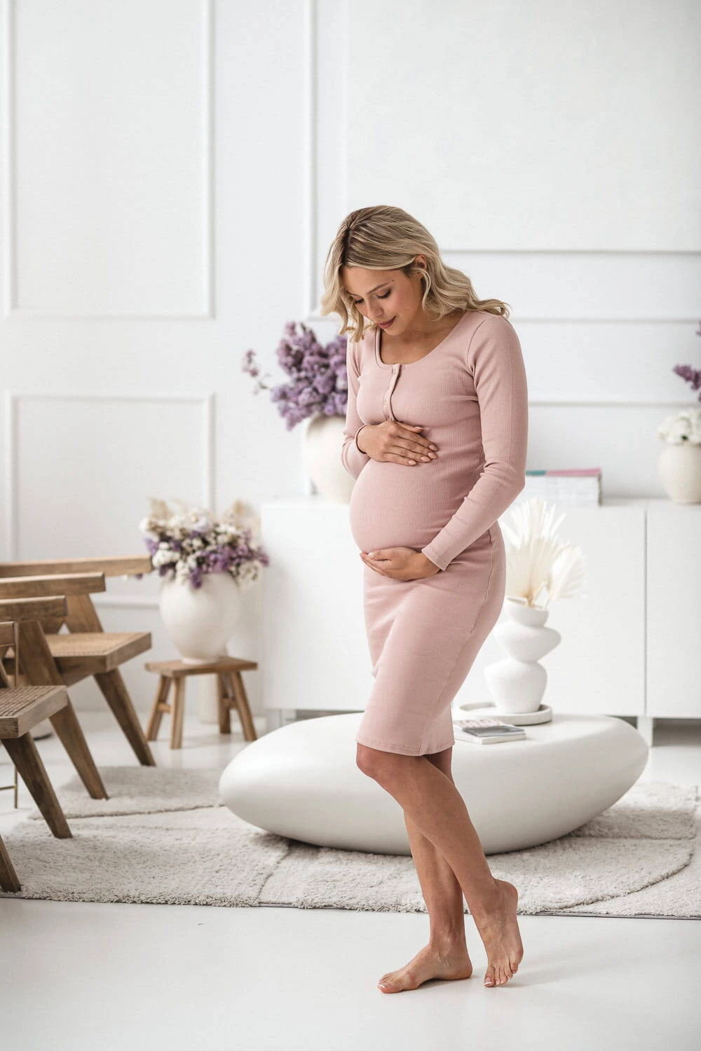 Przekonaj się sama, jak nasza pudrowa sukienka dla karmiących mam Tummy sprawi, że poczujesz się pewnie i pięknie przez cały czas ciąży oraz po jej zakończeniu. Idealna sukienka do karmienia piersią , może być Twoim niezastąpionym towarzyszem w najważniejszych chwilach Twojego życia.