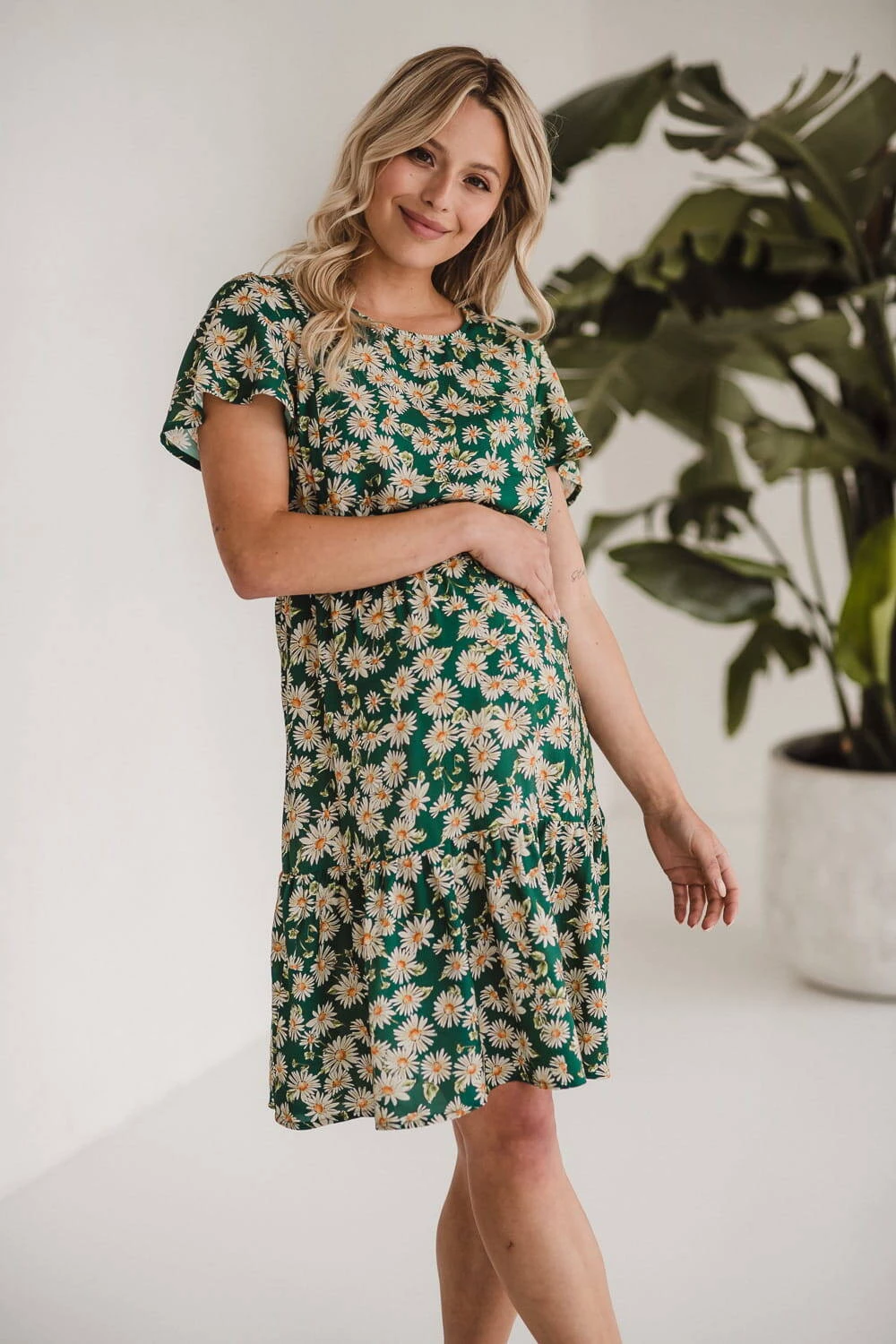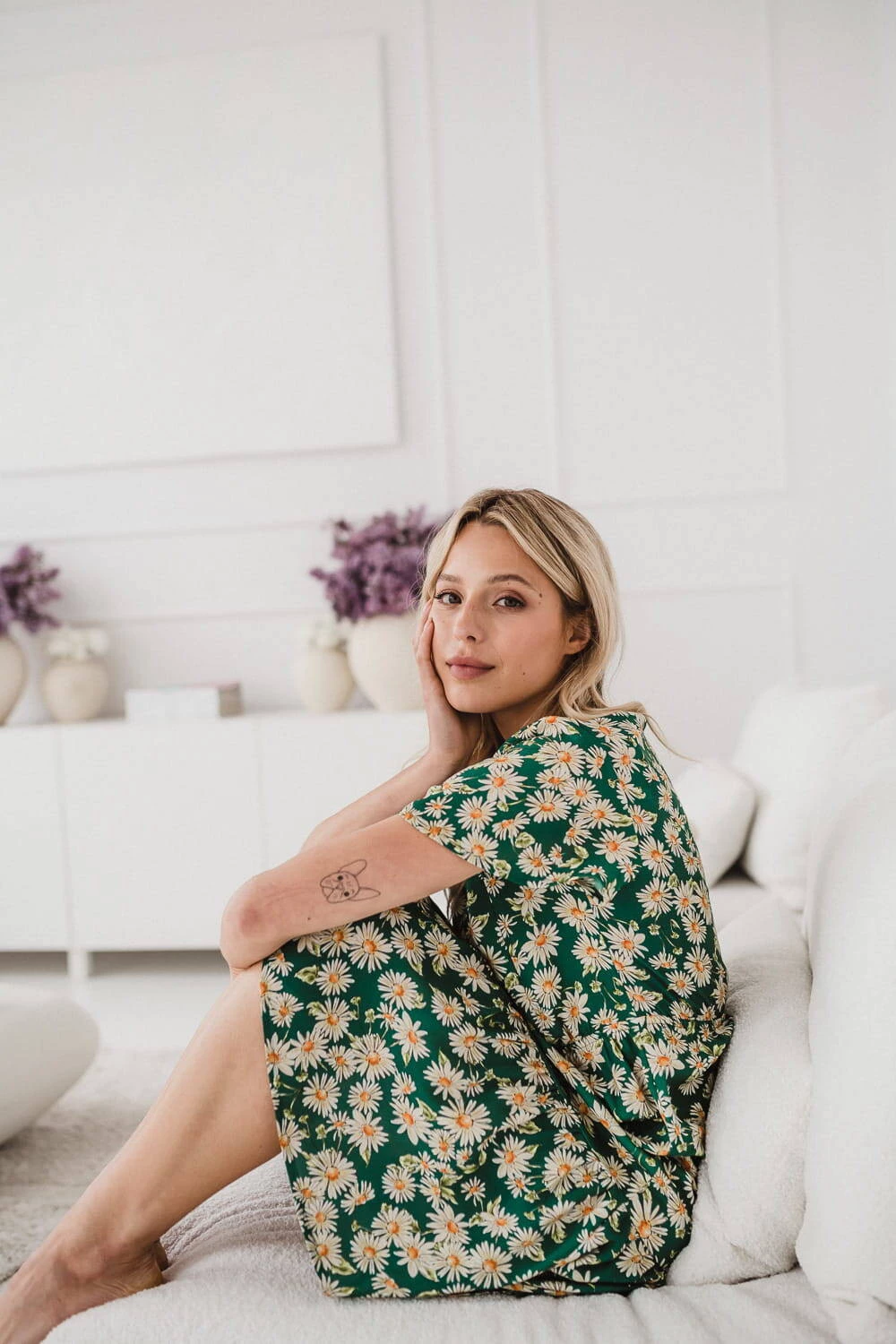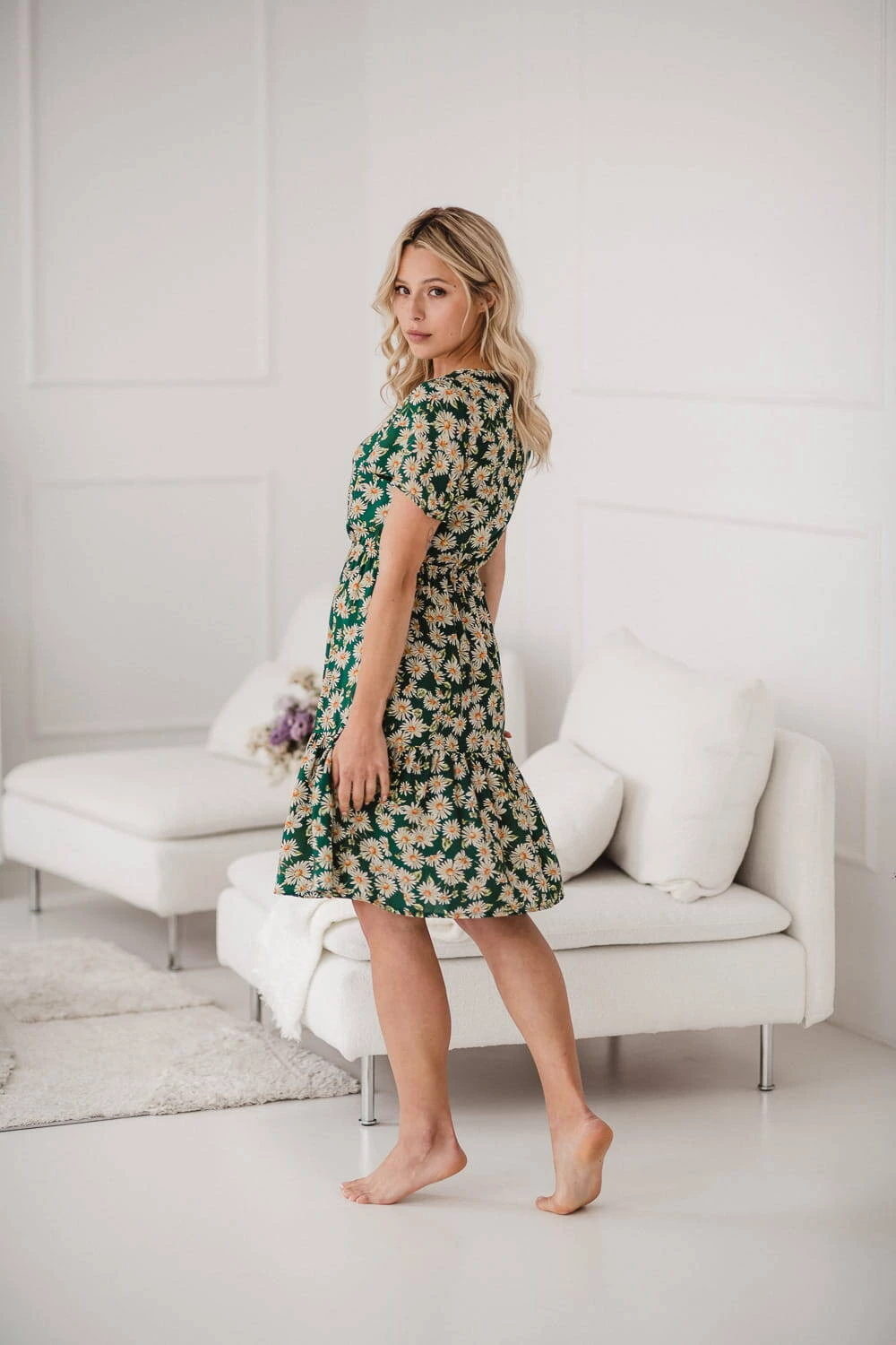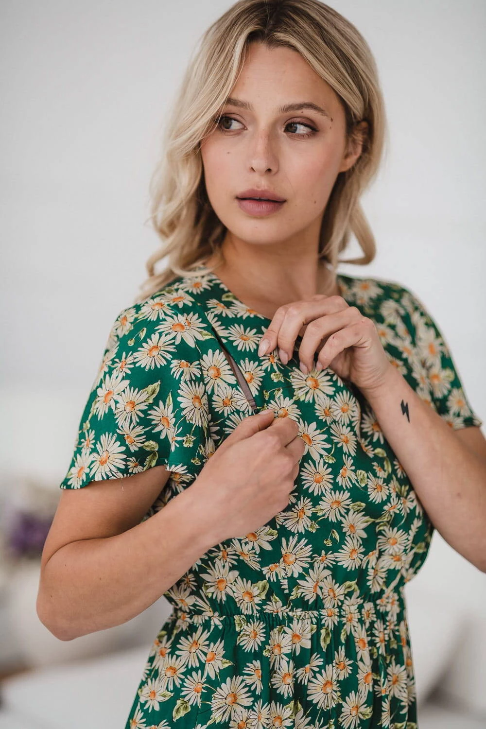 Delikatna sukienka ciążowa i do karmienia piersią na ciepłe letnie dni! Ten model zielonej sukienki do karmienia piersią jest przeznaczony do noszenia również w ciąży, posiada krótkie rękawy i jest wykończony uroczą falbanką. Sukienki dla karmiących mam z elastyczną gumką pod biustem, sprawiają że ten fason pięknie dopasowuje się zarówno do brzuszka w ciąży, jak i po porodzie. Sukienki dla mam i świeżo upieczonych mam zostały uszyte w Polsce z wysokiej jakości tkaniny wiskozowej w oryginalnym wzorze rumianków na zielonym tle.