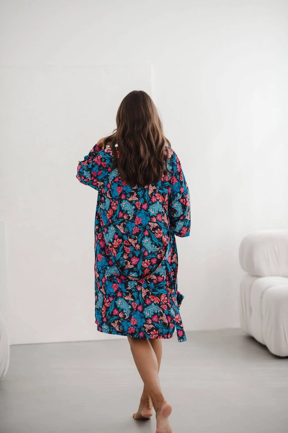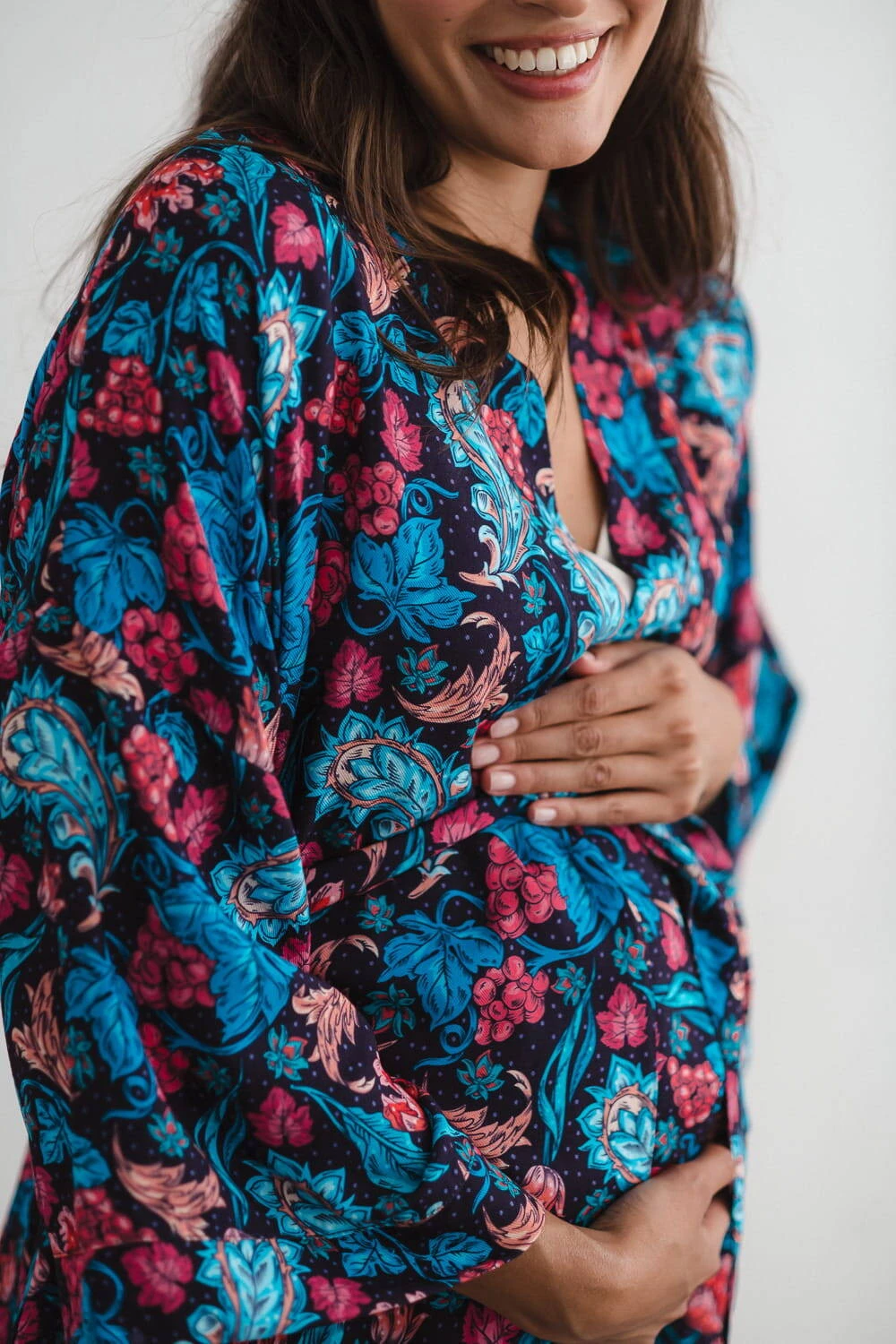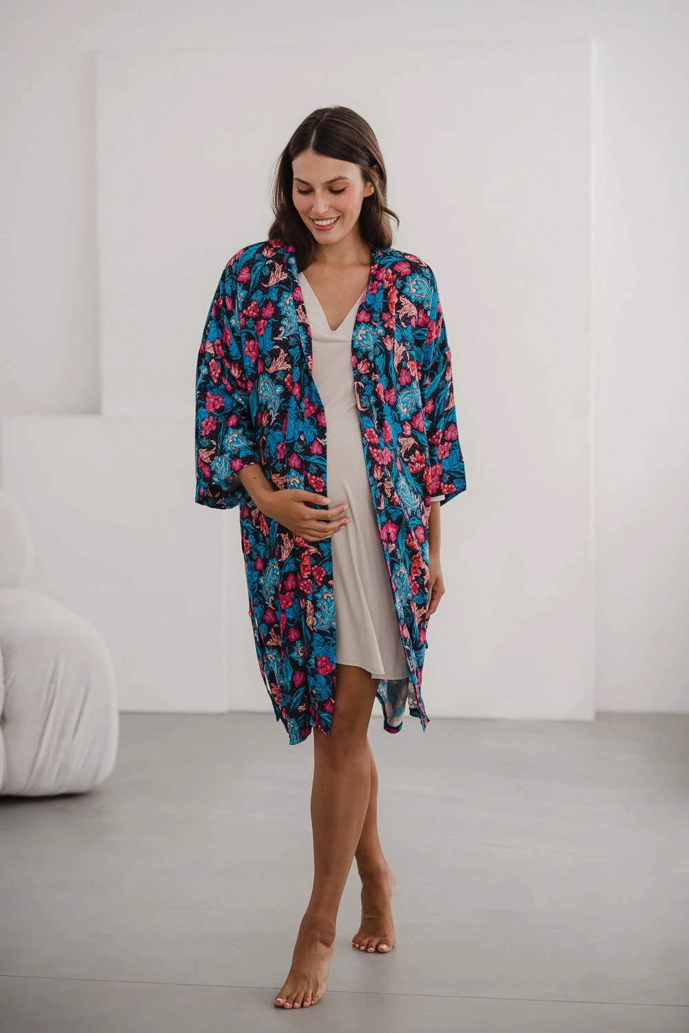 Odkryj magiczny świat wygody i elegancji - poznaj nasz limitowany szlafrok ciążowy wykonanych z eleganckiej bambusowej tkaniny w kolorowy print na czarnym tle. Wygodny szlafrok to odzież którą koniecznie musi zawierać wyprawka przyszłej mamy. Szlafrok ciążowy do szpitala Noc orientu może być Twoją oazą spokoju i komfortu - 100% wiskoza bambusowa otuli Twoje ciało w ciąży i po porodzie, zapewniając niepowtarzalną delikatność i uczucie lekkości. Odpowiednio długi, idealnie sprawdzi się w czasie połogu, a krótkie rękawy 7/8 pozwolą Ci swobodnie wykonywać codzienne czynności, nie krępując ruchów podczas opieki nad noworodkiem.