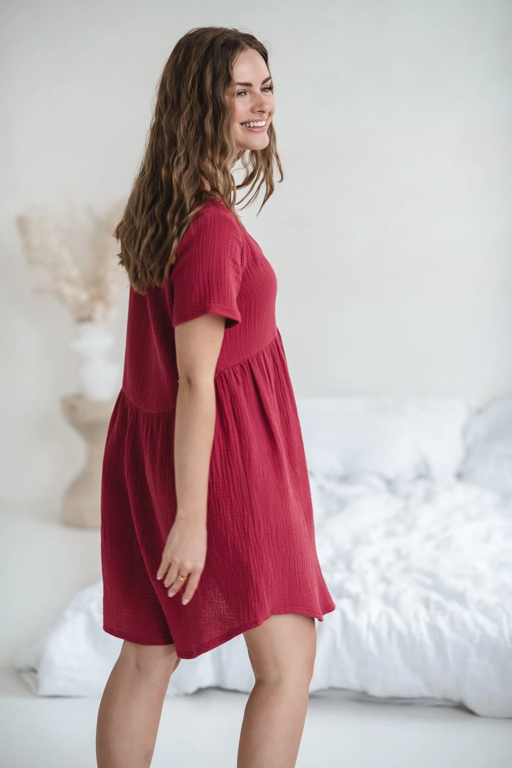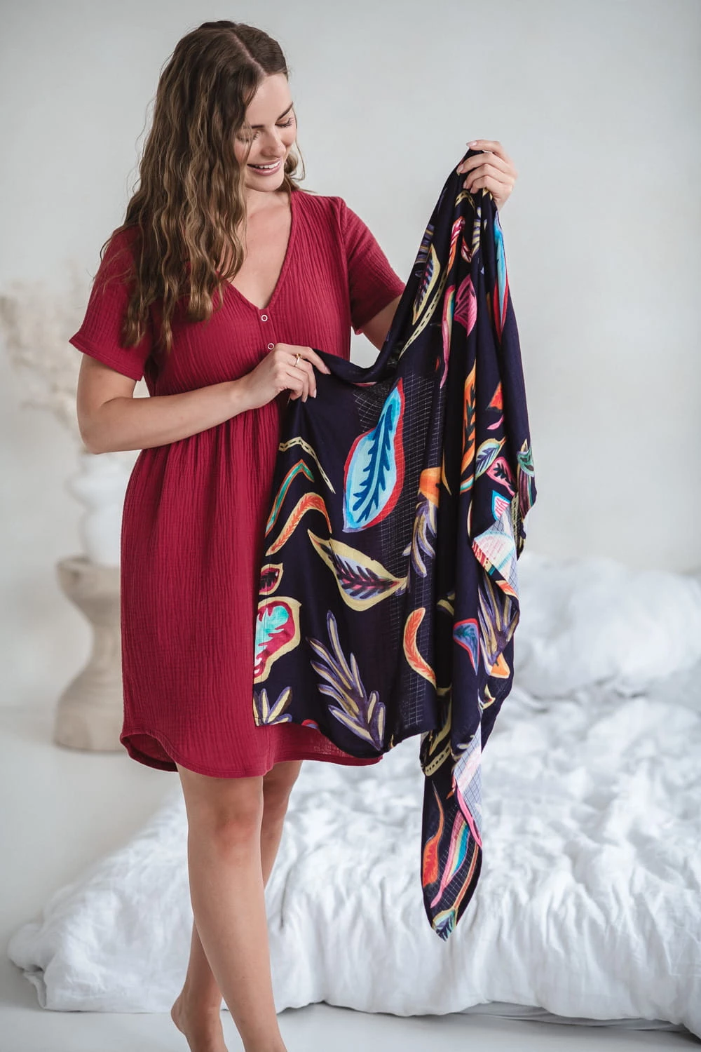Luźny, oversizowy krój gwarantuje pełną swobodę ruchów i miejsce na rosnący brzuszek. To również doskonały wybór jako koszula do porodu, a po narodzinach dziecka – jako wygodna sukienka do noszenia w połogu.