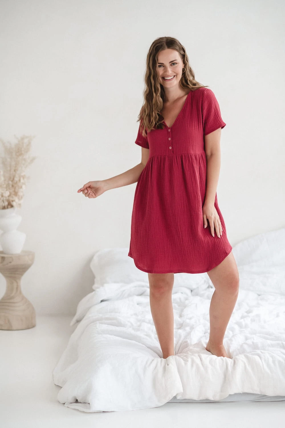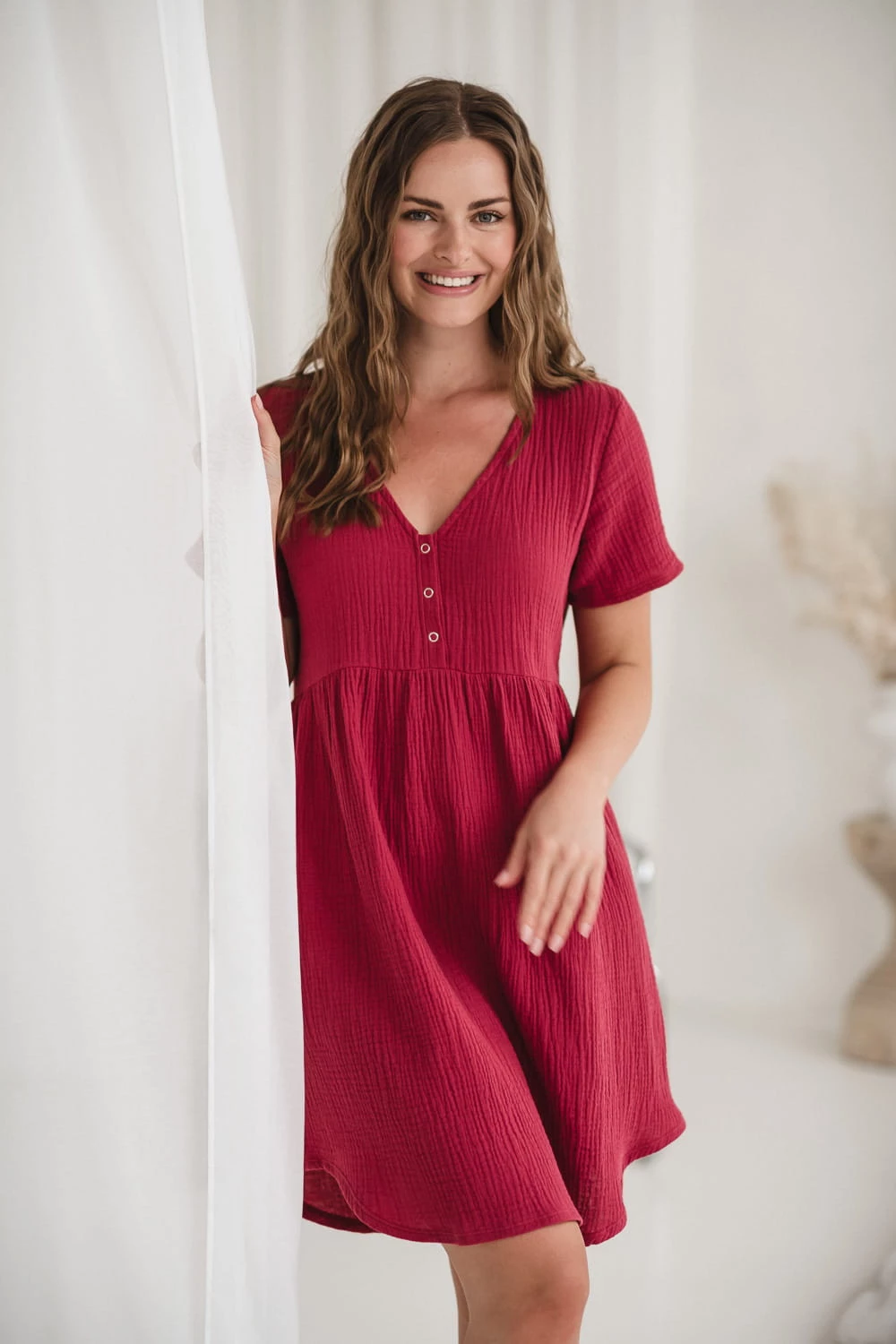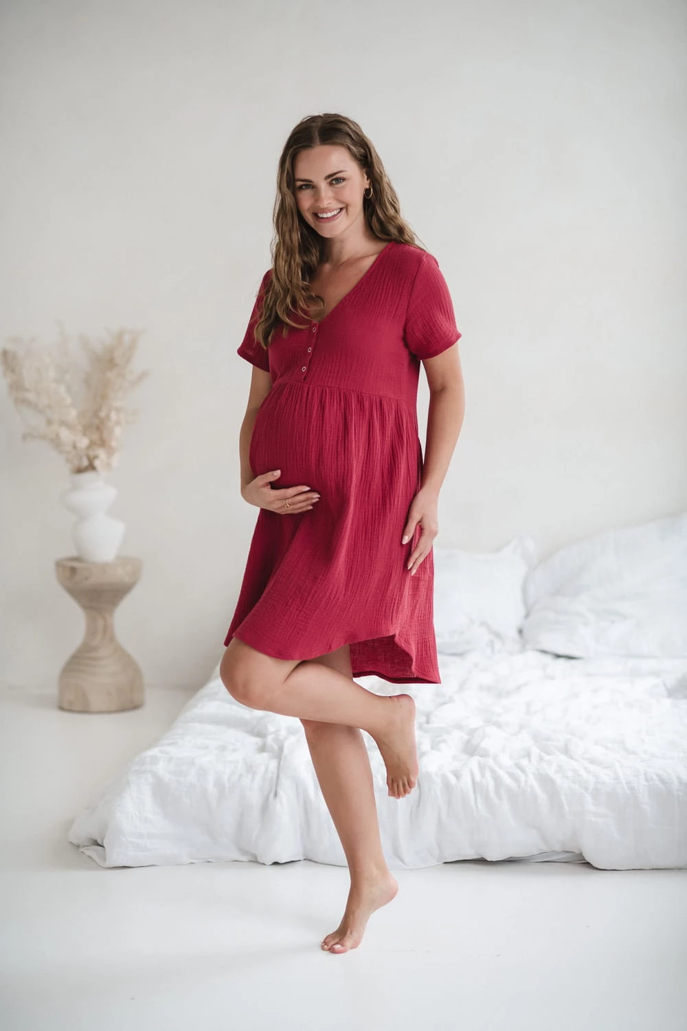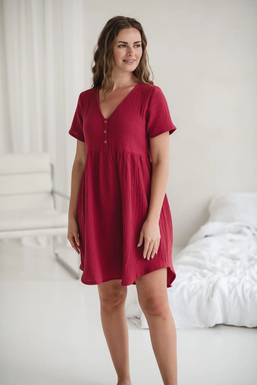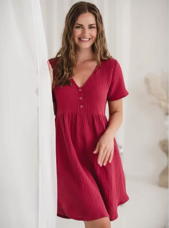Czerwona koszula nocna ciążowa i do karmienia z bawełny muślinowej – model Aurora
