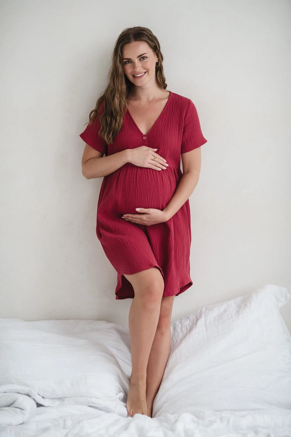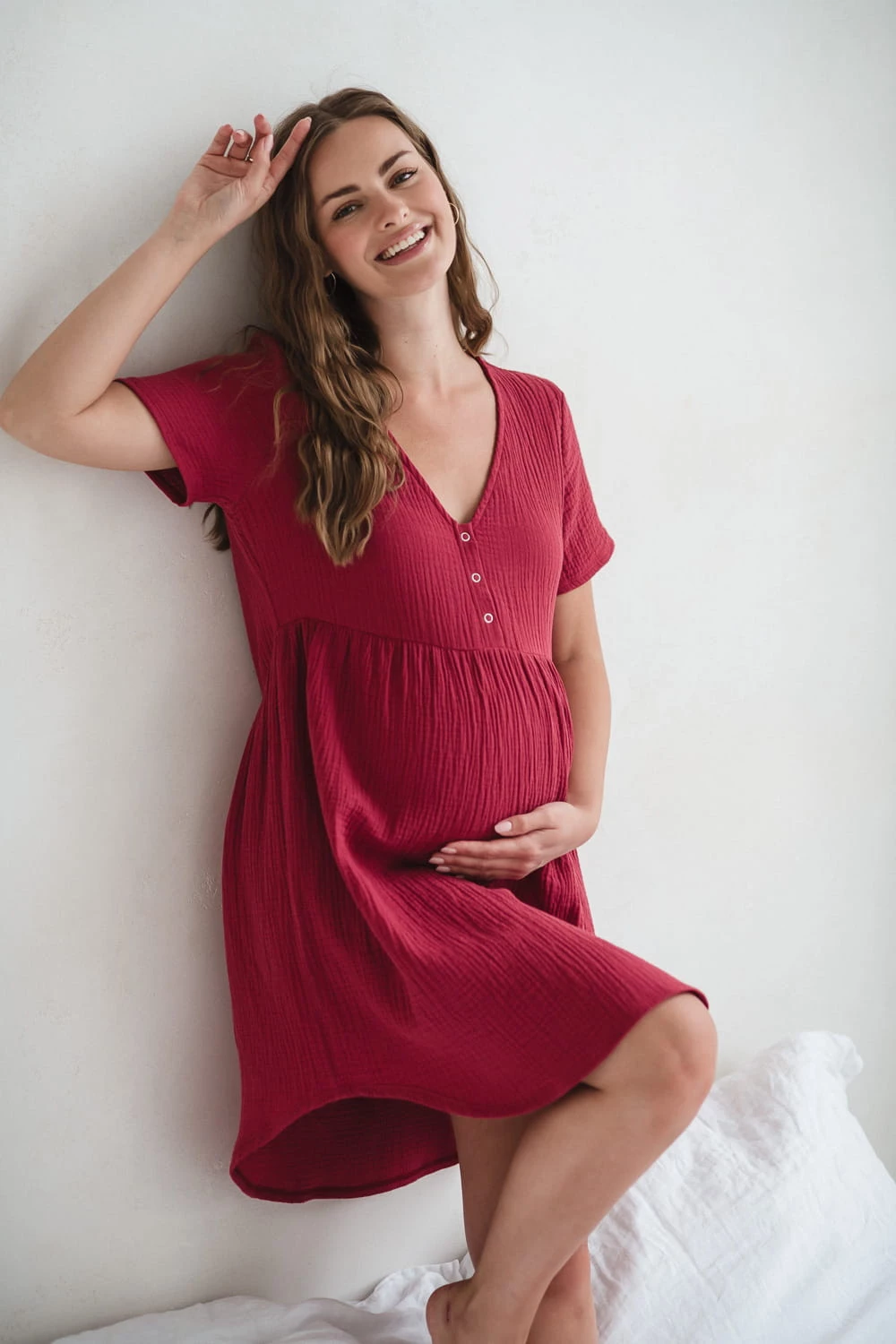 Długość za kolano oraz piękny, malinowy odcień nadają koszuli ponadczasowy wygląd. To praktyczna koszula ciążowa i do karmienia, w której bez skrępowania przejdziesz się po szpitalnym korytarzu i z łatwością nakarmisz dziecko w pozycji leżącej.