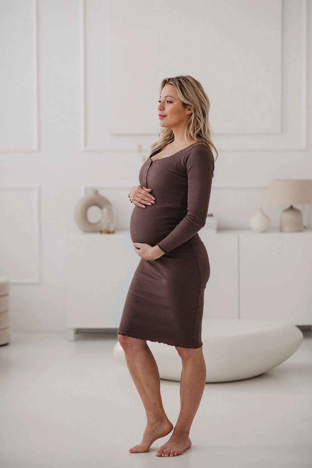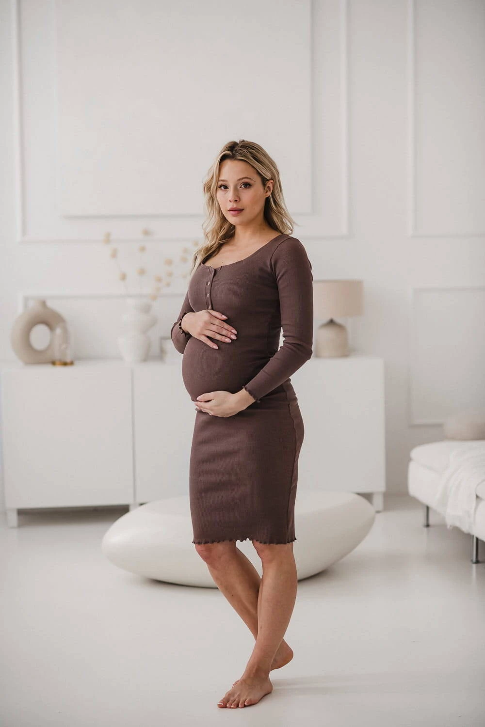 Zapewnij sobie niezrównany komfort i styl w naszej sukience ciążowej Tummy w kolorze cappuccino! Ta wyjątkowa sukienka dla mam wykonana jest z najwyższej jakości prążkowanej dzianiny. Sukienka dla ciężarnych która jest stworzona, aby towarzyszyć Ci w okresie karmienia piersią i w najpiękniejszych momentach macierzyństwa. Dzięki swojemu uniwersalnemu krojowi, możesz nosić ją zarówno przed, w trakcie jak ciąży i jako świeżo upieczona mama! Elastyczna struktura dzianiny pomieści nawet największy brzuszek, zapewniając Ci pełną swobodę ruchu i wygodę, której potrzebujesz w tym wyjątkowym okresie życia.