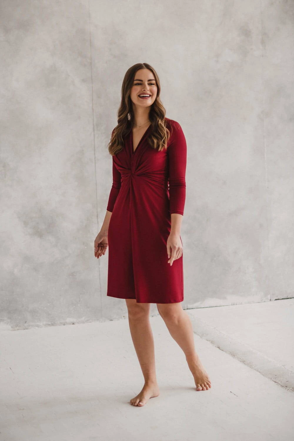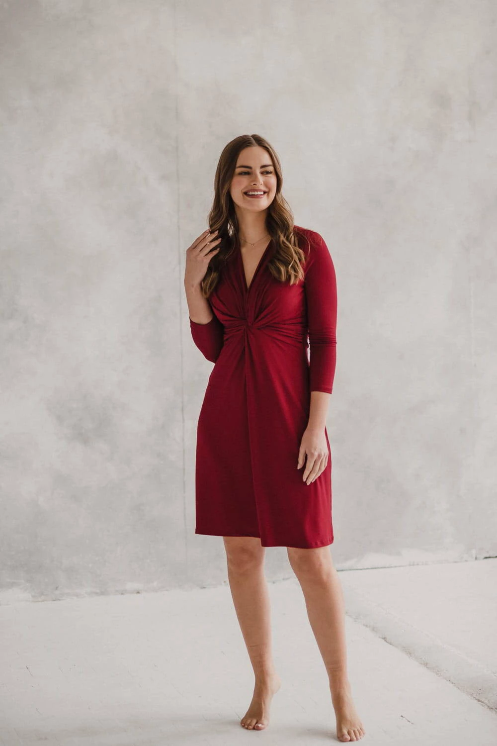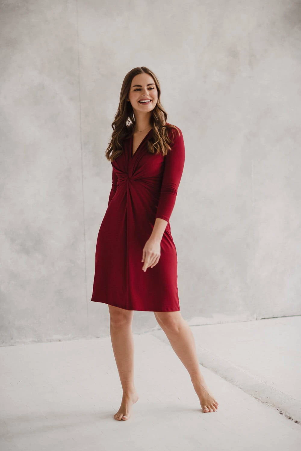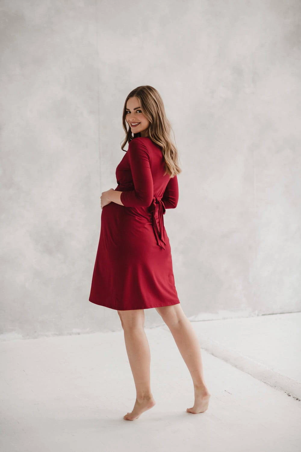 Wysokiej jakości idealna sukienka dla kobiet w ciąży, w kolorze ciemnego wina wykonana z elastycznej wiskozy, która dopasowuje się do rosnącego brzuszka. Sukienka dla przyszłych mam która daje swobodną możliwość karmienia dziecka poprzez odchylenie dekoltu. Ta bordowa niebanalna sukienka ciążowa posiada wszyty pasek, który można idealnie dopasować do figury zarówno w czasie ciąży, jak i po porodzie. Kobieca i modna sukienka ciążowa uszyta z wysokiej jakości wiskozowej dzianiny, z pięknym dekoltem i dekoracyjnym węzłem z przodu, nadającym elegancki i stylowy wygląd przyszłej i młodej mamie. Ta sukienka ciążowa na co dzień i na większe wyjście została wyprodukowana w Polsce z najwyższą starannością. Idealna sukienka do karmienia sprawdzi się w okresie ciąży i połogu
