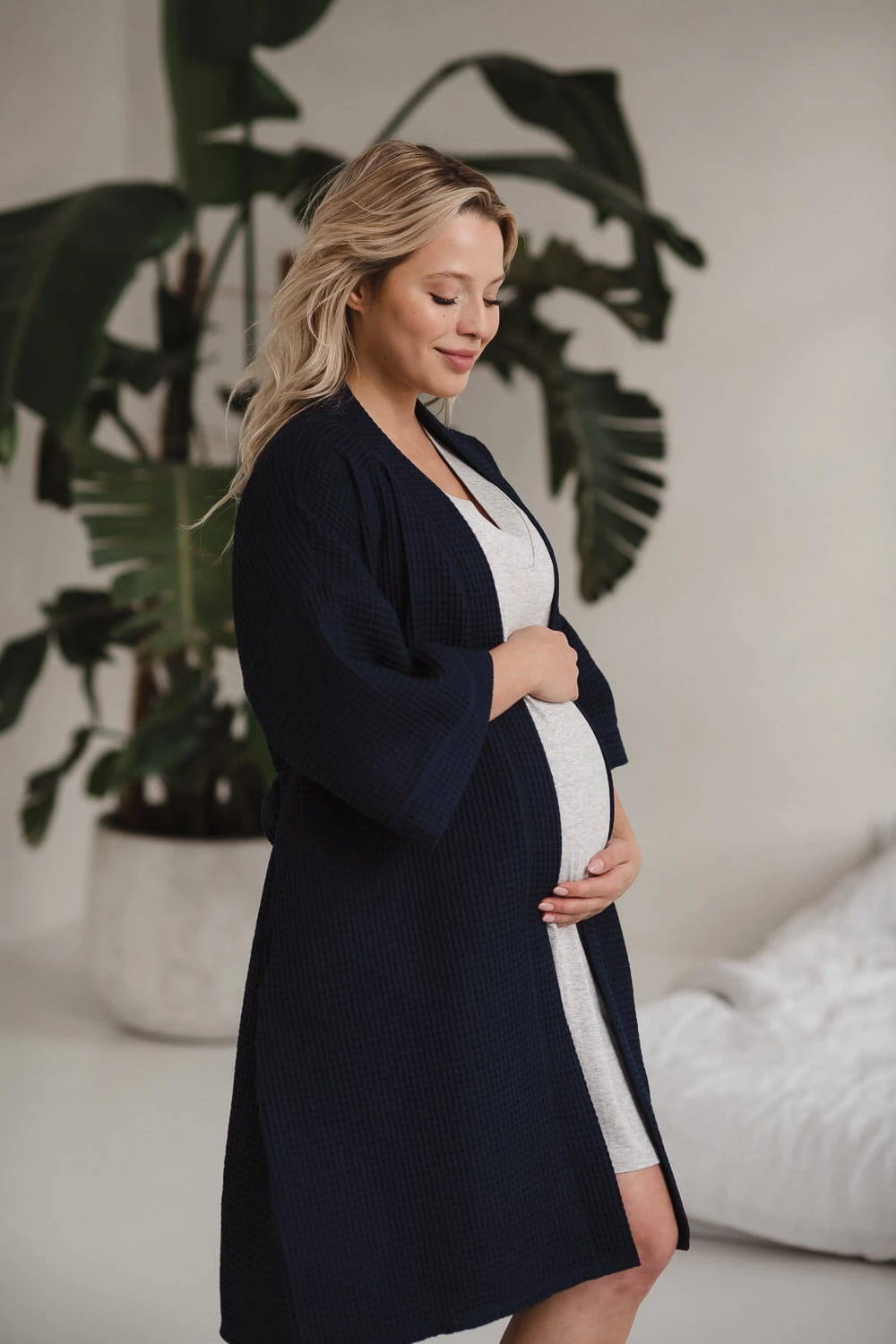 Ciepły szlafrok ciążowy bawełniany wafel granatowy