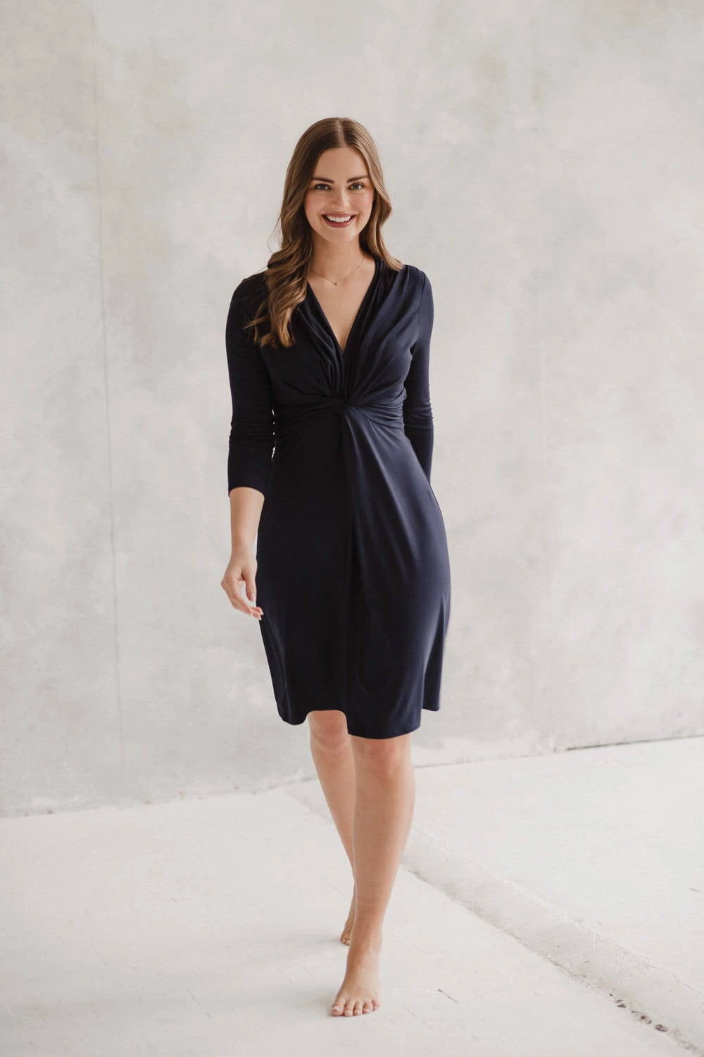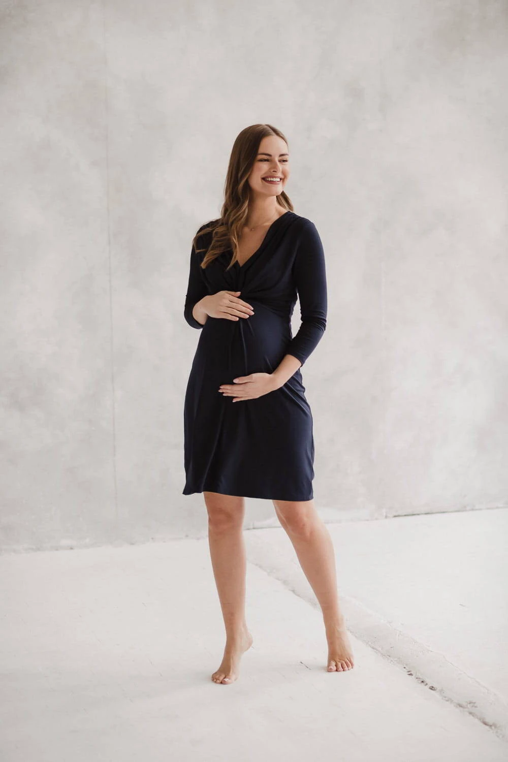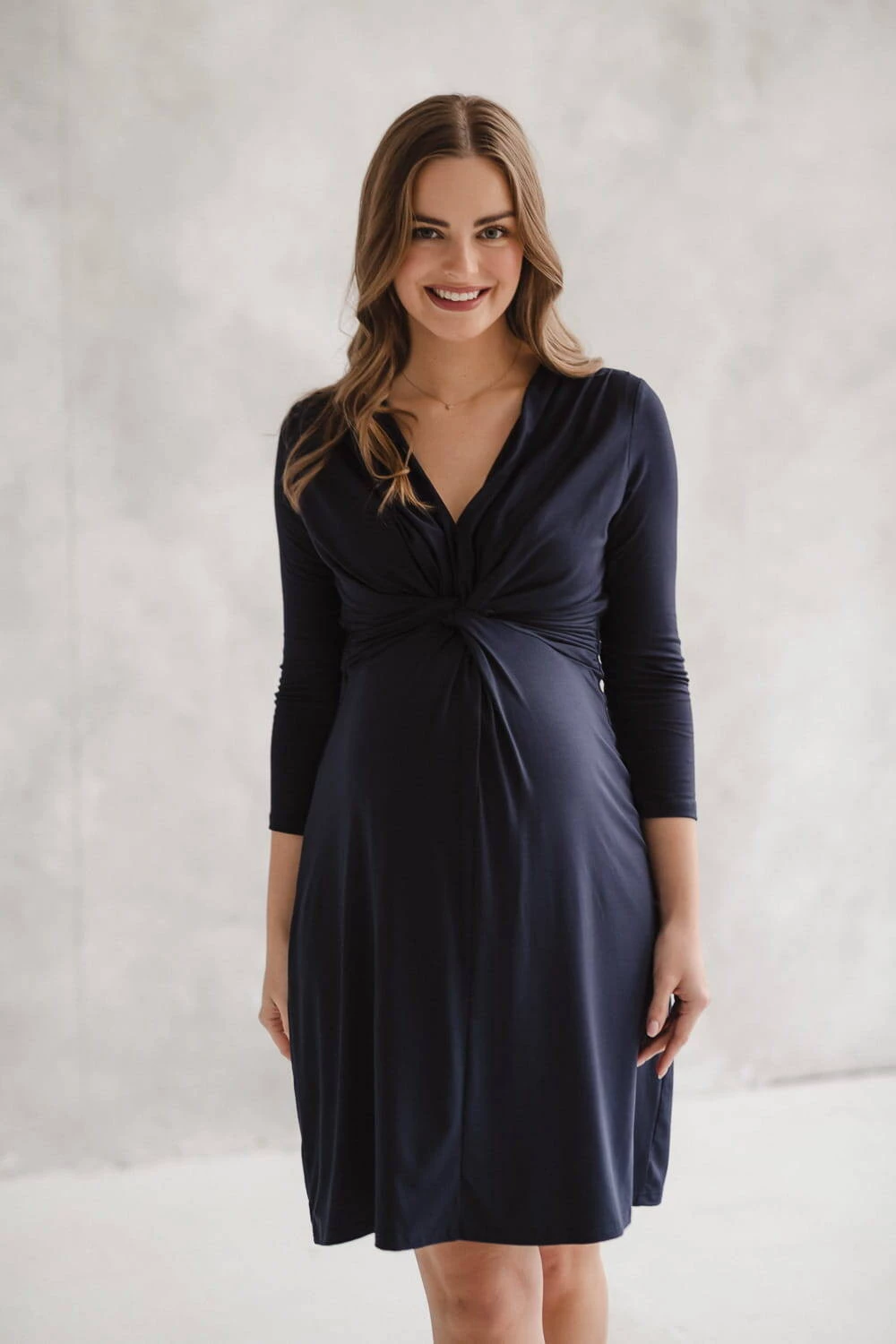 Wysokiej jakości idealna sukienka dla kobiet w ciąży, w granatowym kolorze wykonana z elastycznej wiskozy, która dopasowuje się do rosnącego brzuszka. Sukienka dla przyszłych mam która daje swobodną możliwość karmienia dziecka poprzez odchylenie dekoltu. Ta granatowa niebanalna sukienka ciążowa posiada wszyty pasek, który można idealnie dopasować do figury zarówno w czasie ciąży, jak i po porodzie. Kobieca i modna sukienka ciążowa uszyta z wysokiej jakości wiskozowej dzianiny, z pięknym dekoltem i dekoracyjnym węzłem z przodu, nadającym elegancki i stylowy wygląd przyszłej i młodej mamie. Ta sukienka ciążowa na co dzień i na większe wyjście została wyprodukowana w Polsce z najwyższą starannością. Idealna sukienka do karmienia sprawdzi się w okresie ciąży i połogu