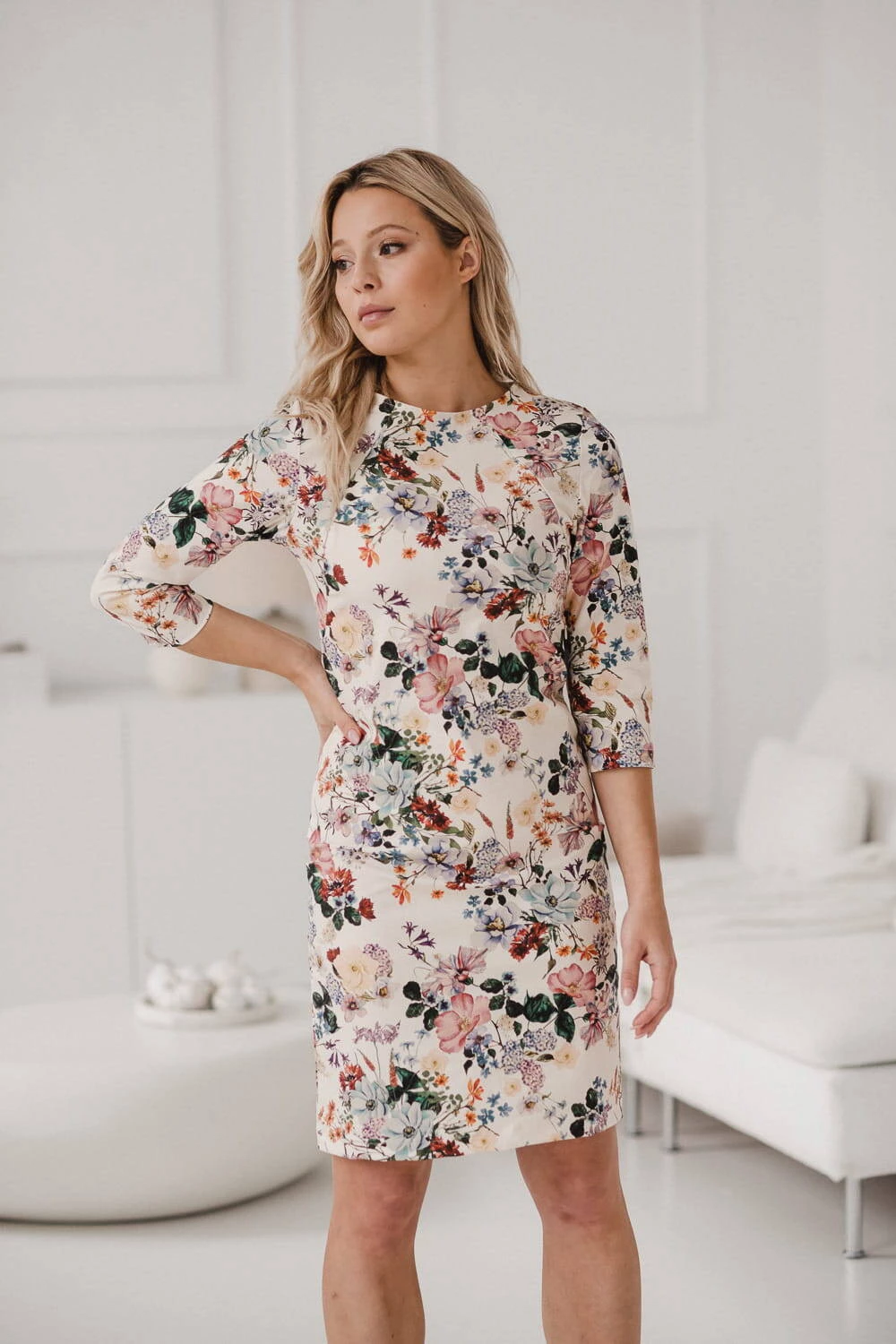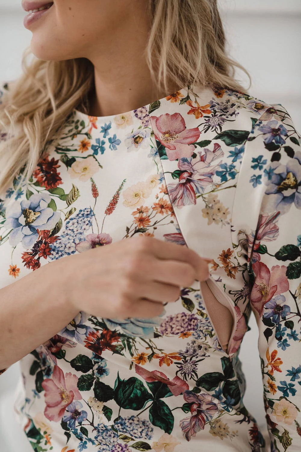 Sukienka do karmienia od marki Milk & Love o klasycznym ołówkowym kroju, w piękne kwiaty na kremowym tle. Kobieca niebanalna sukienka do karmienia to elegancki i wyjątkowy strój stworzony specjalnie dla mam, które chcą być stylowe po okresie ciąży w trakcie karmienia piersią. Sukienka do karmienia została wykonana z wysokiej jakości bawełnianej tkaniny o satynowym wykończeniu z domieszką 5% elastanu, ma wszyte wyjątkowo trwałe, kryte suwaki, które umożliwiają dyskretne karmienie maluszka w każdej sytuacji. Idealna sukienka która dzięki prostemu krojowi dopasuje się do Twojego stylu również po ciąży, kiedy skończysz karmić piersią. Ołówkowy krój sukienki w rumianki pięknie podkreśla kobiece kształty, a materiał, który przeszedł rygorystyczne testy Oeko-Tex Standard 100, zachowuje swój niezmieniony kształt i kolor nawet po wielu praniach. Nasza sukienka Milky Classic została uszyta w Polsce, i może być doskonałym wyborem na specjalne okazje, takie jak chrzciny, wesele czy inne ważne wydarzenie w waszym życiu . Długość rękawów 3/4 zapewnia wygodę, i ładnie wyeksponuje kobiece dłonie.