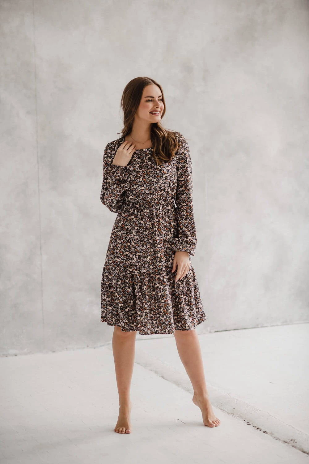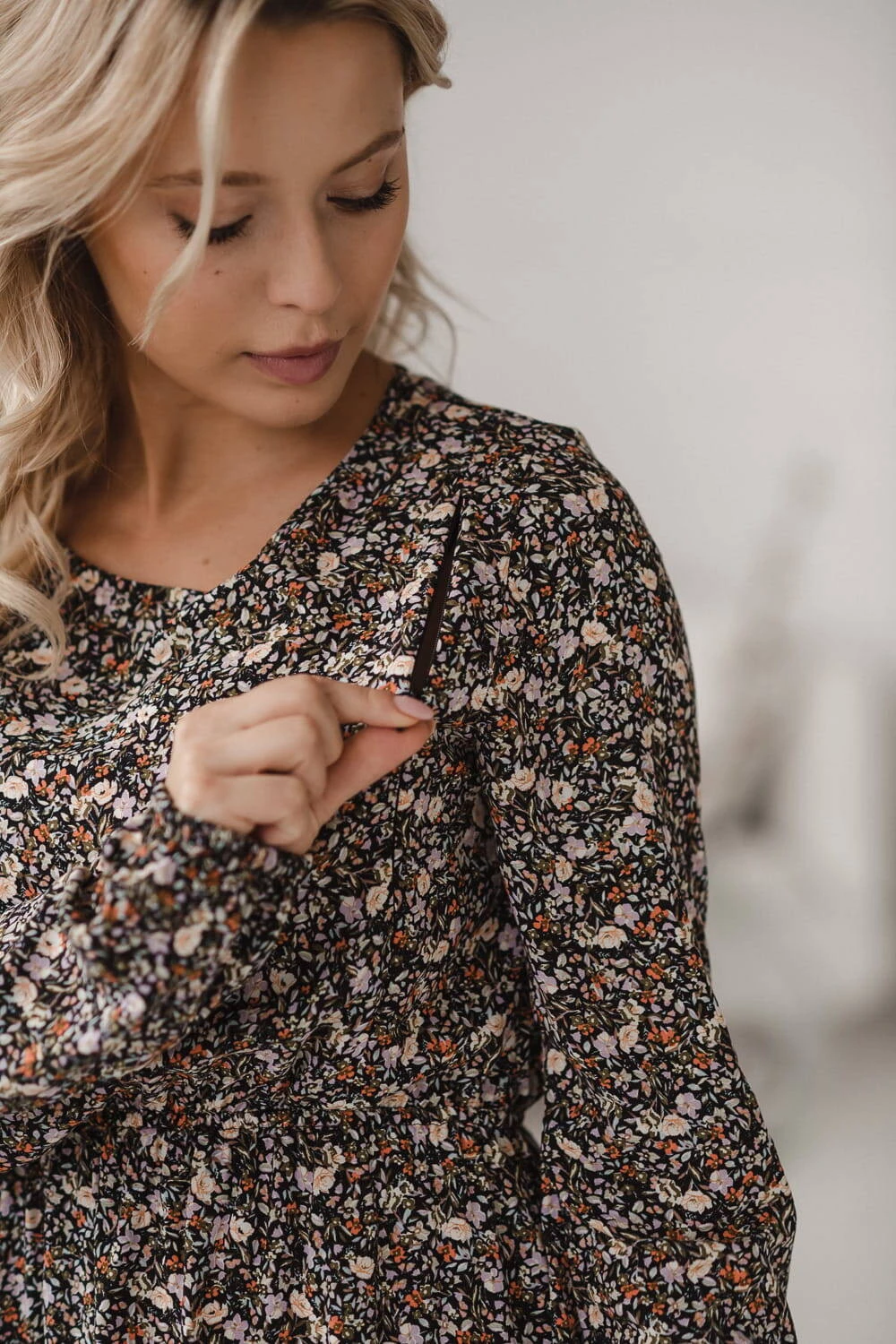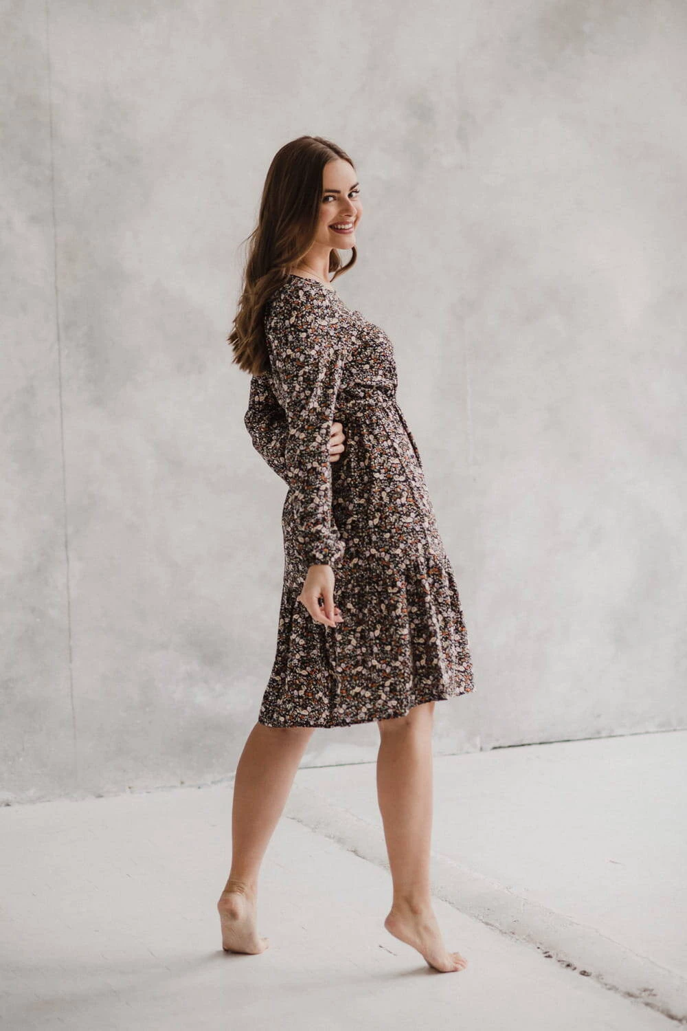 Sukienka od marki Milk & Love w niebanalny print kwiatuszków na czarnym tle, wykończona falbanką. Całość o długości midi. Idealna sukienka przeznaczona do noszenia w okresie ciąży. Z powodu jej wyjątkowo funkcjonalnego fasonu i kolorów ta niebanalna sukienka ciążowa, sprawdzi się również kiedy już skończysz ciążową przygodę. Luźna sukienka dla kobiet w ciąży posiada elastyczną delikatną gumkę pod biustem, co sprawia, że idealnie dopasowuje się zarówno do brzuszka w ciąży, jak i po porodzie. Komfort przyszłej mamy w tym modelu zapewnia wysokiej jakości 100% tkanina wiskozowa w jesienne kwiaty. Sukienki na czas ciąży mają wszyte ukryte zamki, które po zakończeniu okresu karmienia można schować do środka, aby dalej korzystać z sukienki w standardowy sposób. Kwiatowa Lovely Dress to idealny model sukienki dla przyszłych mam dostępny w naszym sklepie internetowym również w innych modnych kolorach.