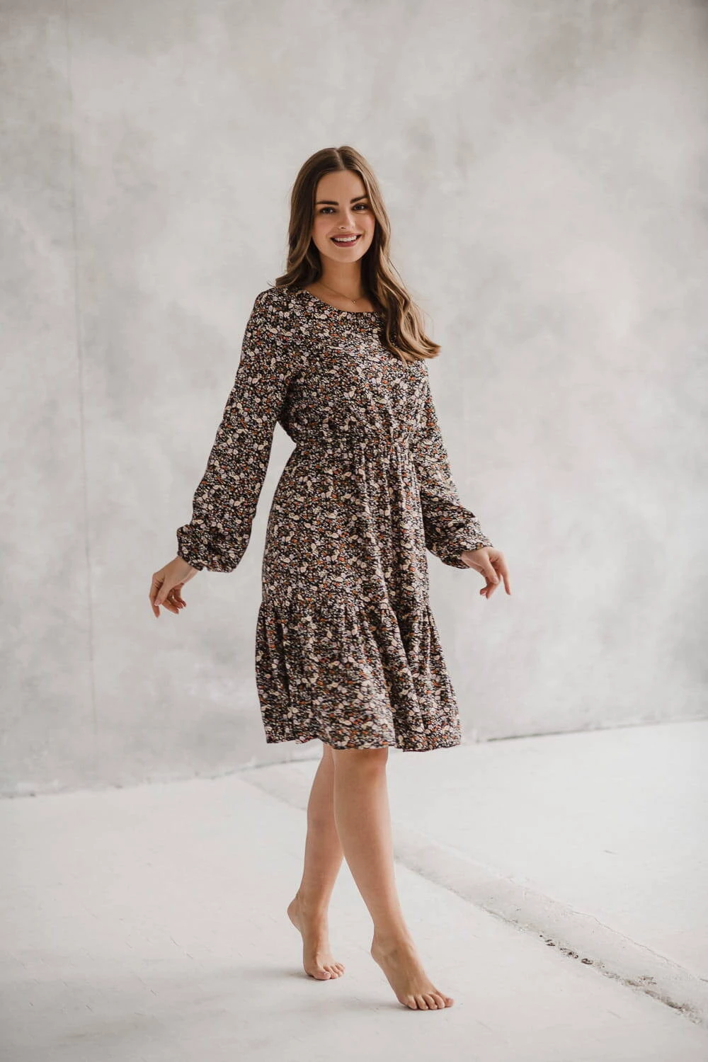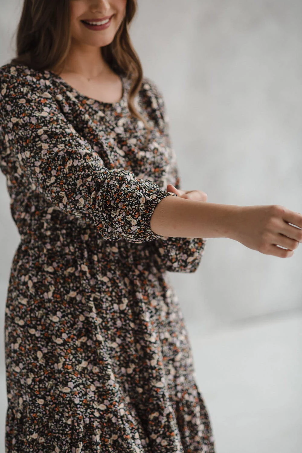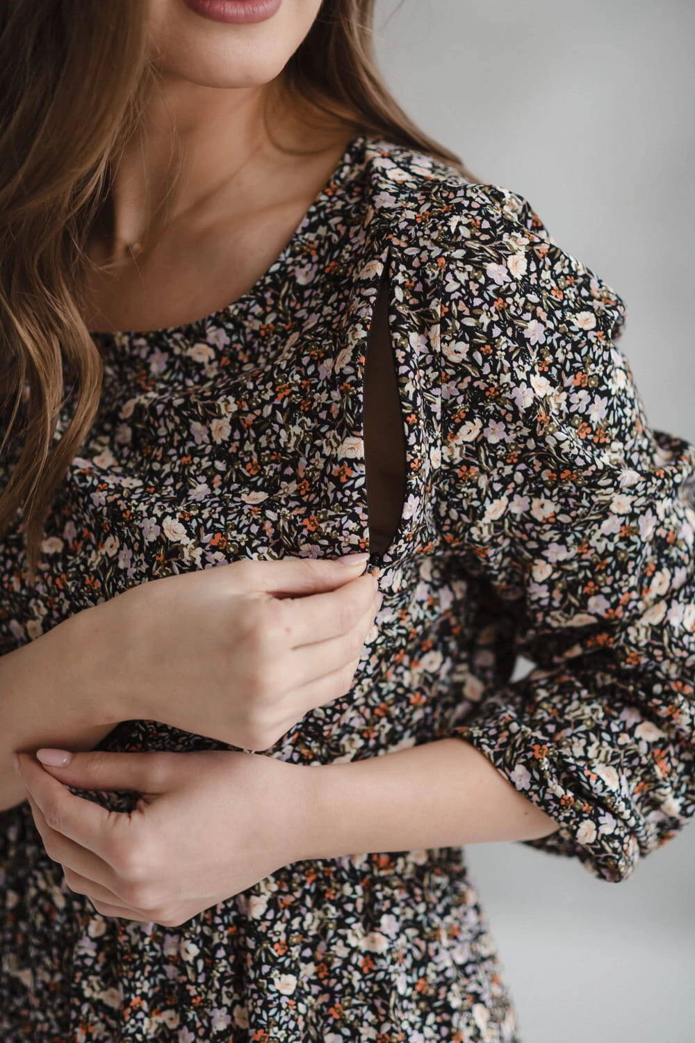 Sukienka od marki Milk & Love w niebanalny print kwiatuszków na czarnym tle, wykończona falbanką. Całość o długości midi. Idealna sukienka przeznaczona do noszenia w okresie ciąży. Z powodu jej wyjątkowo funkcjonalnego fasonu i kolorów ta niebanalna sukienka ciążowa, sprawdzi się również kiedy już skończysz ciążową przygodę. Luźna sukienka dla kobiet w ciąży posiada elastyczną delikatną gumkę pod biustem, co sprawia, że idealnie dopasowuje się zarówno do brzuszka w ciąży, jak i po porodzie. Komfort przyszłej mamy w tym modelu zapewnia wysokiej jakości 100% tkanina wiskozowa w jesienne kwiaty. Sukienki na czas ciąży mają wszyte ukryte zamki, które po zakończeniu okresu karmienia można schować do środka, aby dalej korzystać z sukienki w standardowy sposób. Kwiatowa Lovely Dress to idealny model sukienki dla przyszłych mam dostępny w naszym sklepie internetowym również w innych modnych kolorach.
