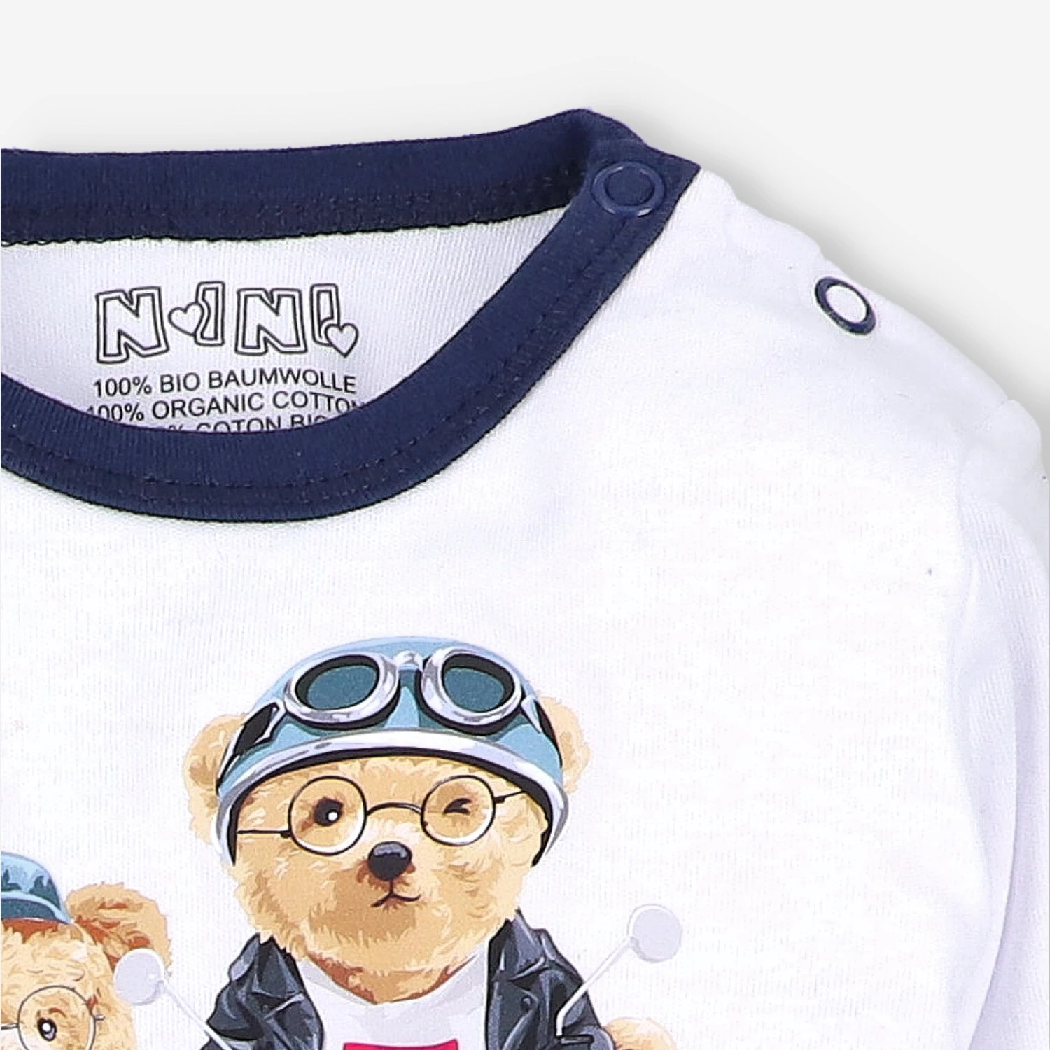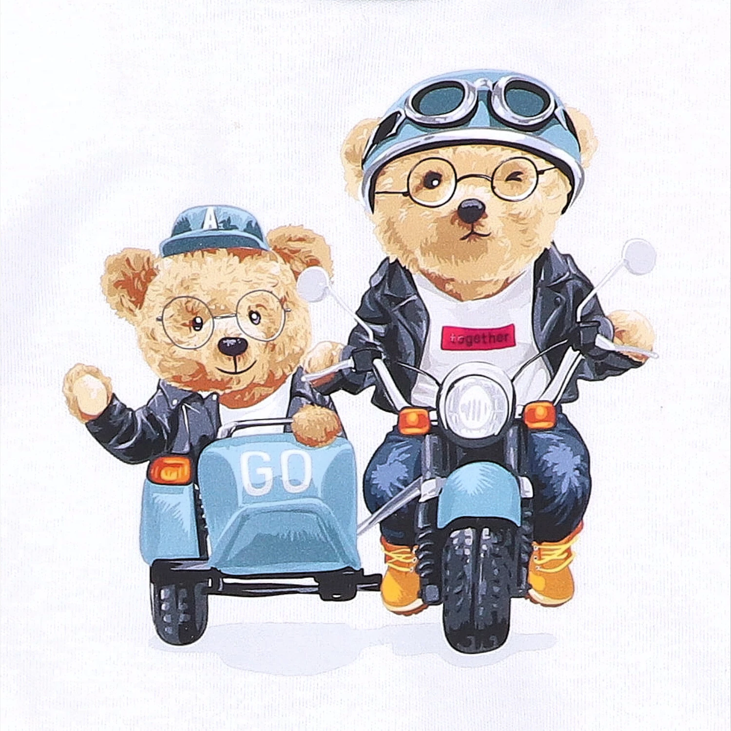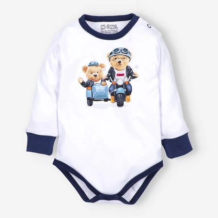 Białe body niemowlęce MISIE NA MOTORZE z bawełny organicznej dla chłopca